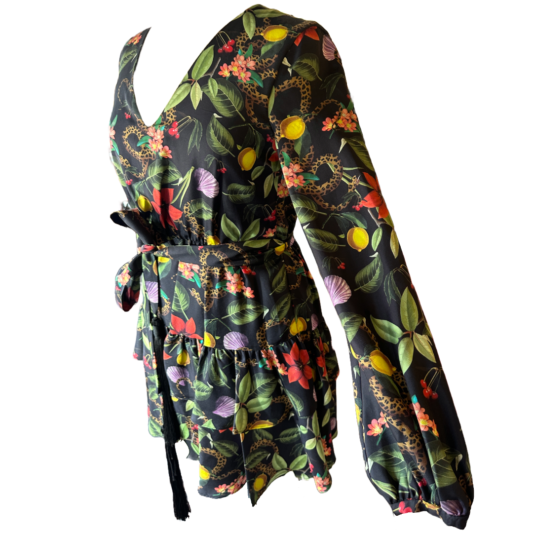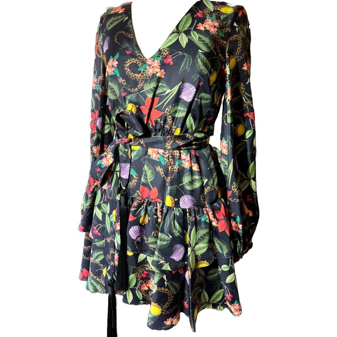 The Borgo de Nor Floral Dress features a vibrant tropical jungle print, offering a bold and exotic flair that's perfect for making a statement. Designed with wrap-around ties that cinch the waist, this dress creates a flattering and customizable fit. The ties are finished with playful black tassels, adding a fun and edgy detail to the sophisticated silhouette.
