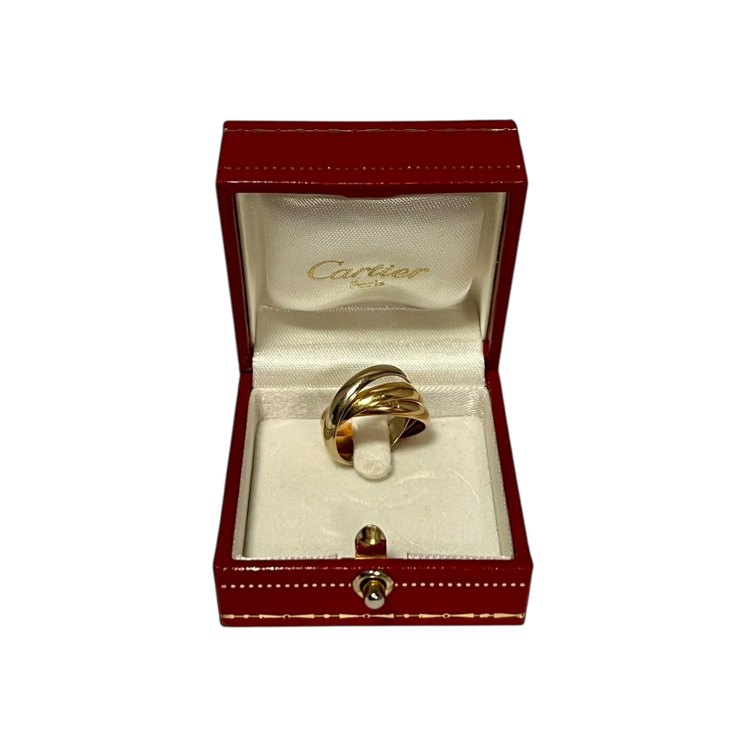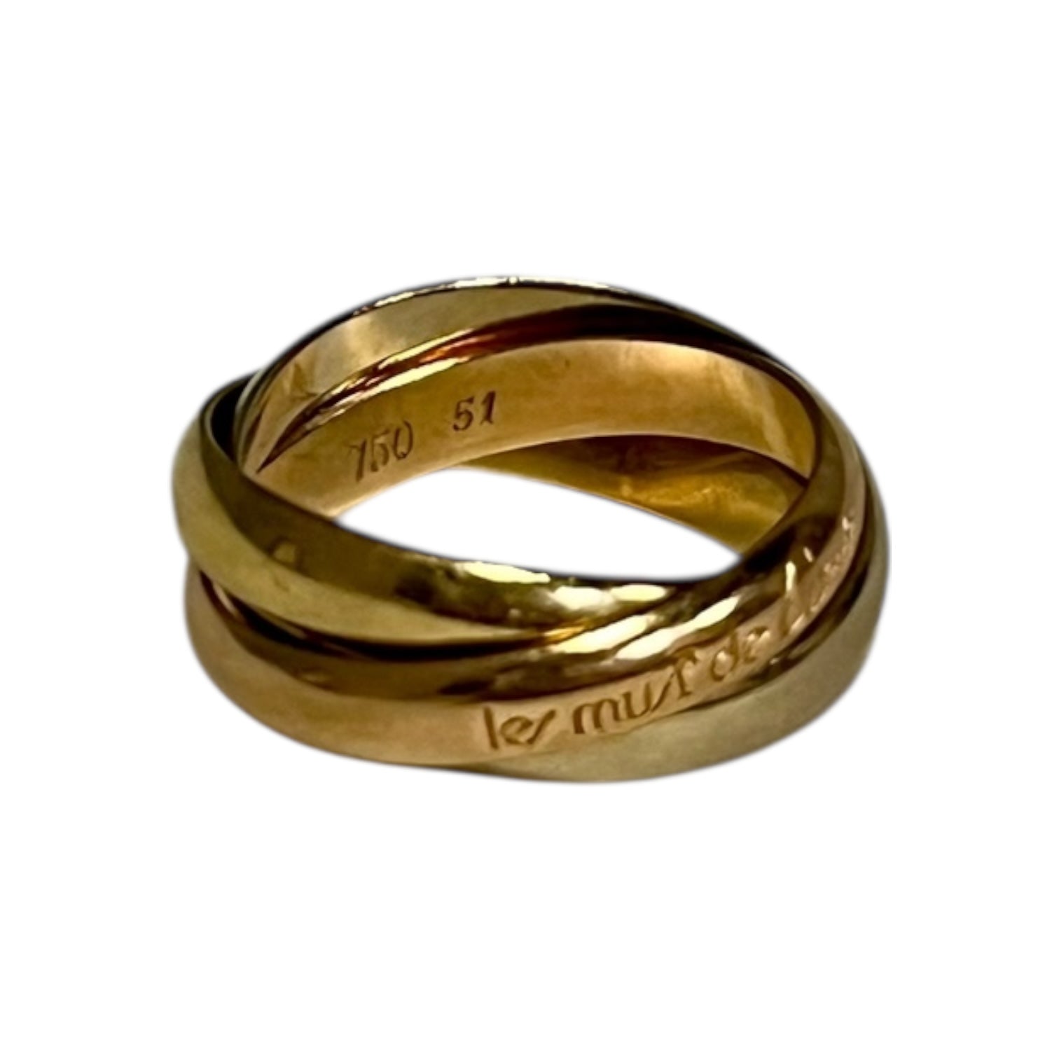 This is an authentic CARTIER Trinity Ring in 18K white gold, 18K yellow gold, and 18K rose gold.