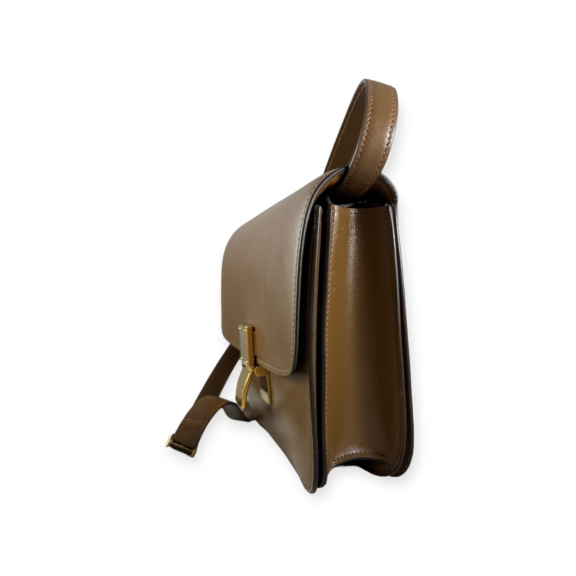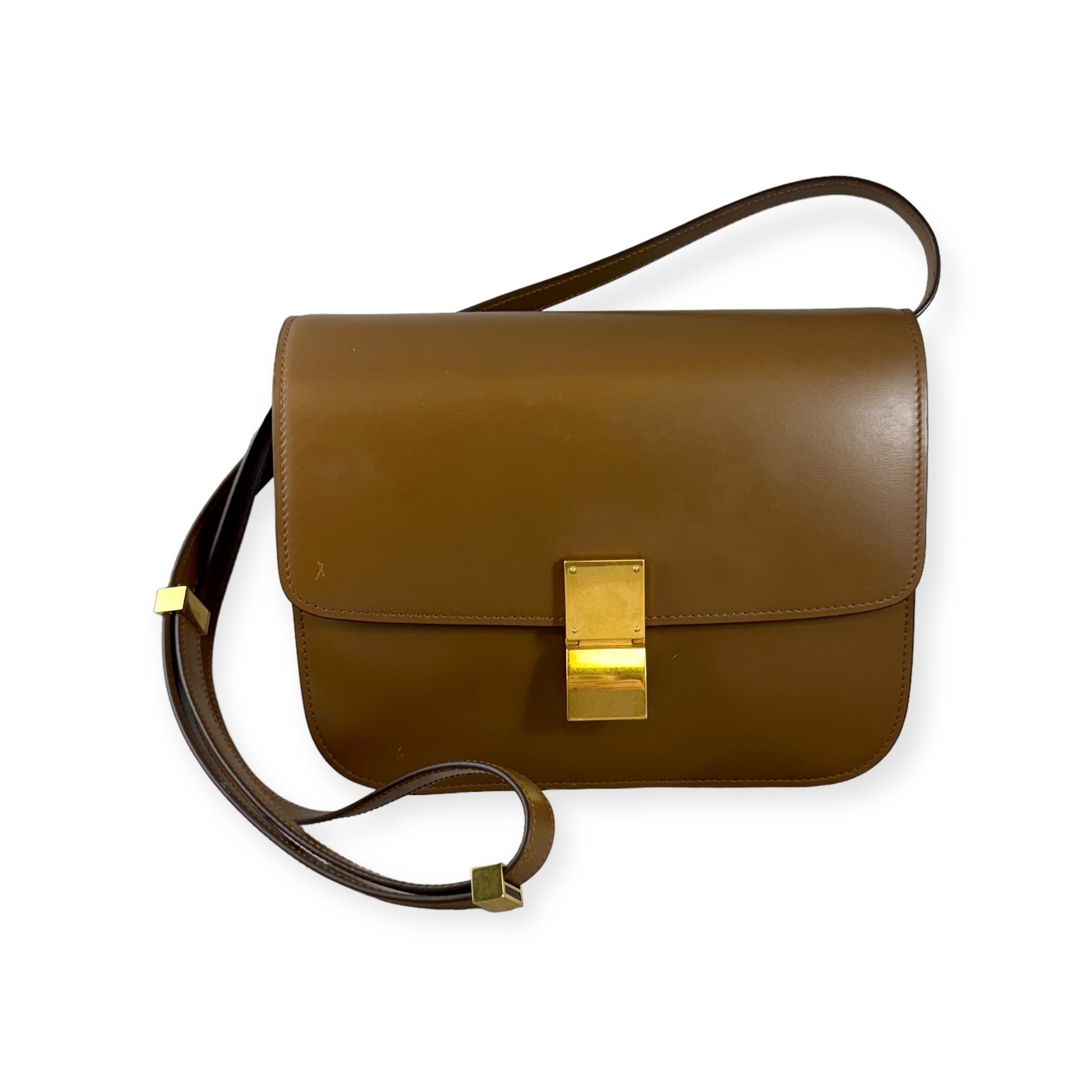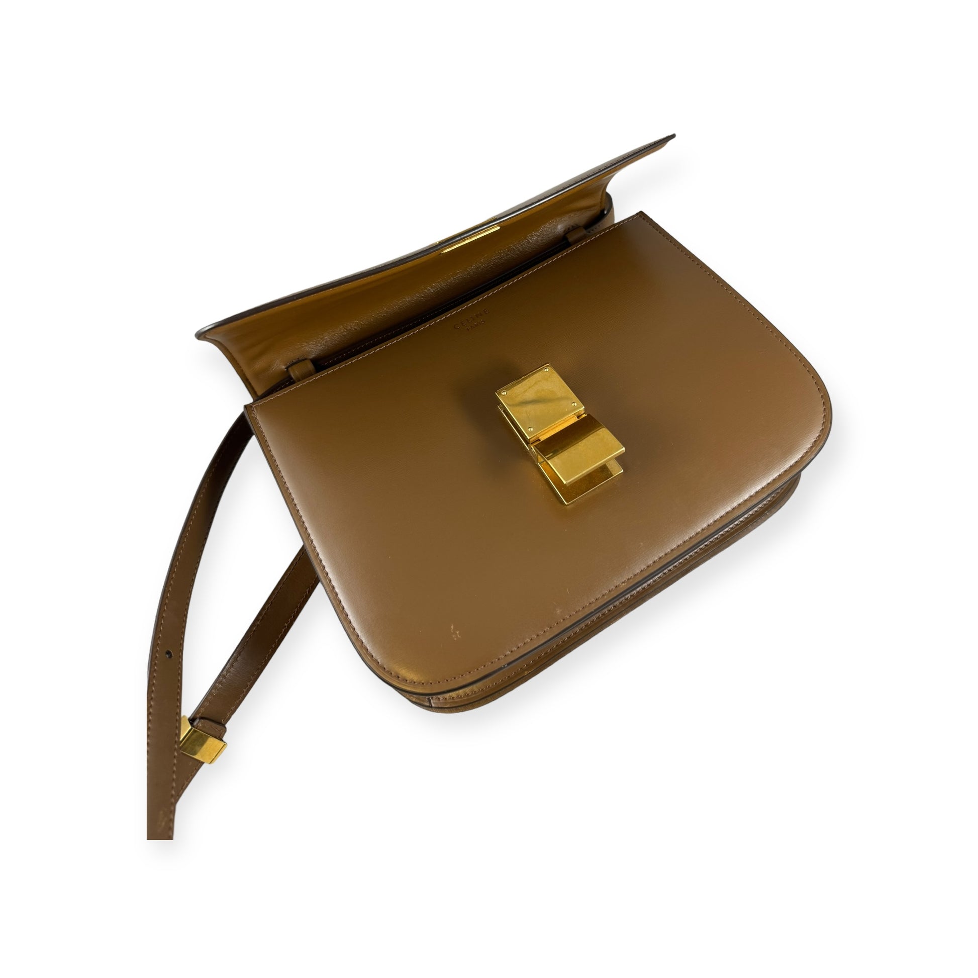 This is an authentic CELINE Classic Box Shoulder Bag in Brown. This shoulder bag is crafted of smooth calfskin leather with gold-toned hardware. It fetaures an adjustable shoulder strap, a front crossover flap with a press-lock closure, and a matching brown leather interior.