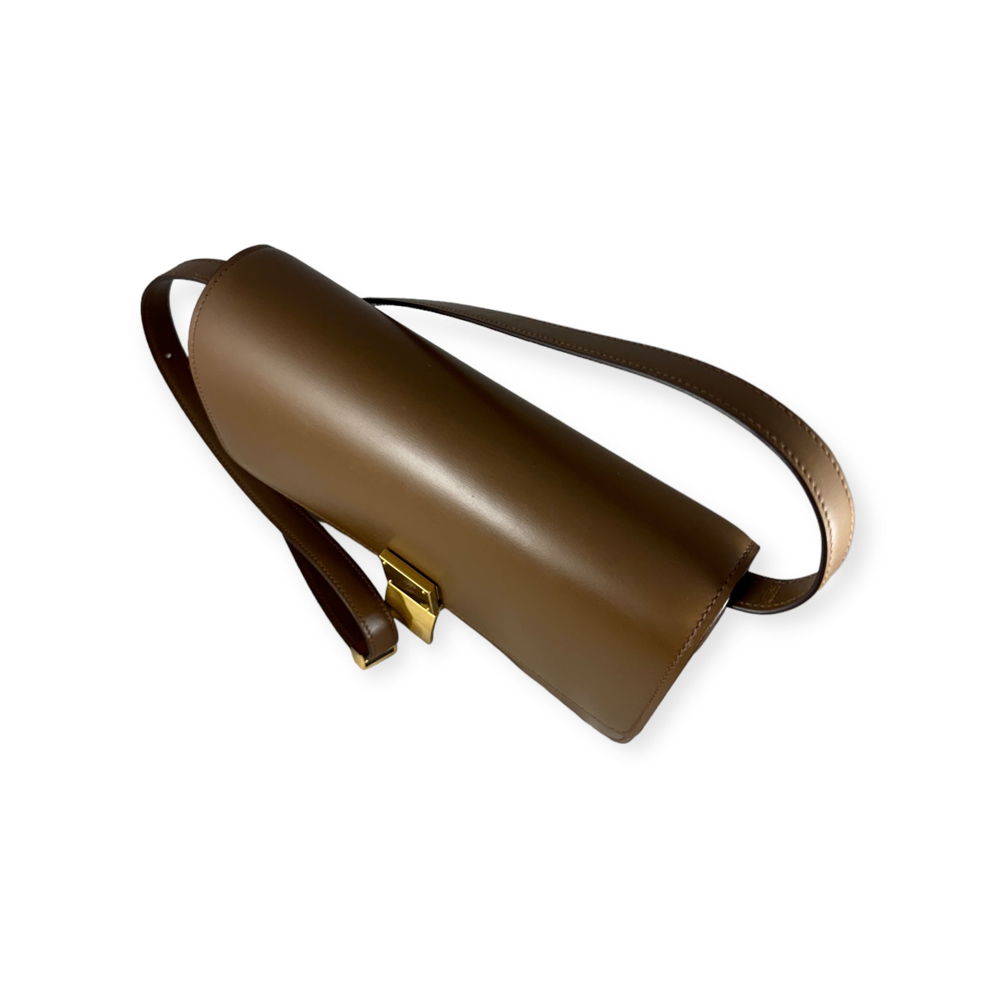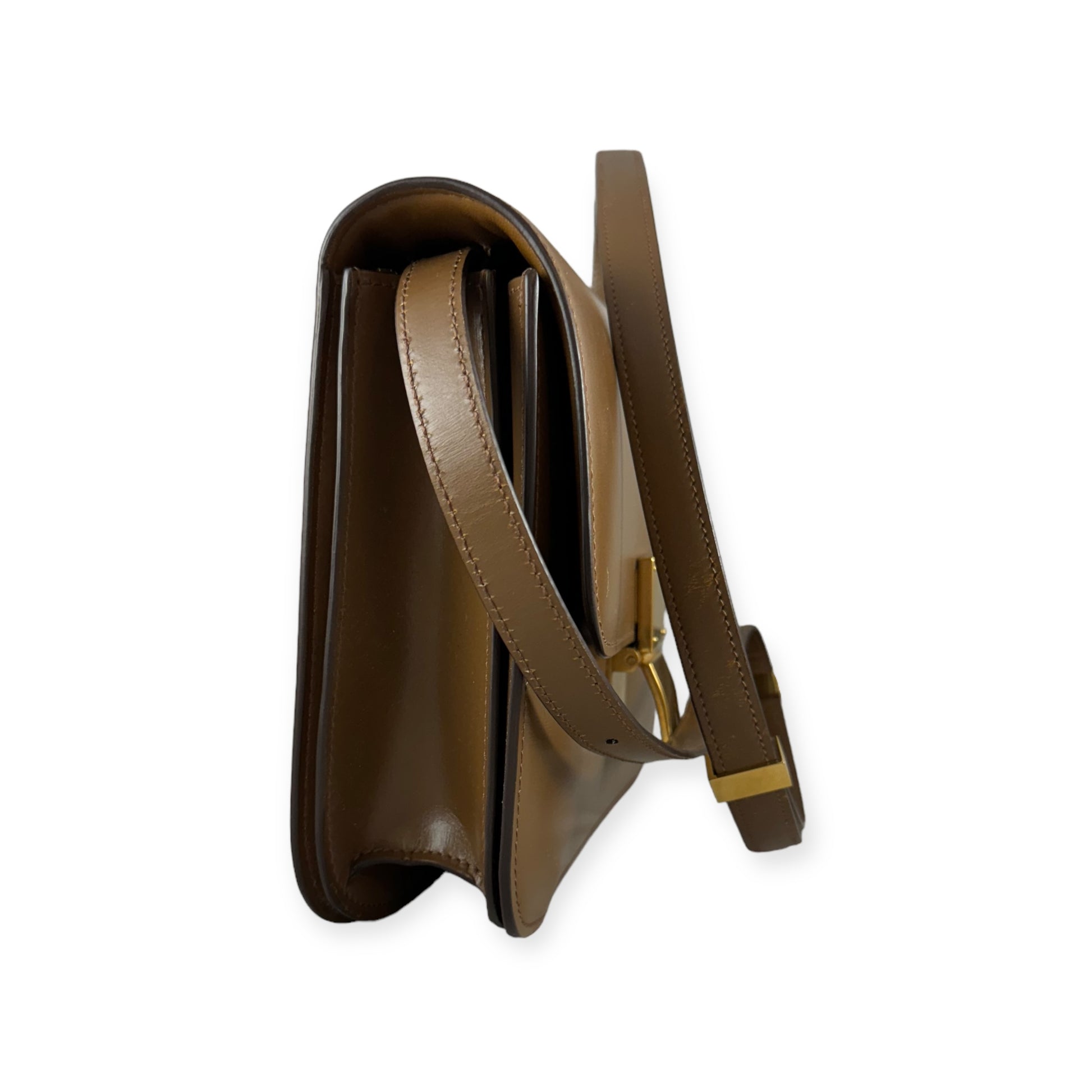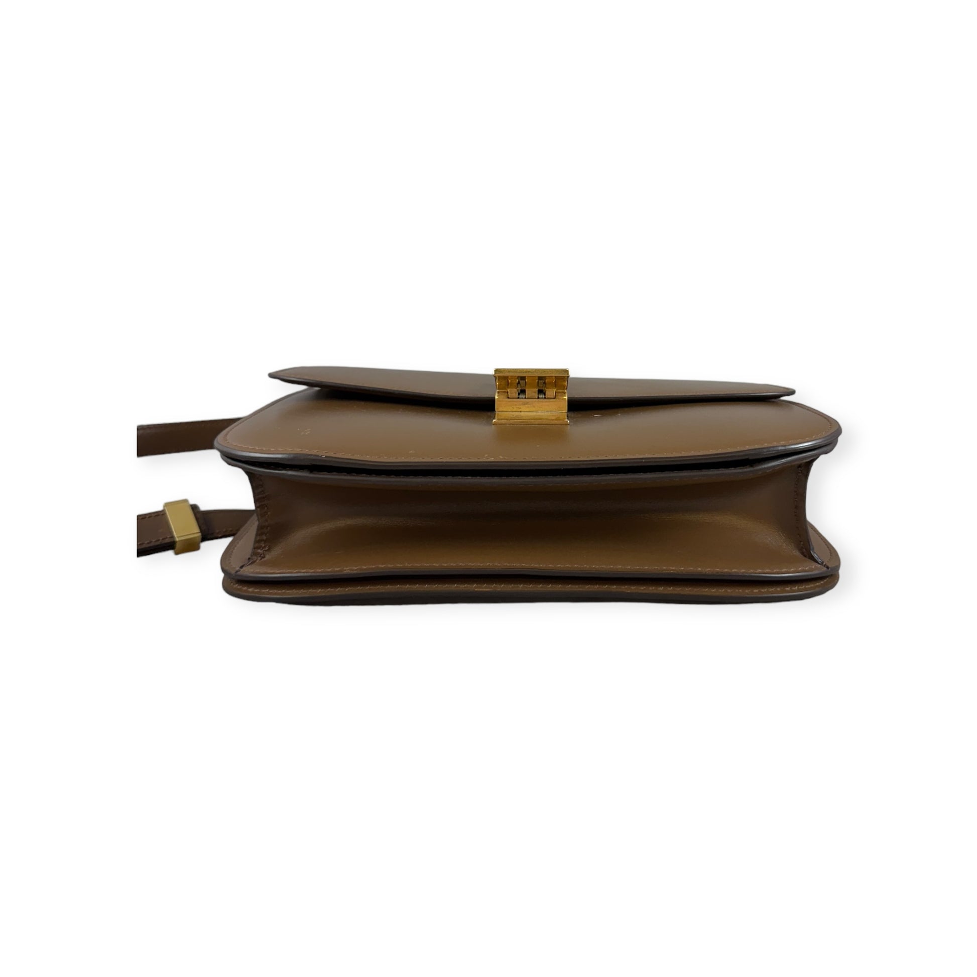 This is an authentic CELINE Classic Box Shoulder Bag in Brown. This shoulder bag is crafted of smooth calfskin leather with gold-toned hardware. It fetaures an adjustable shoulder strap, a front crossover flap with a press-lock closure, and a matching brown leather interior.