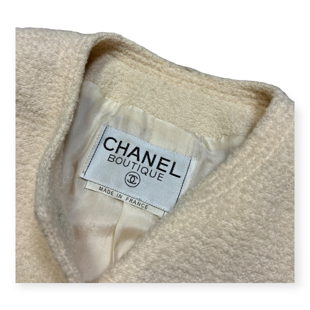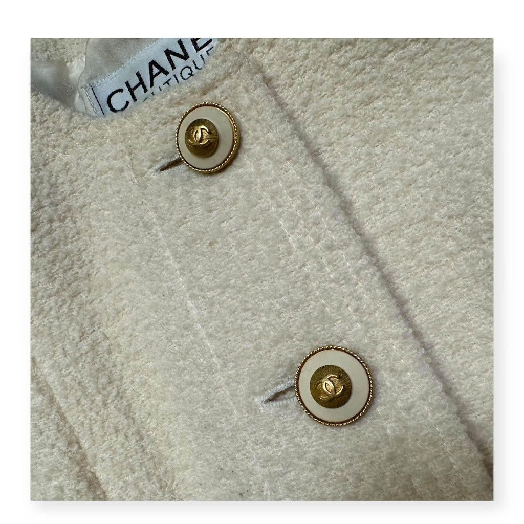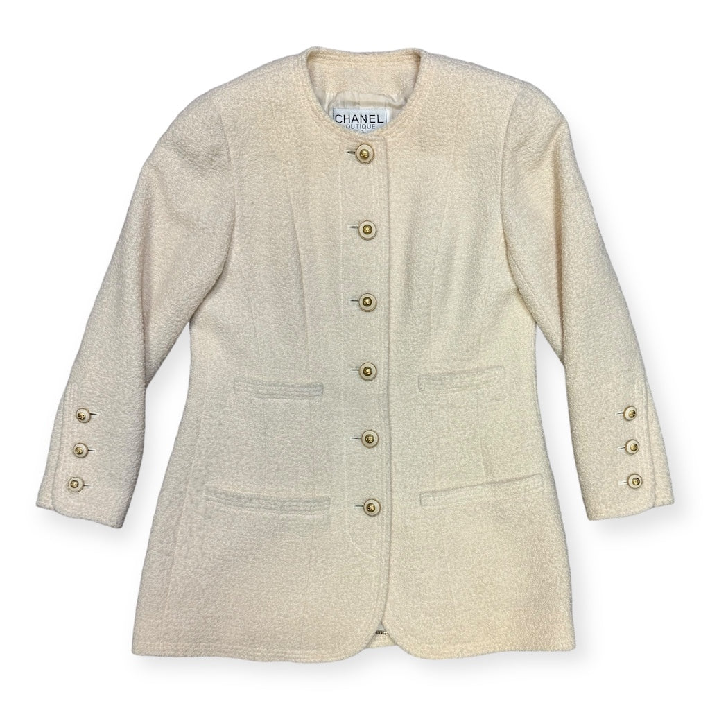 This is an authentic CHANEL Boucle Jacket in Ivory. This jacket is crafted of a luxurious knit blend with silk lining and gold-toned hardware. It features a jewel neck, long sleeves with a three button closure, four front pockets, and a front button closure.