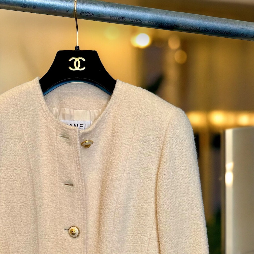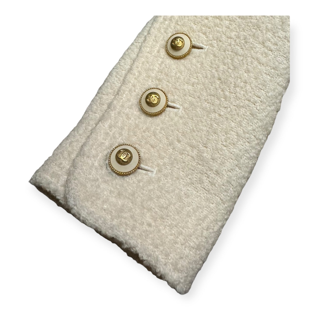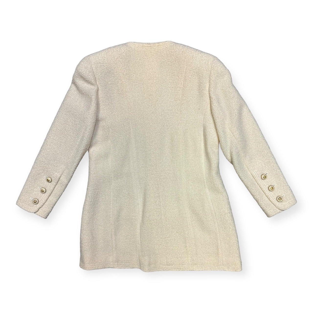 This is an authentic CHANEL Boucle Jacket in Ivory. This jacket is crafted of a luxurious knit blend with silk lining and gold-toned hardware. It features a jewel neck, long sleeves with a three button closure, four front pockets, and a front button closure.