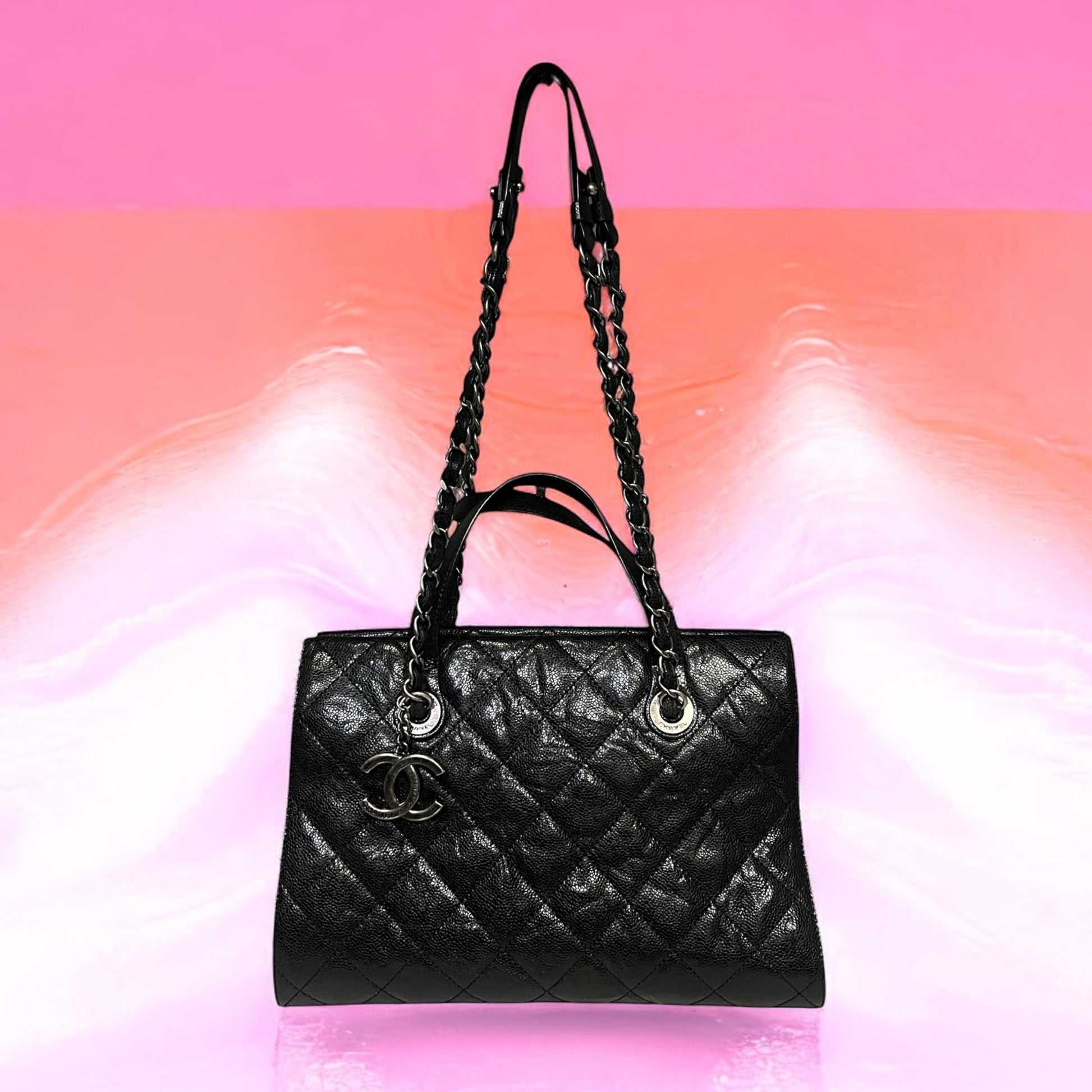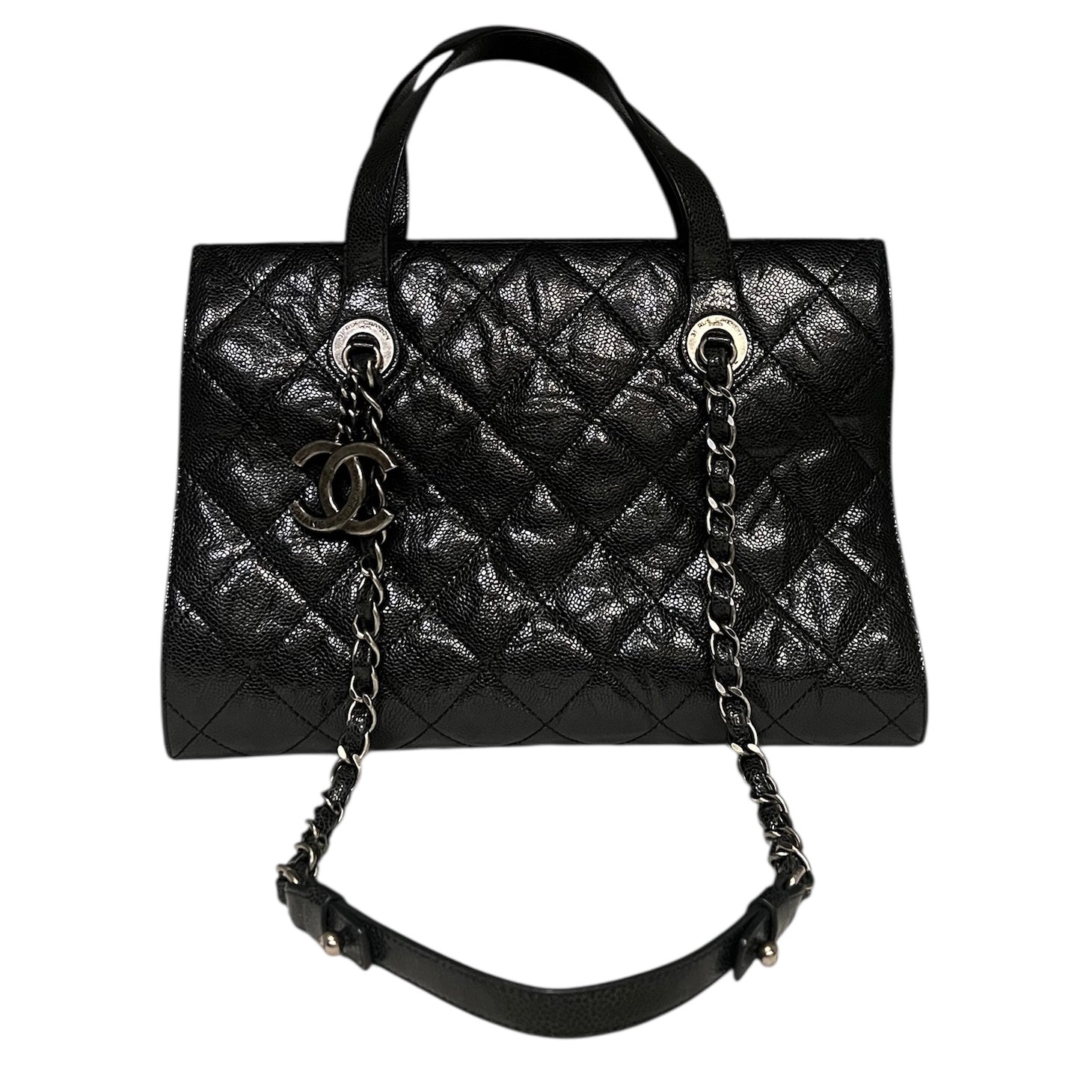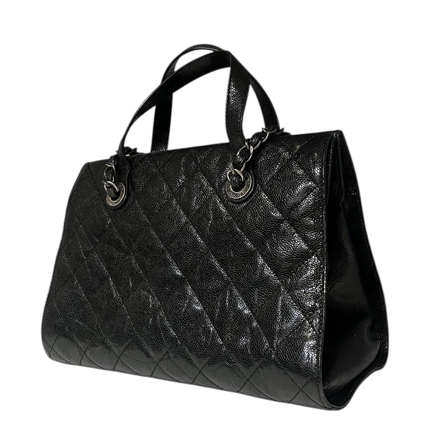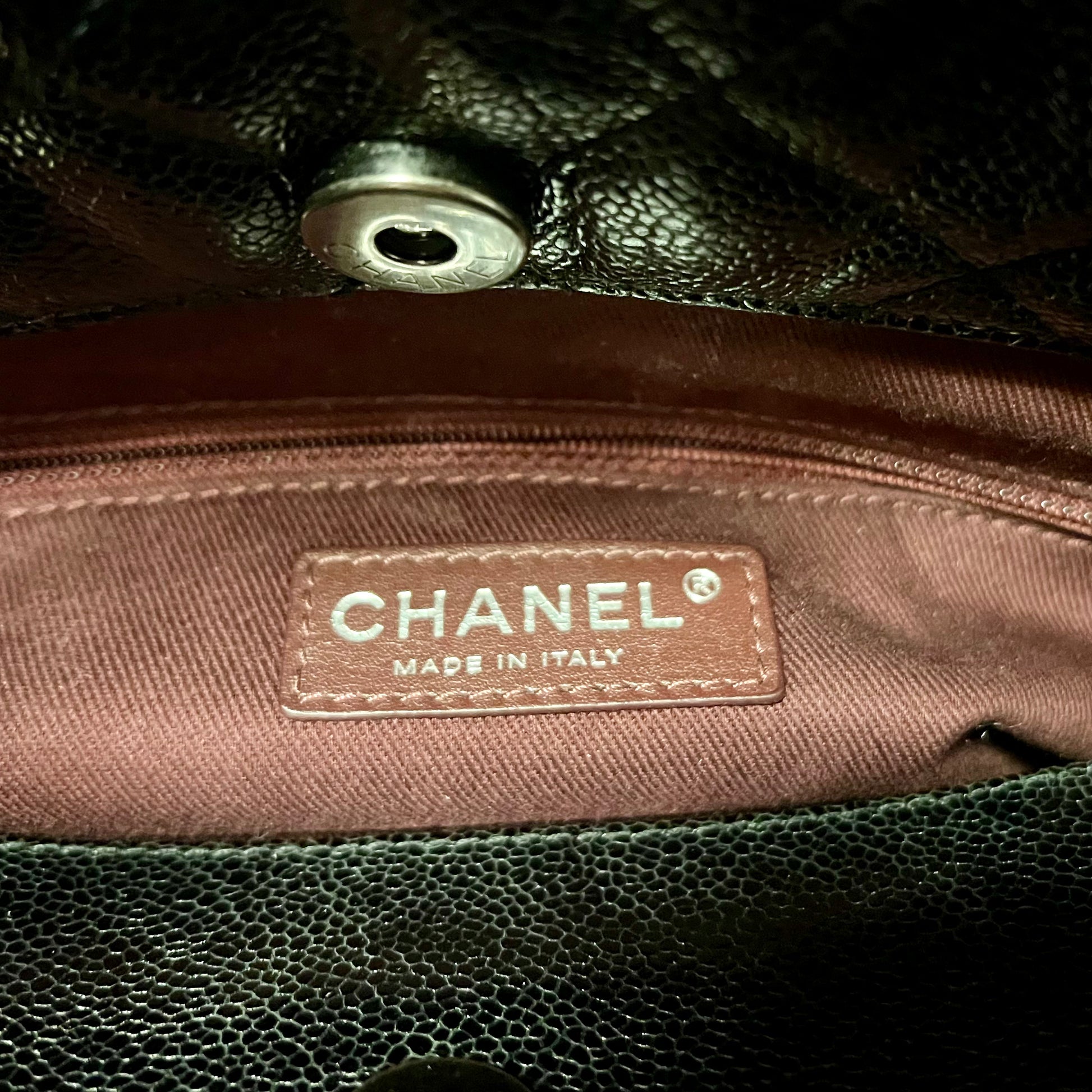 This authentic CHANEL CC Crave Top Handle Shoulder Bag in diamond quilted caviar leather with ruthenium hardware features two top handles, two classic chain shoulder straps embellished with the CC charm, magnetic snap closure, two gusseted interior compartments divided by one zipper compartment, burgundy fabric interior lining, two large flat open interior pockets, two smaller open interior pockets, one zipper interior pocket, and four base studs.
