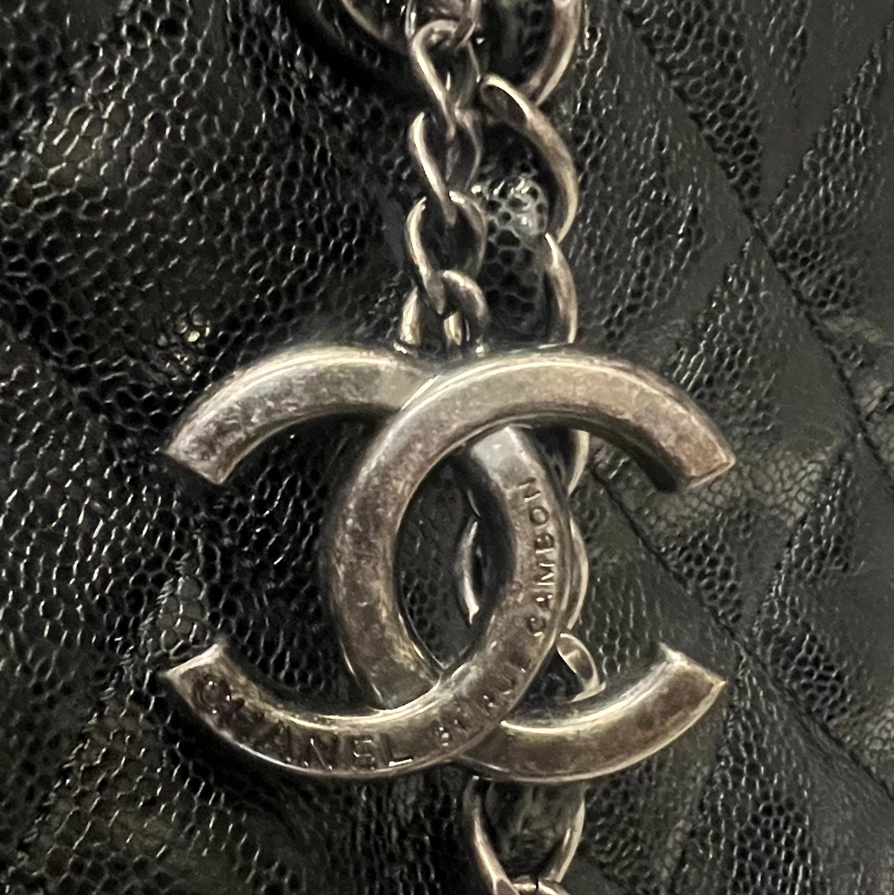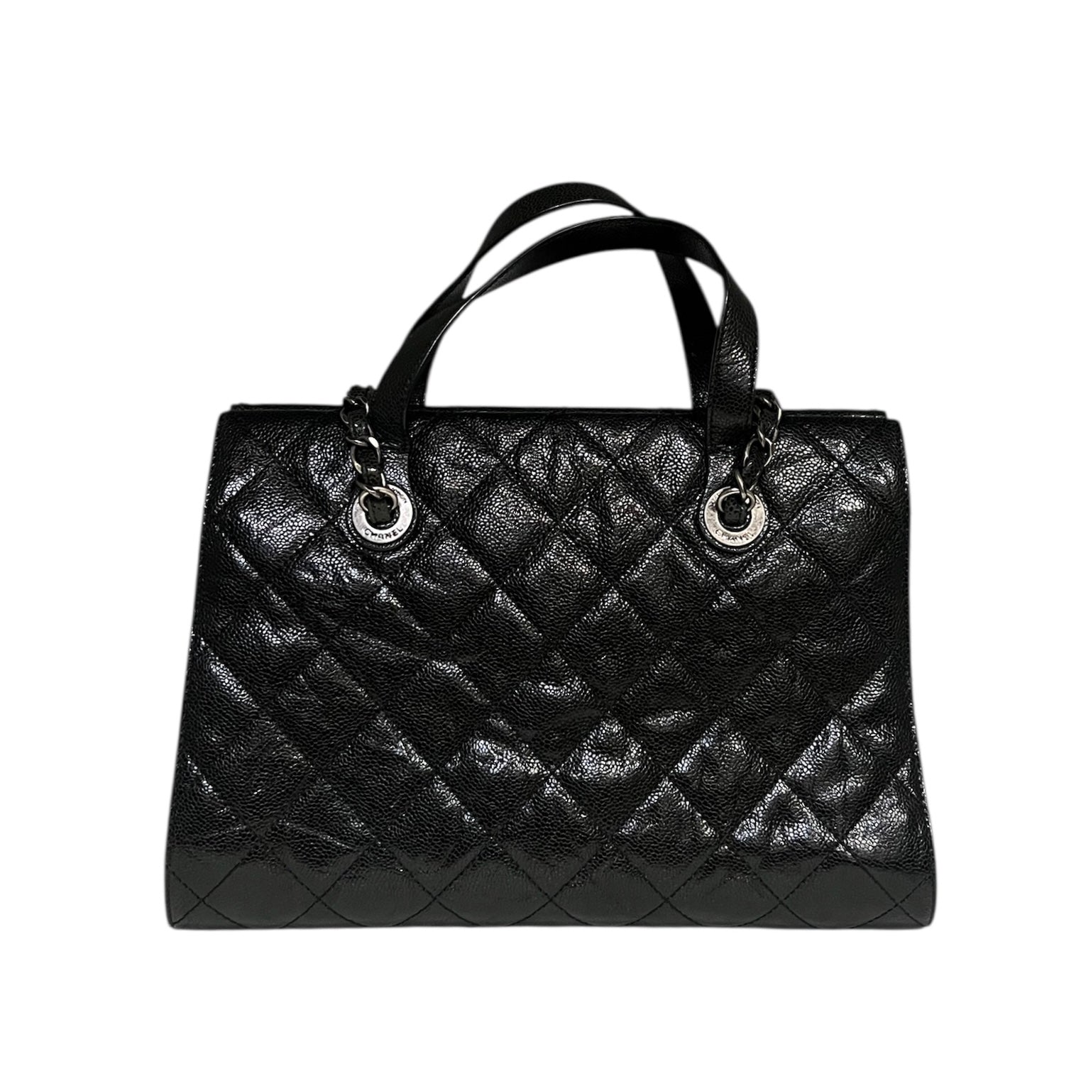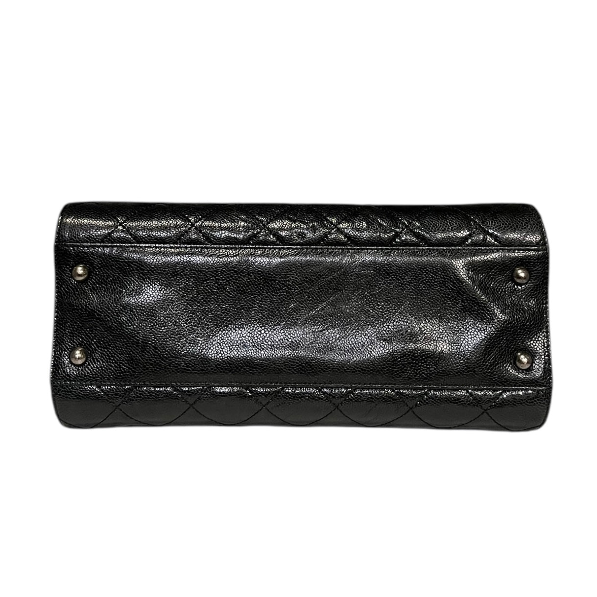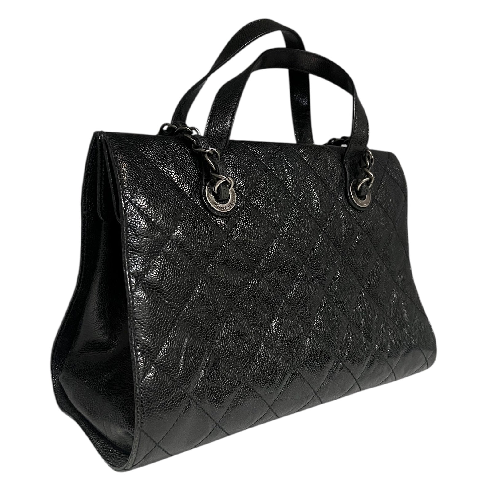 This authentic CHANEL CC Crave Top Handle Shoulder Bag in diamond quilted caviar leather with ruthenium hardware features two top handles, two classic chain shoulder straps embellished with the CC charm, magnetic snap closure, two gusseted interior compartments divided by one zipper compartment, burgundy fabric interior lining, two large flat open interior pockets, two smaller open interior pockets, one zipper interior pocket, and four base studs.