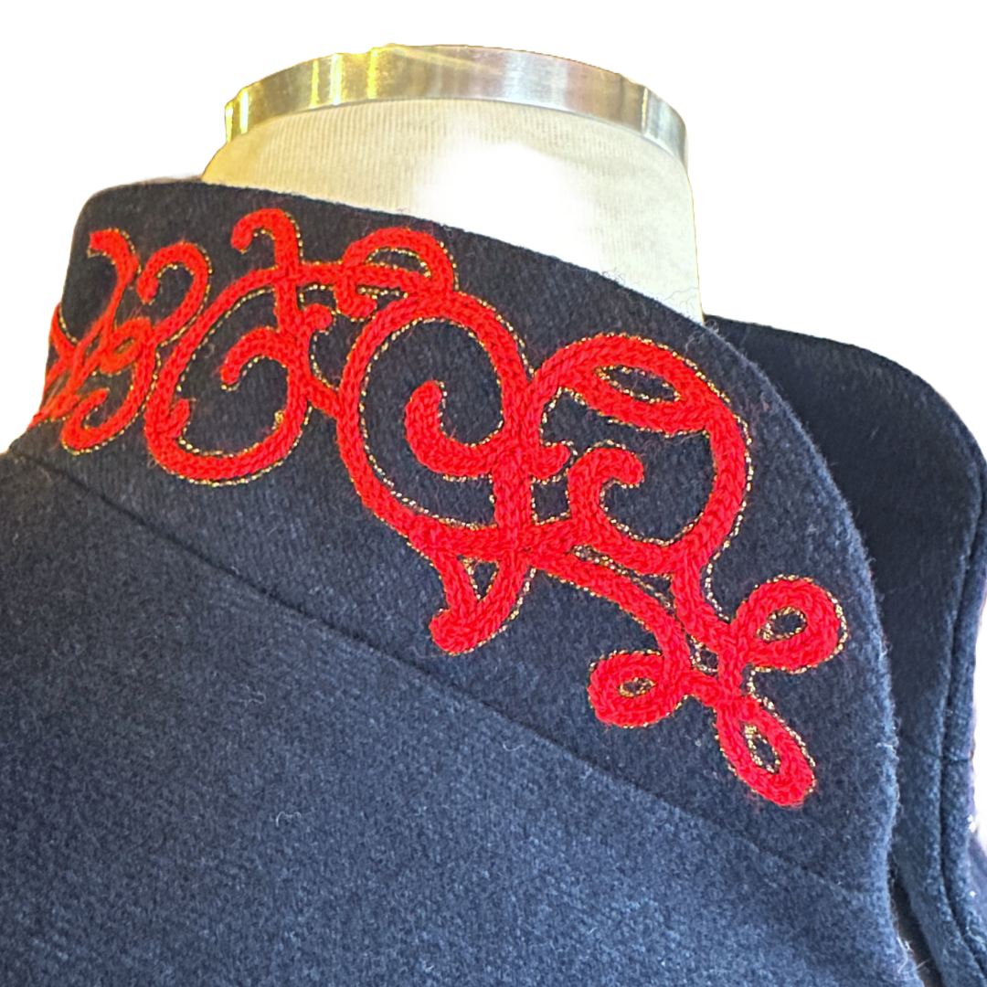 Design: Stand-up collar, embellished with red appliqué designs and gold stitching.