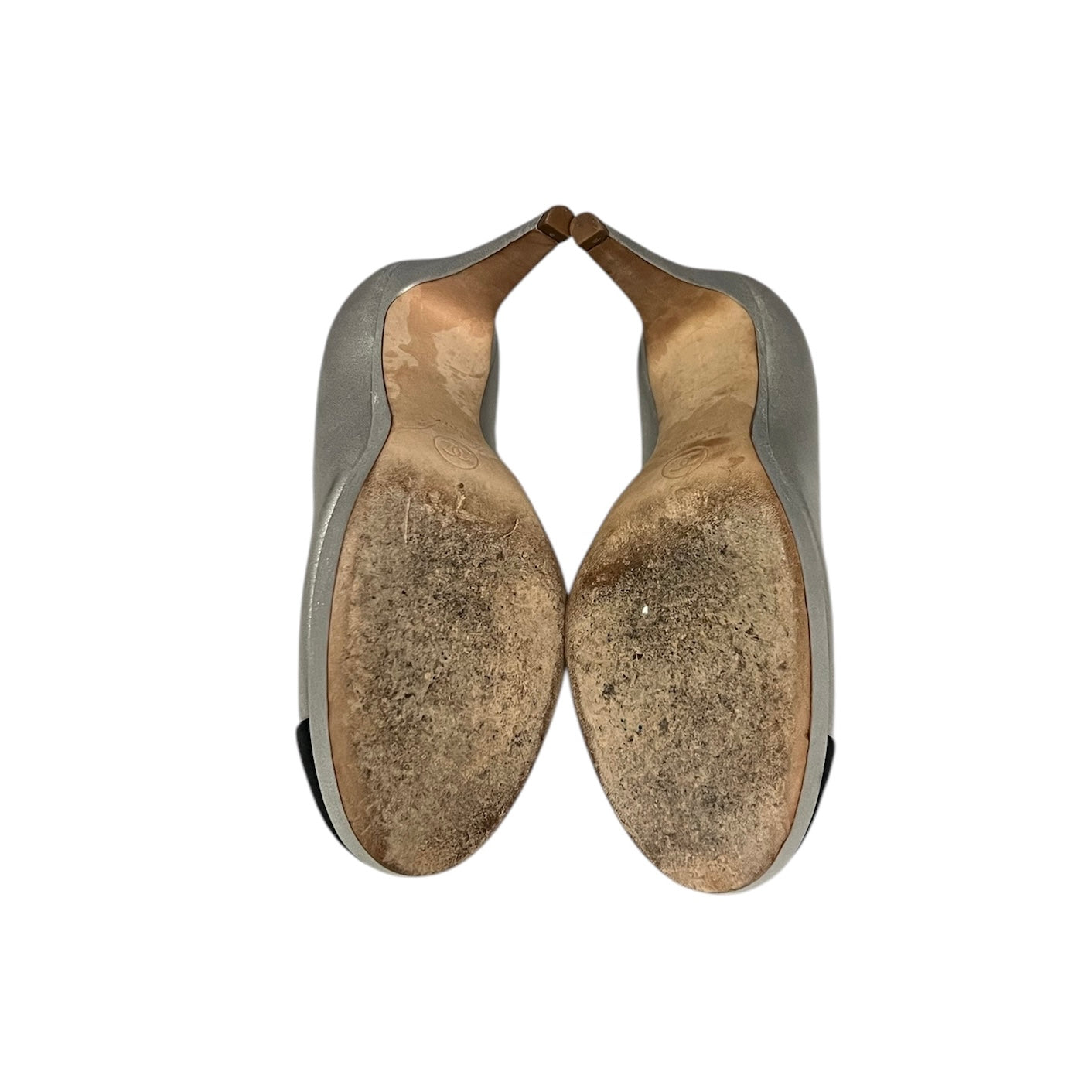 This is an authentic pair of CHANEL Metallic Cap Toe Pumps. These chic pumps are crafted of a metallic silver and black fabric with leather lining. They feature a round toe, CC stitched on the upper, and a slip-on style.