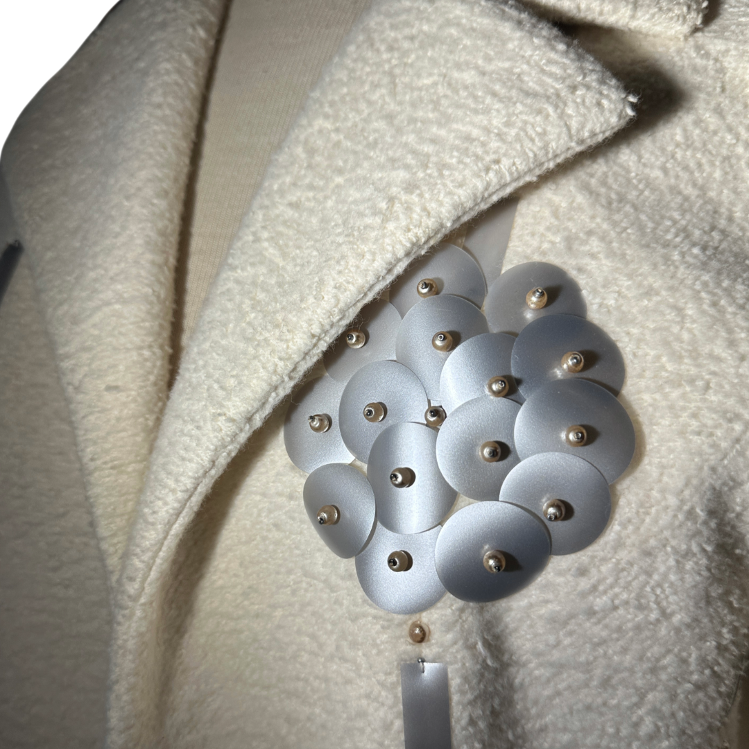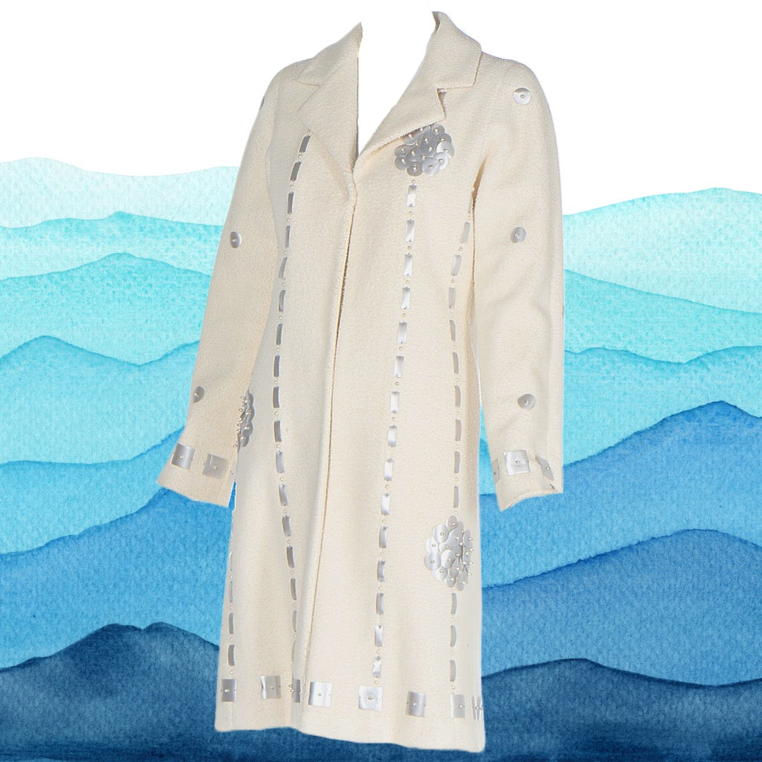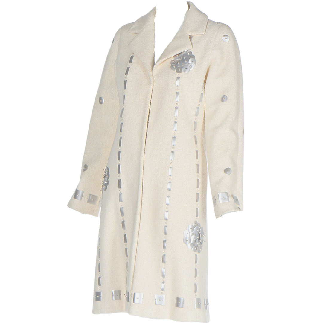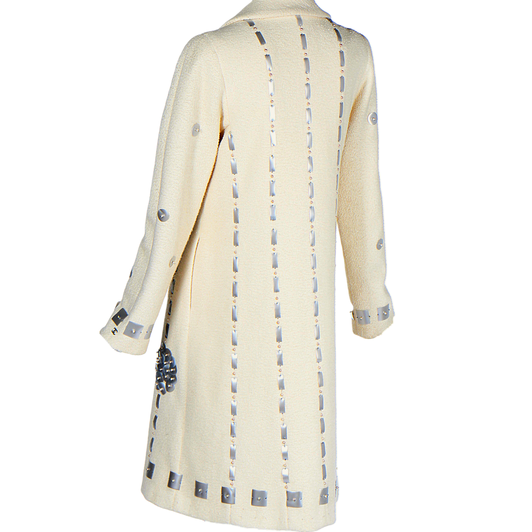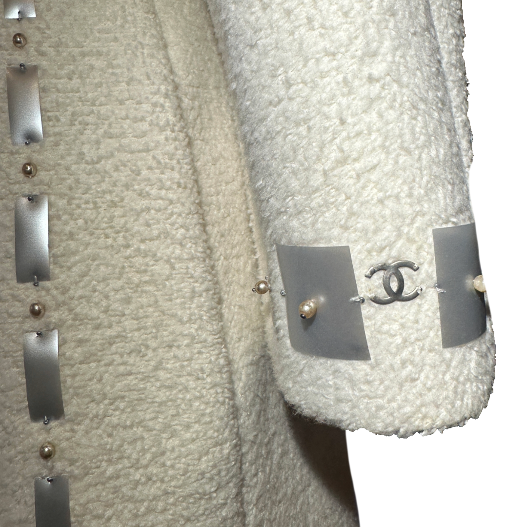 This stunning Chanel Off-White Bouclé Cotton-Blend Coat, from the 2000 Autumn Collection, is a timeless piece of couture elegance. The coat, labelled and crafted from a luxurious cotton-blend bouclé, is beautifully embellished with delicate silver and 'pearl' paillettes and beads, adding a touch of sparkle and sophistication.