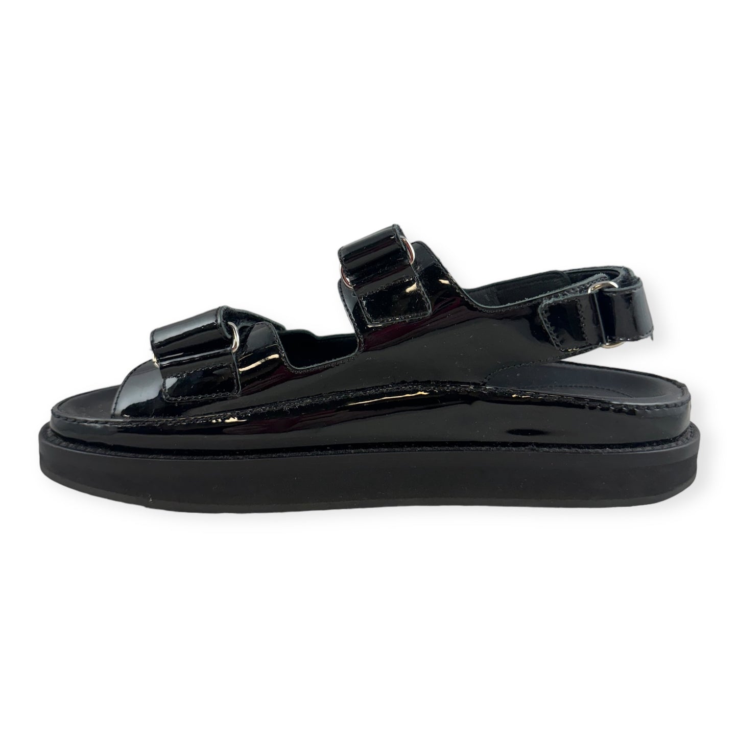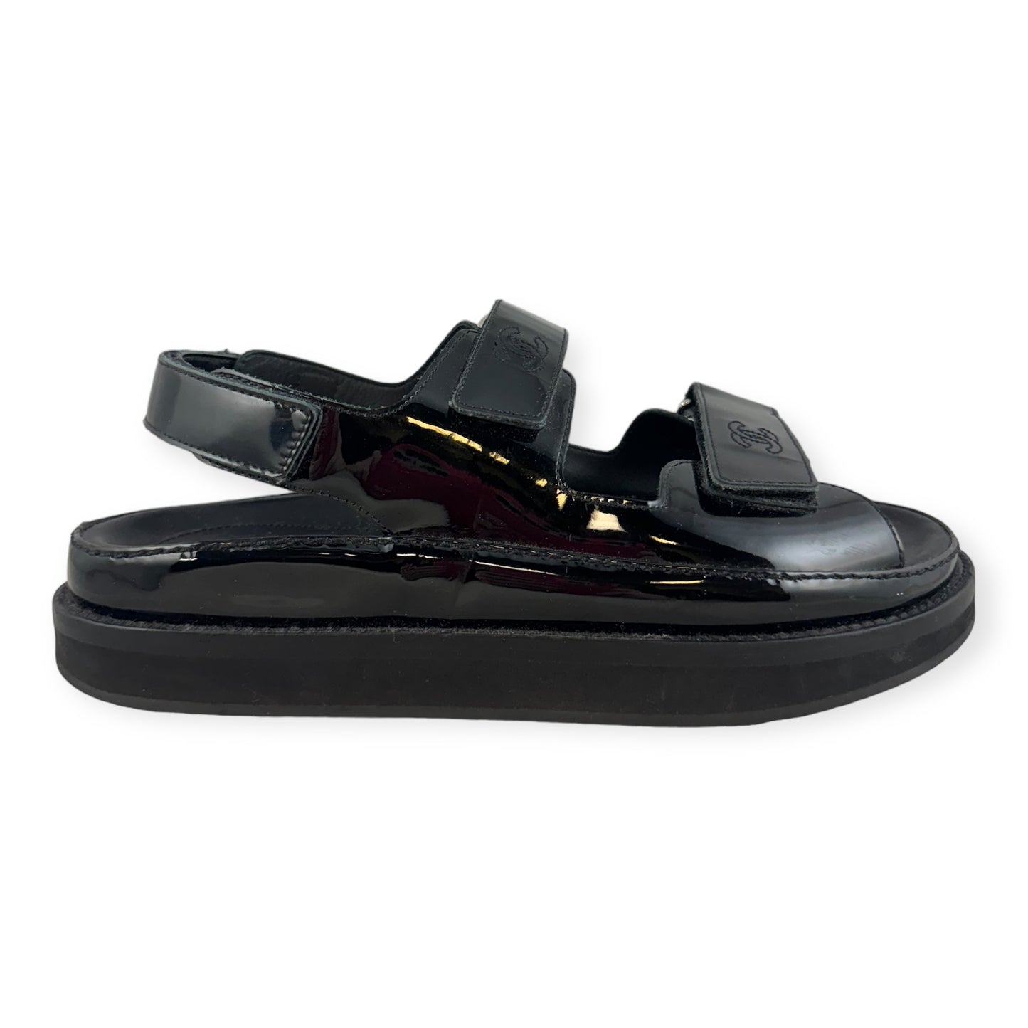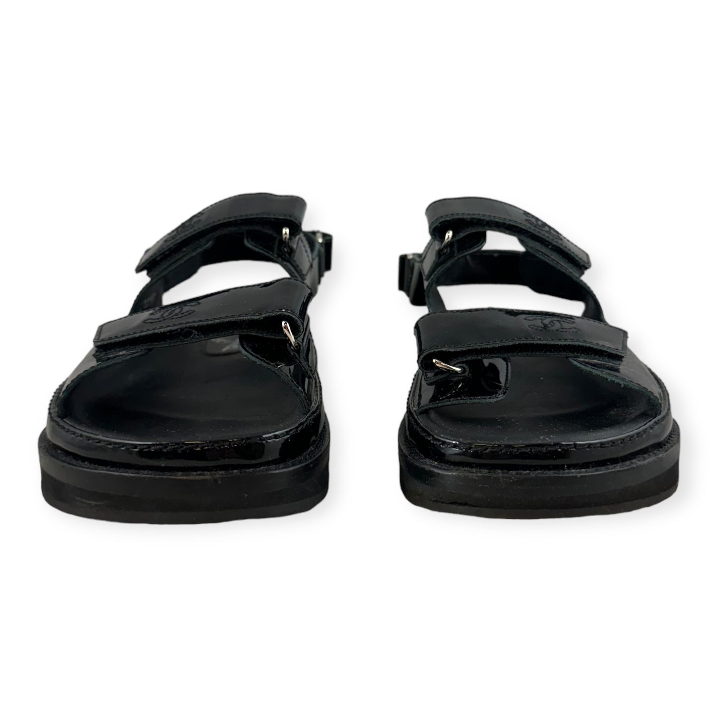 This is an authentic pair of CHANEL Patent Dad Sandals in Black. These sandakls are crafted of black patent leather with silver-toned hardware. They feature a square toe, two upper velcro straps adorned with the iconic CC Logo, and an ankle velcro strap closure.