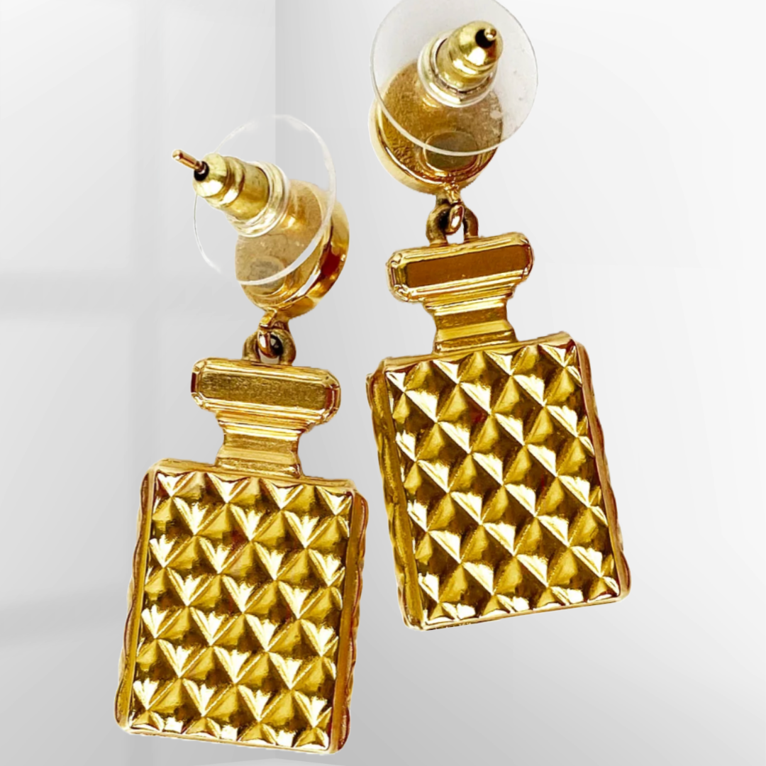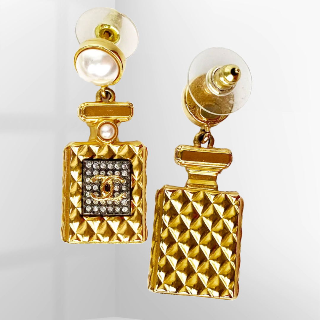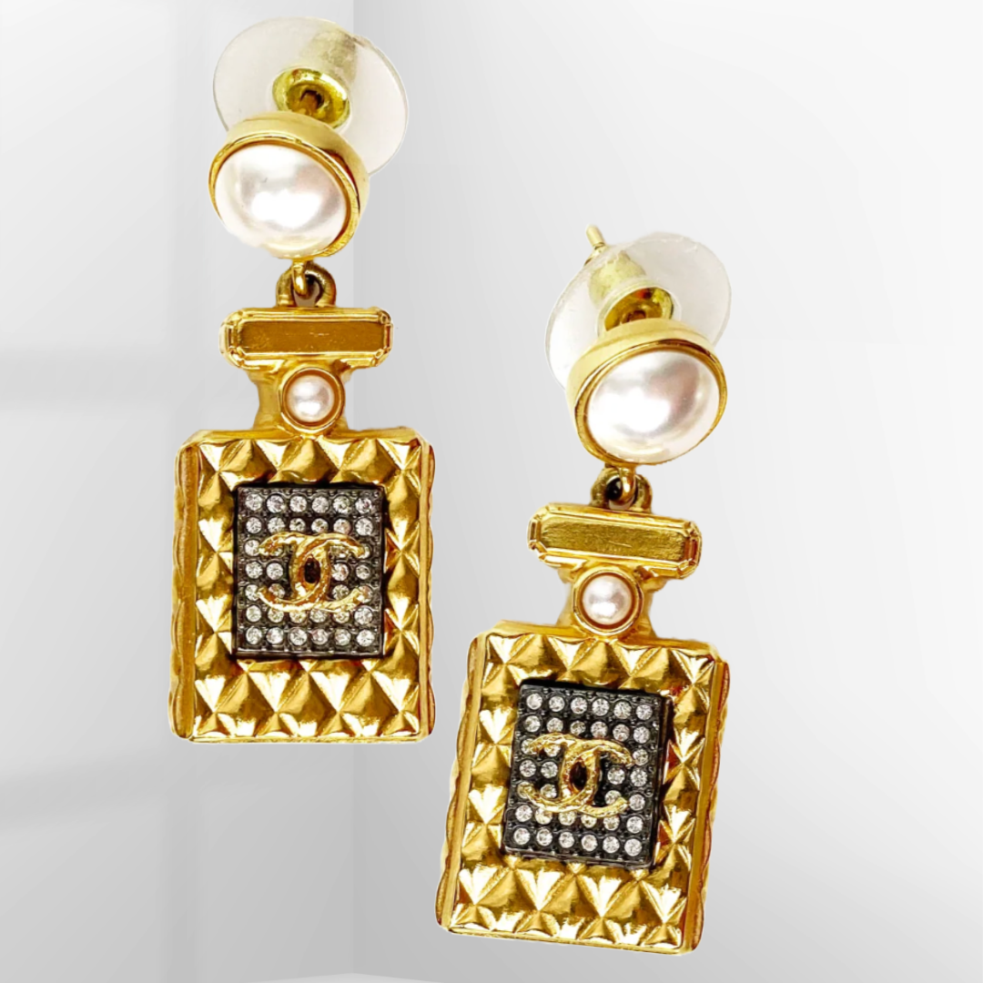 These fabulous CHANEL perfume bottle earrings hang elegantly from two faux pearl studs, featuring dazzling crystal-studded squares at the center with signature gold 'CC' logos. Crafted from gold-tone metal, crystals, and faux pearls, these earrings exude timeless luxury. In excellent condition with only mild signs of wear, they come complete with the original box for added charm and authenticity. Measuring 4.5cm in length, they are the perfect statement accessory for any Chanel lover.