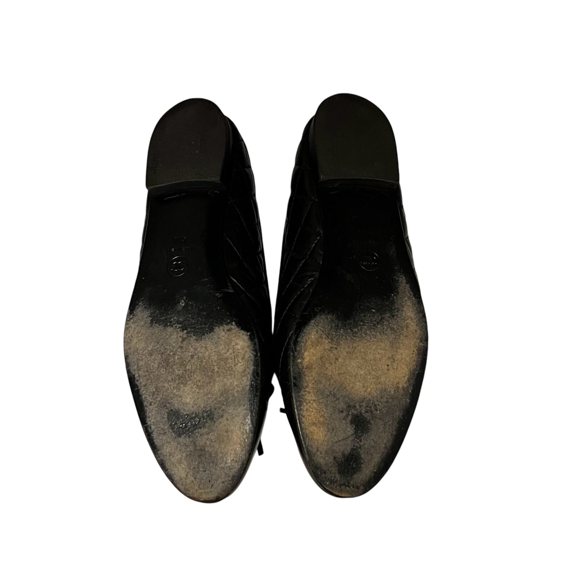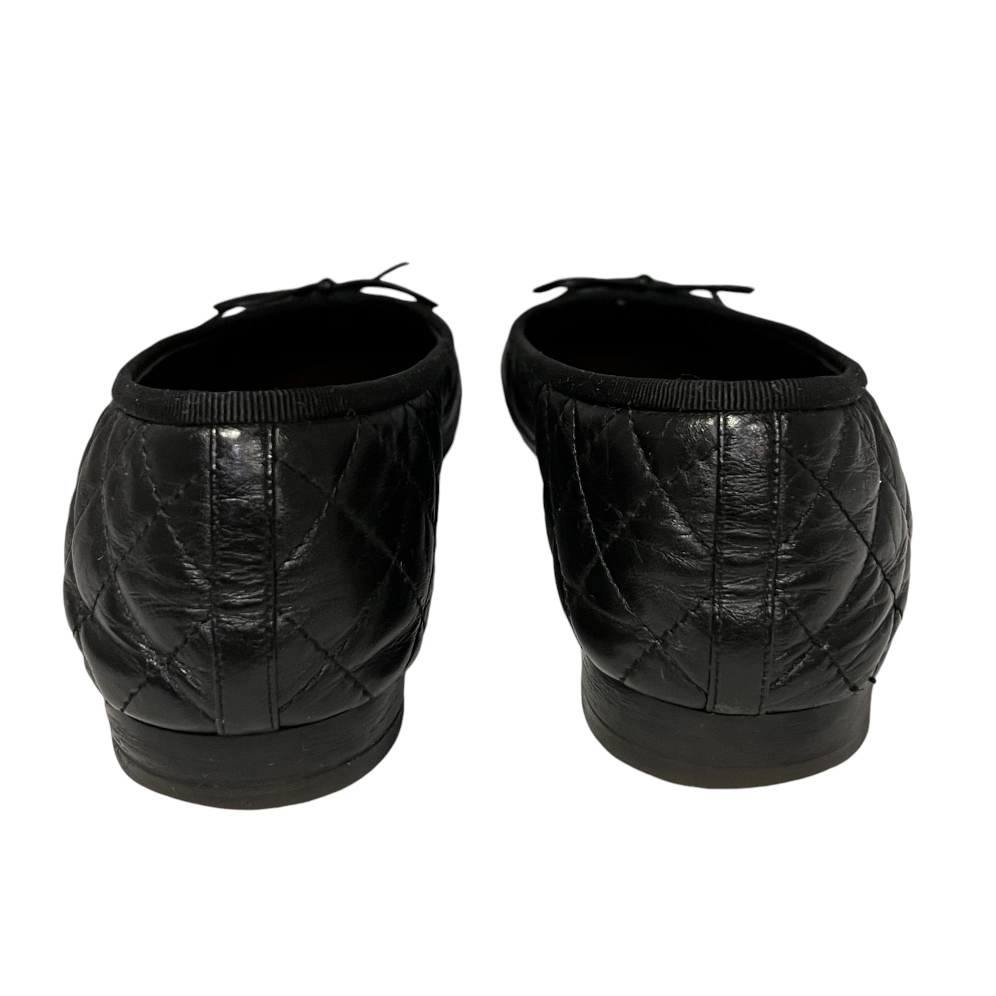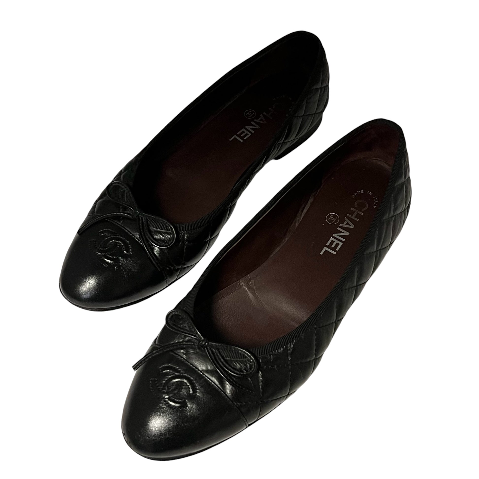 This authentic pair of CHANEL Quilted Ballerinas in black lambskin feature with a patent leather captoe stitched with the iconic logo, a stacked flat heel, signature bow and an almond toe.