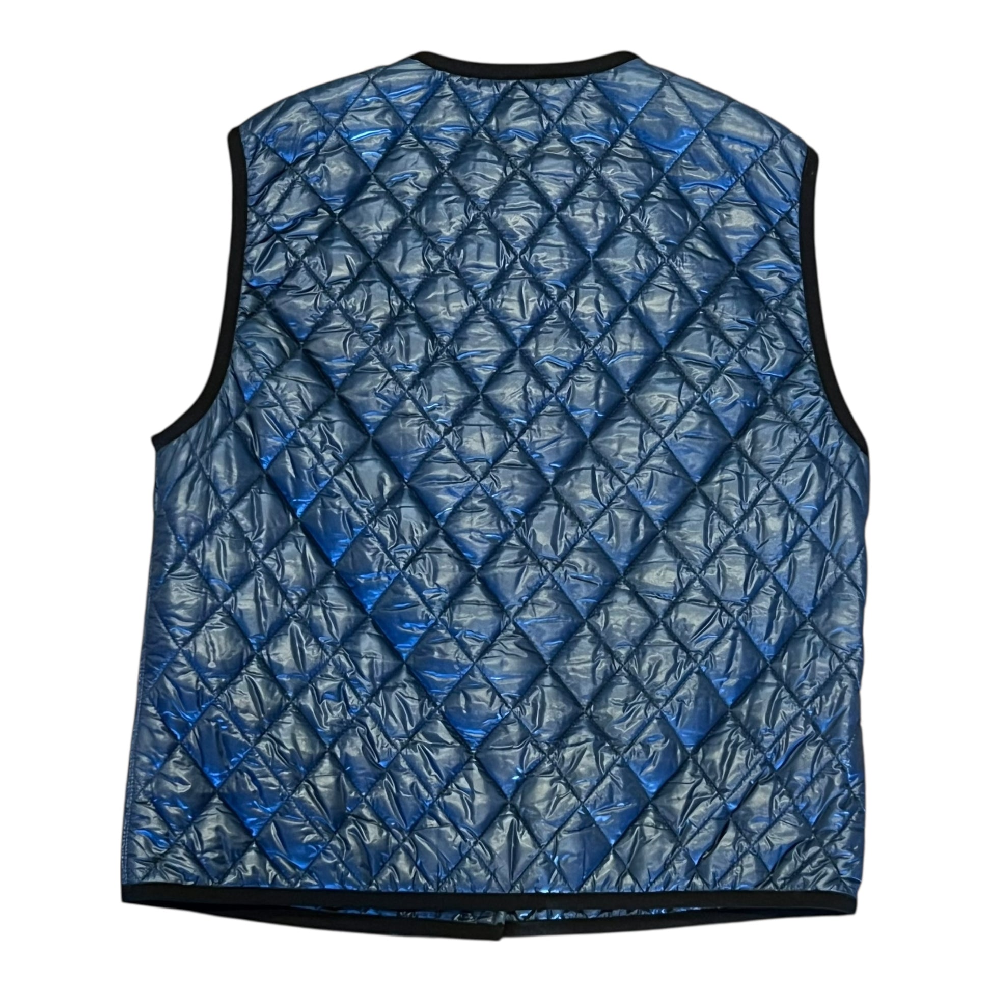 This is an authentic CHANEL Quilted Vest in navy blue with black trim features an eight snap closure in the front and two patch pockets at the front embellished with black CC buttons.