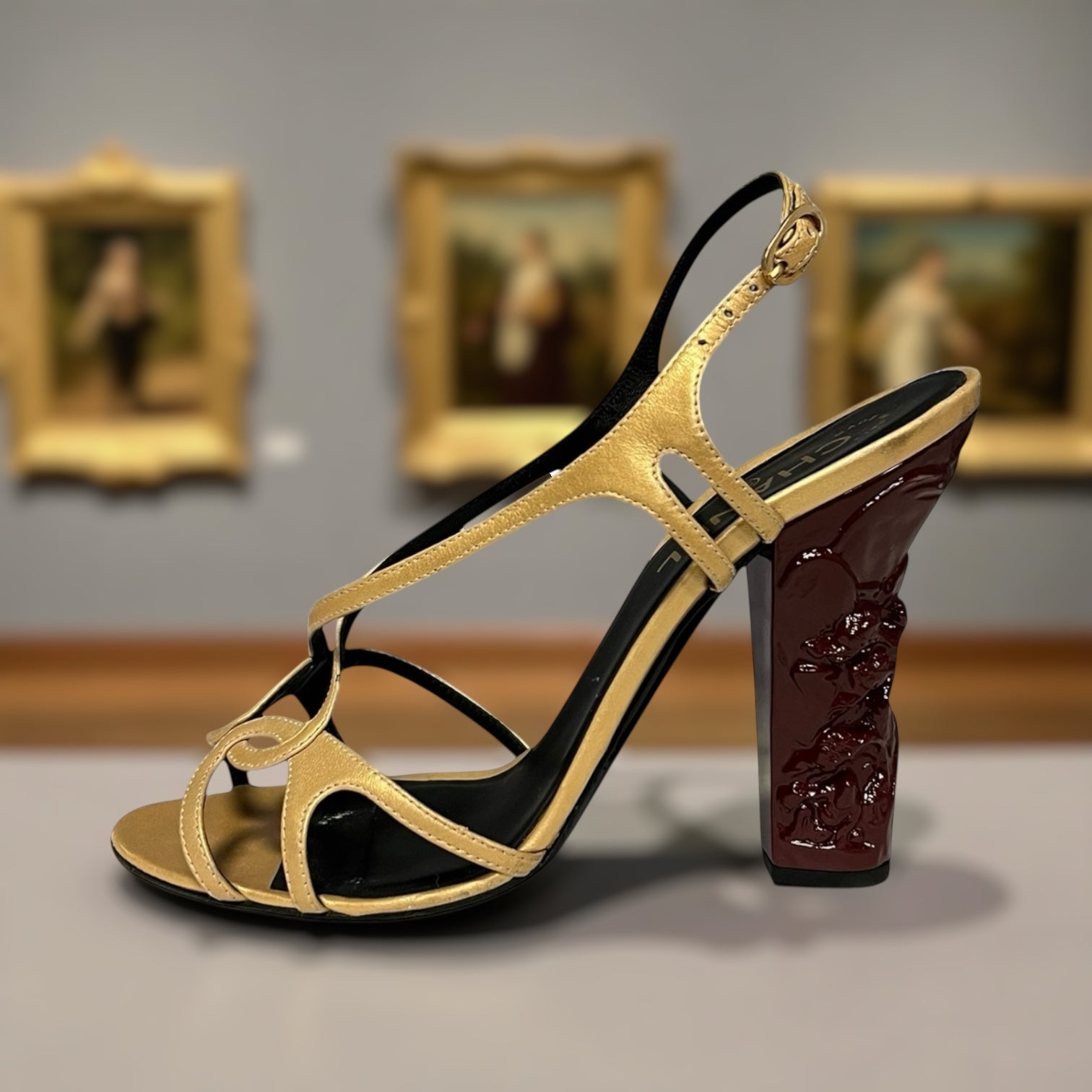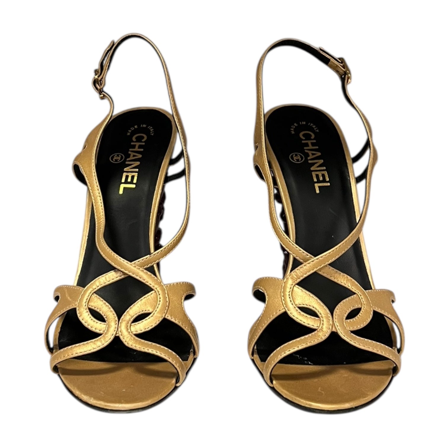 This is an authentic pair of CHANEL Sculpted Jardin Sandal features a deep red sculpted Jardin heel, gold straps, a gold buckle closure, and a peep toe.