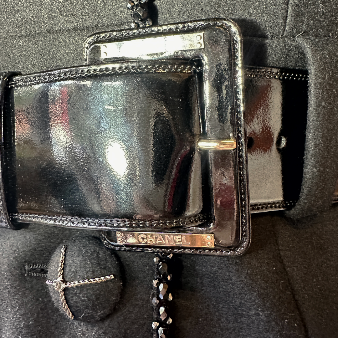 The Chanel Soft Black Wool 3/4 Length Hand-Beaded Coat from the 2007 Autumn Collection is a luxurious masterpiece, crafted with exceptional attention to detail. Made from soft black wool, this elegant coat in size 40 exudes sophistication and timeless Chanel style. A black patent leather belt featuring the iconic CC silver hardware cinches the waist, while optional removable lapel ties provide added versatility to the look.