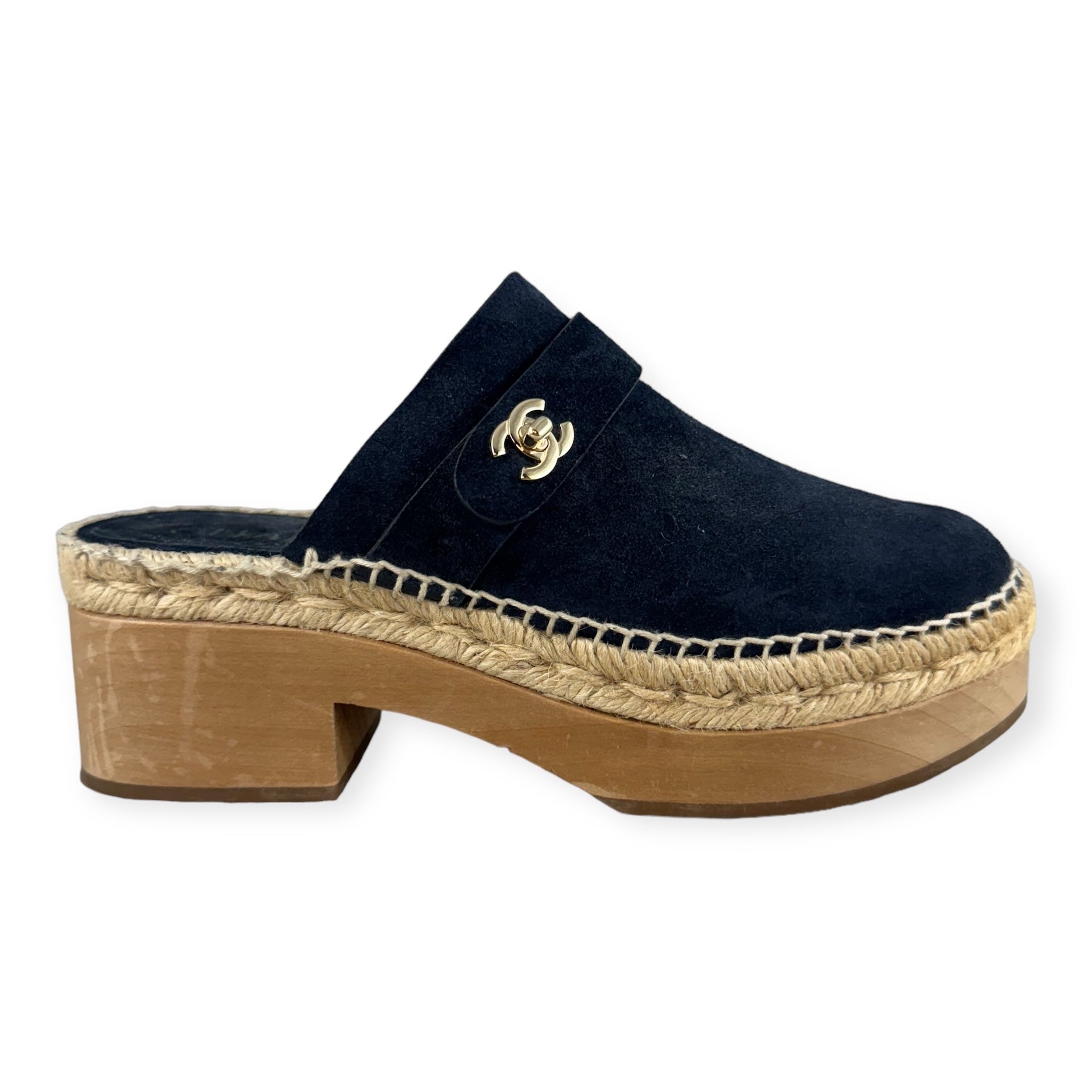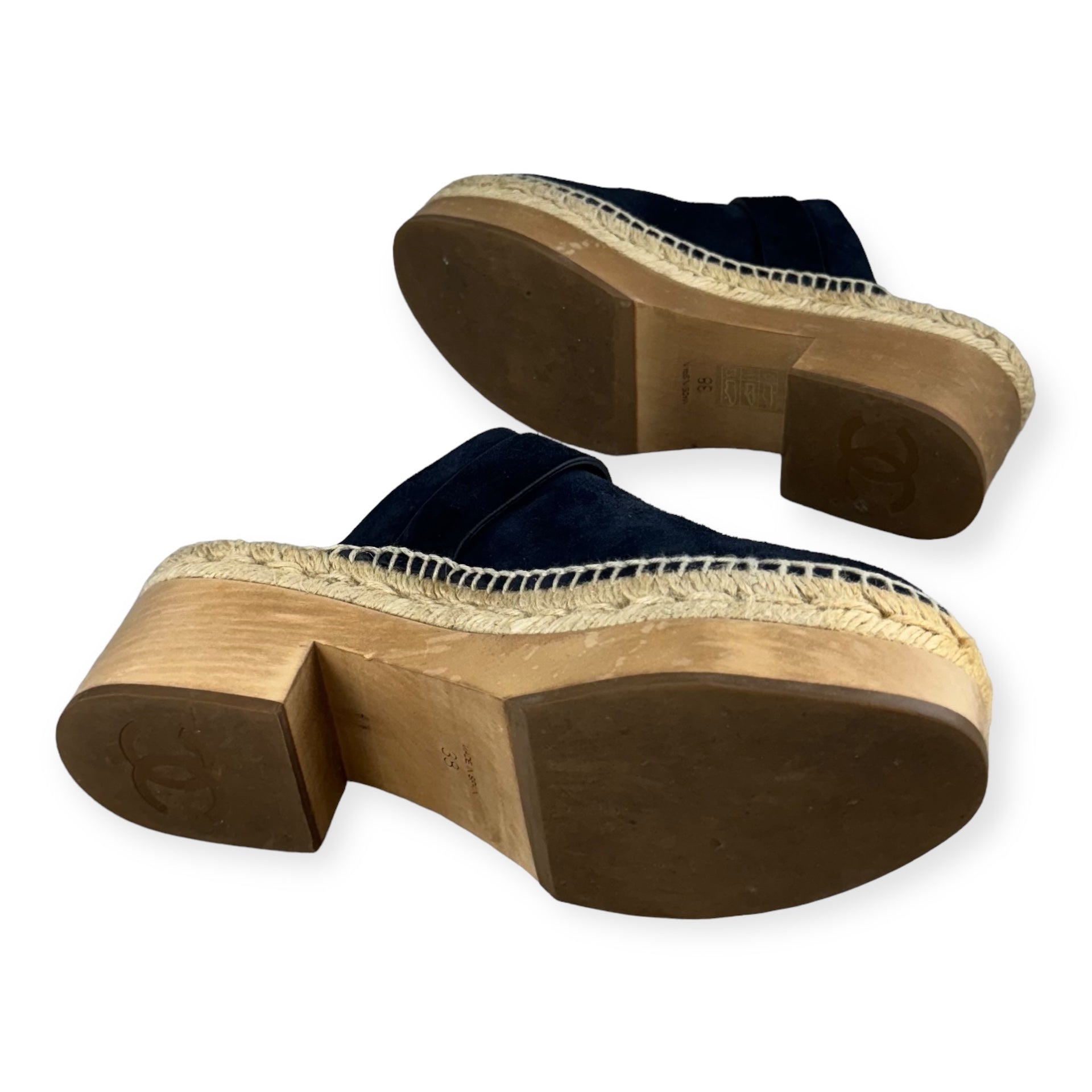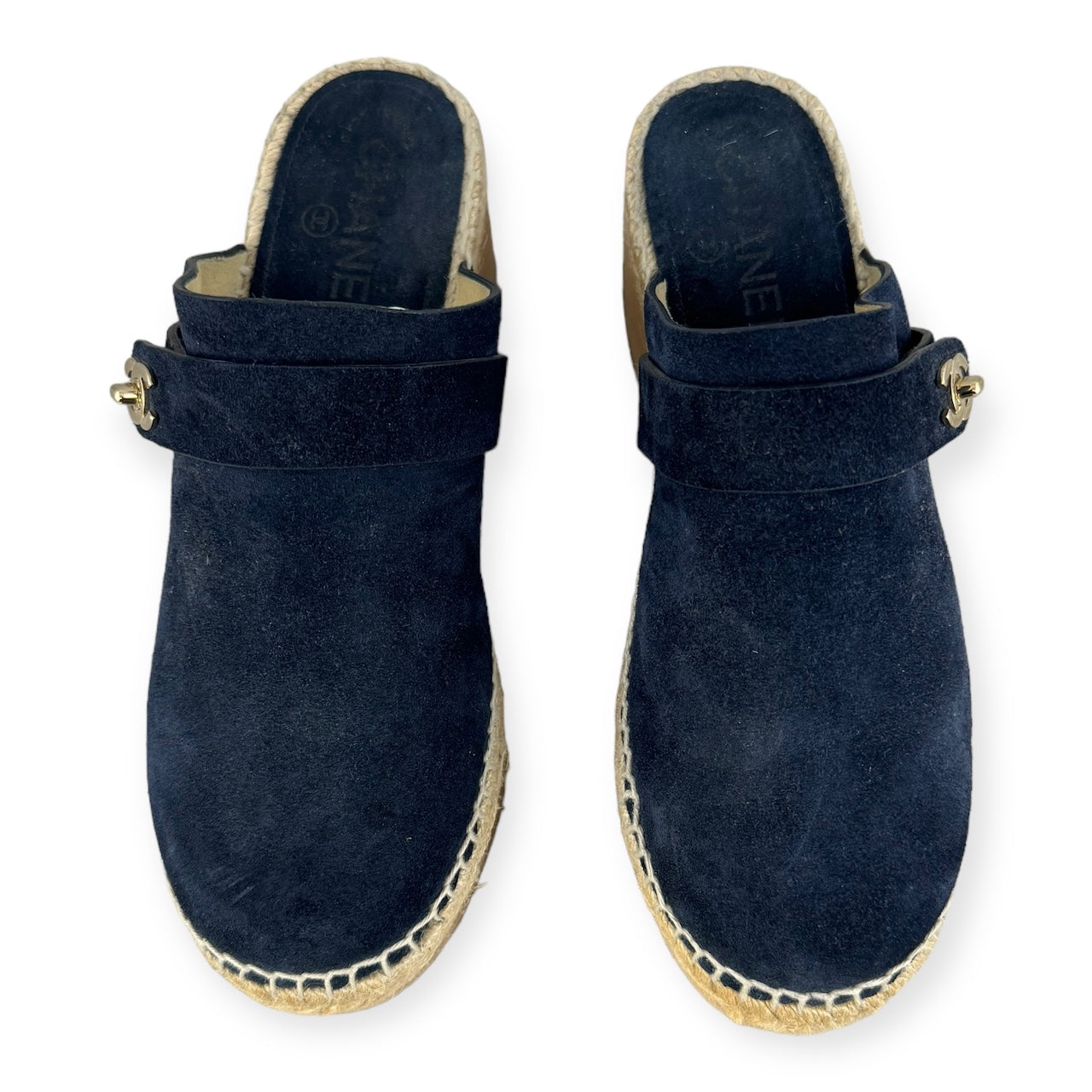 This is an authentic pair of CHANEL Suede Clogs in Navy. These clogs are crafted of suede with wooden soles. They feature a round toe, a 1.5 in platform, a 2.5 in block heel, and a slip-on style.