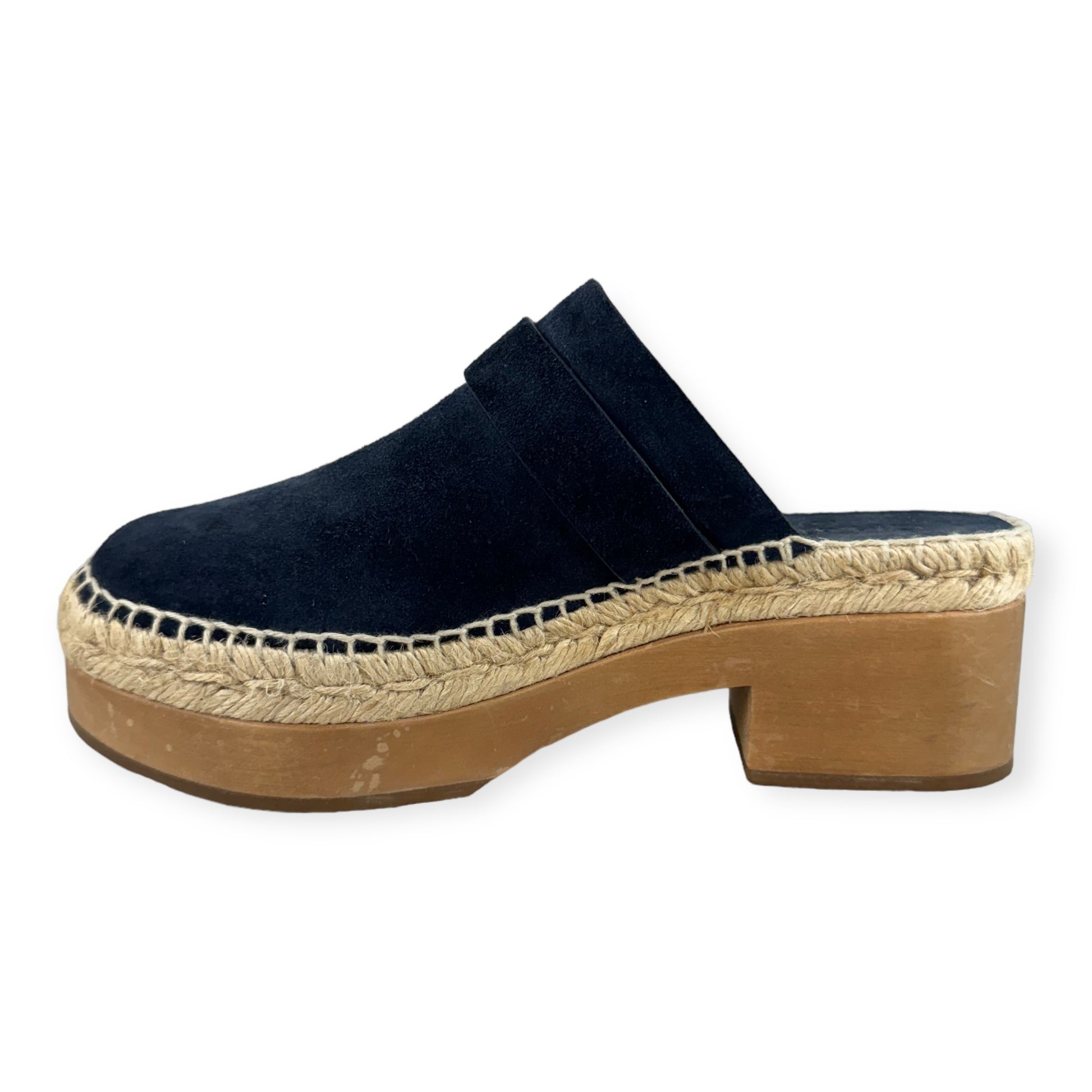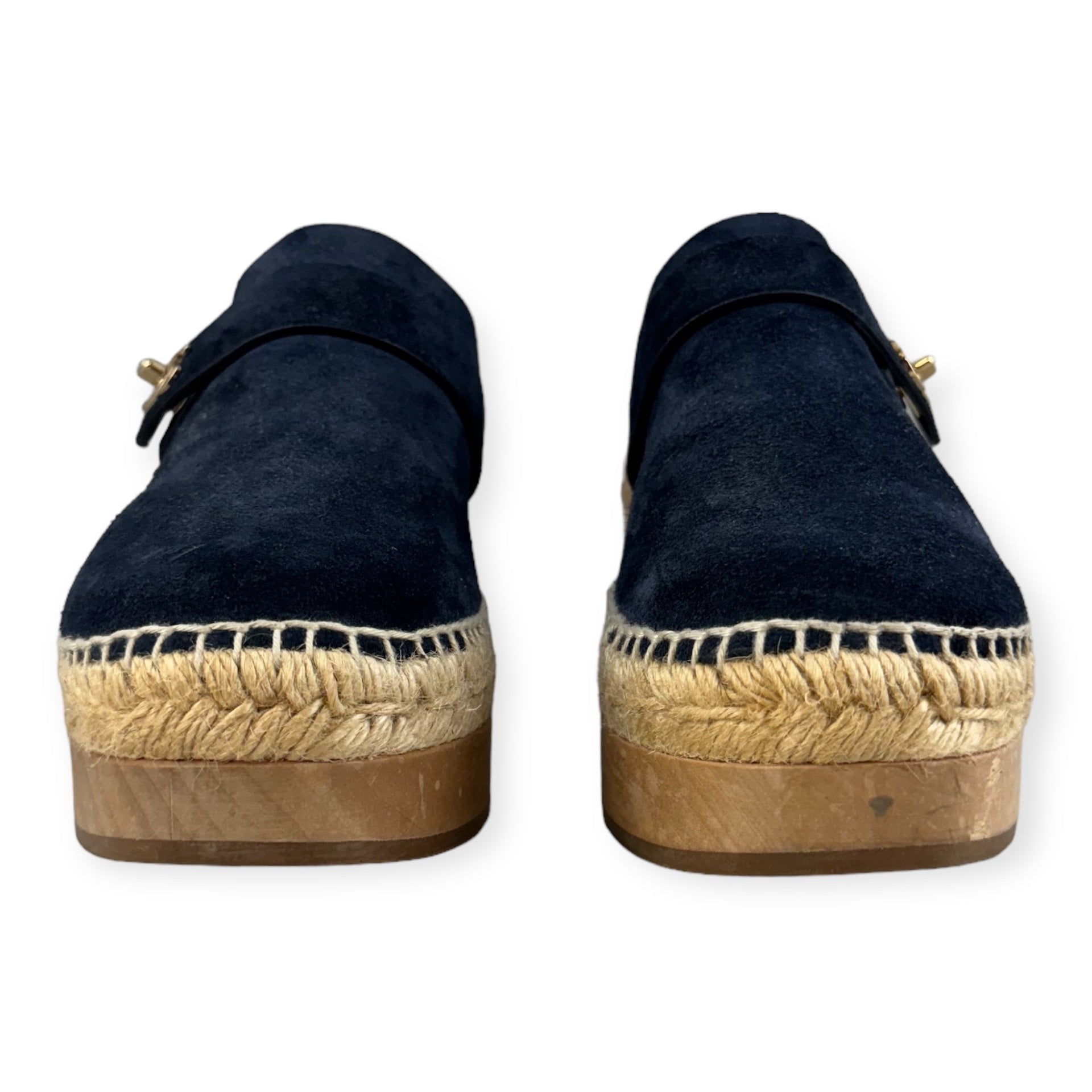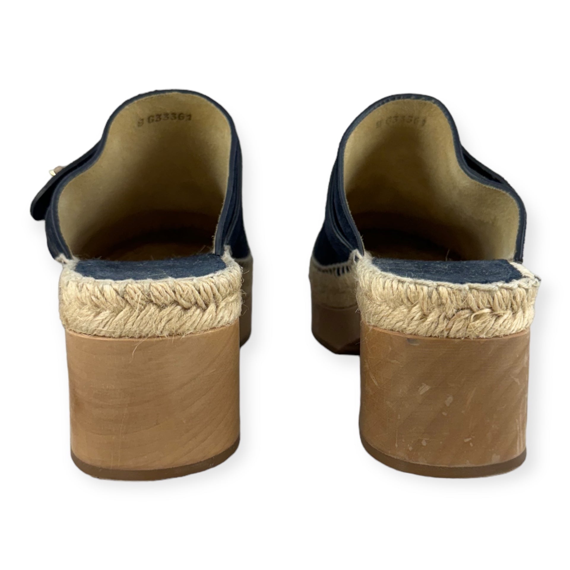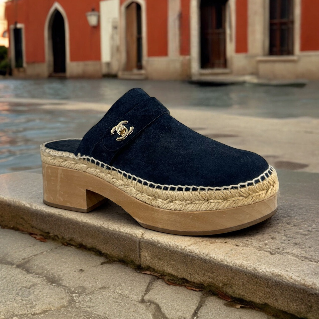 This is an authentic pair of CHANEL Suede Clogs in Navy. These clogs are crafted of suede with wooden soles. They feature a round toe, a 1.5 in platform, a 2.5 in block heel, and a slip-on style.