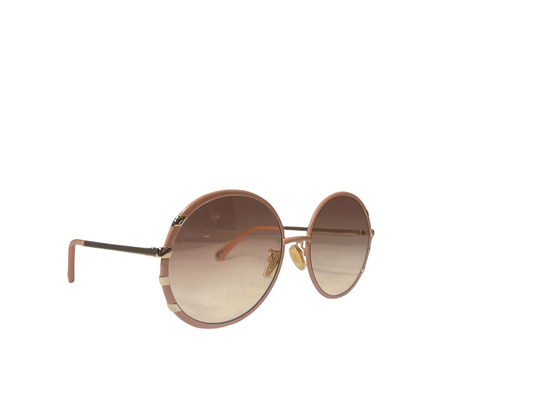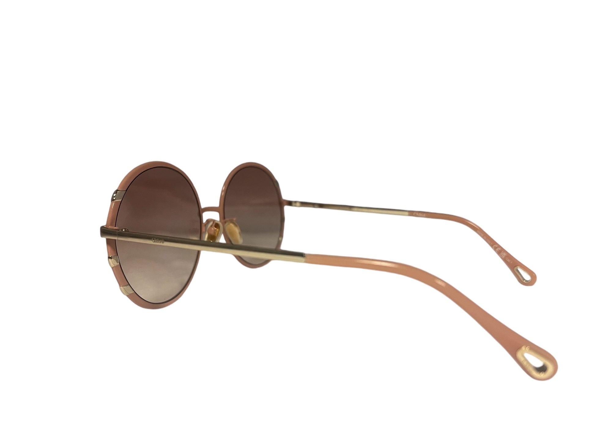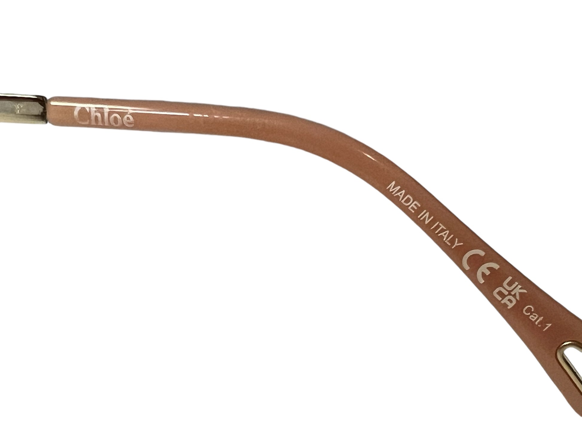 This authentic pair of CHLOE Celeste Sunglasses in blush and soft gold metal frames with gradient rose tinted lenses offerUVA and UVB protection and feature the engraved logo at the temple along with the drop shaped opening logo at the end of each arm.