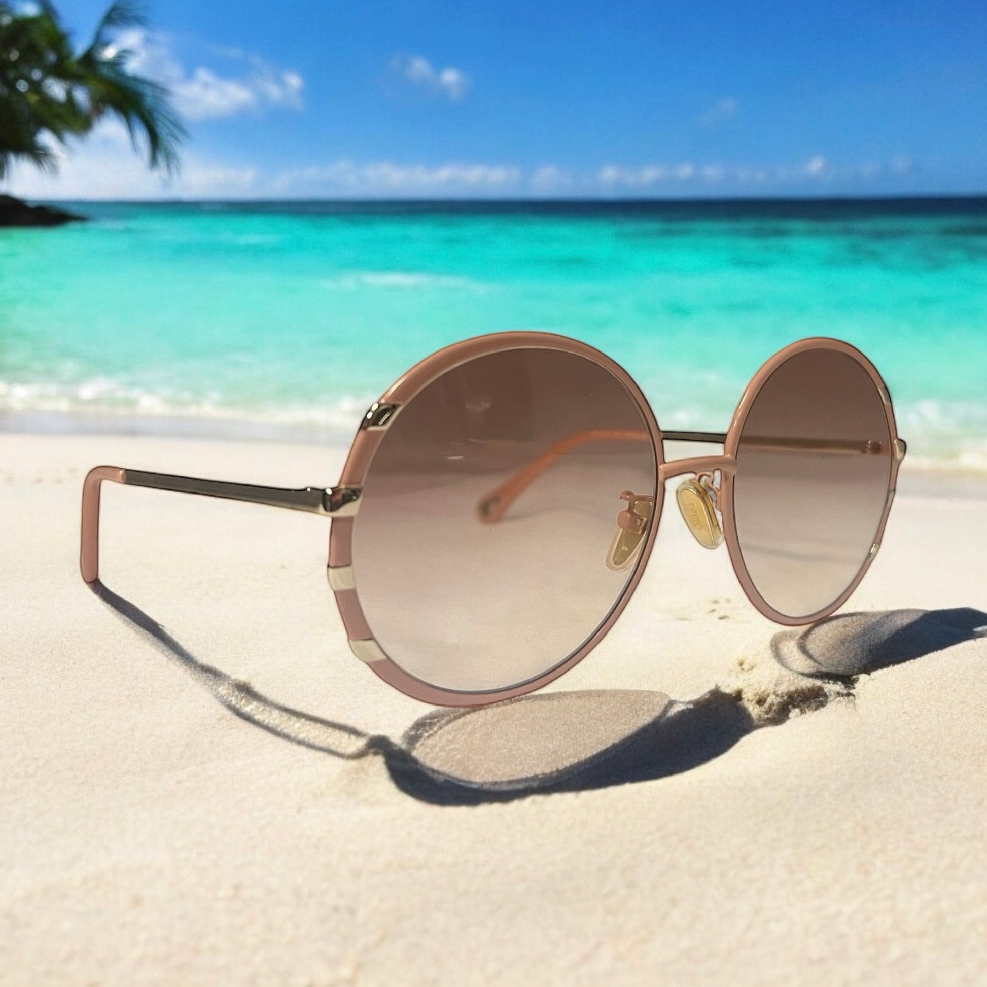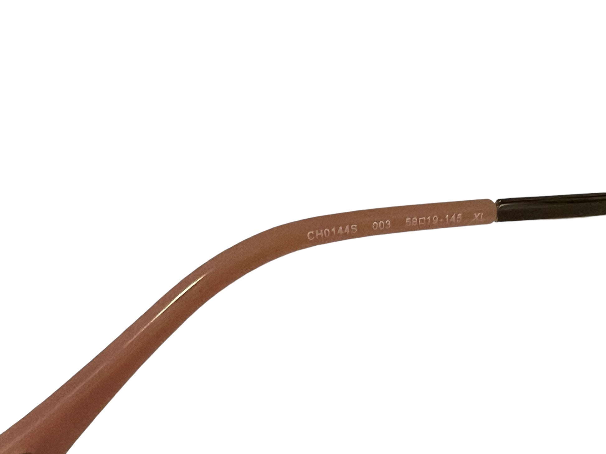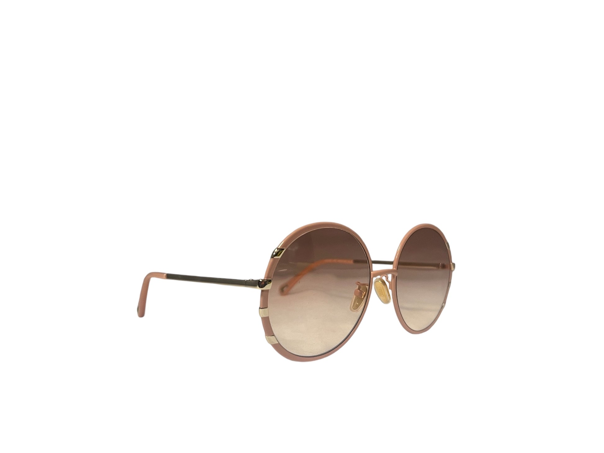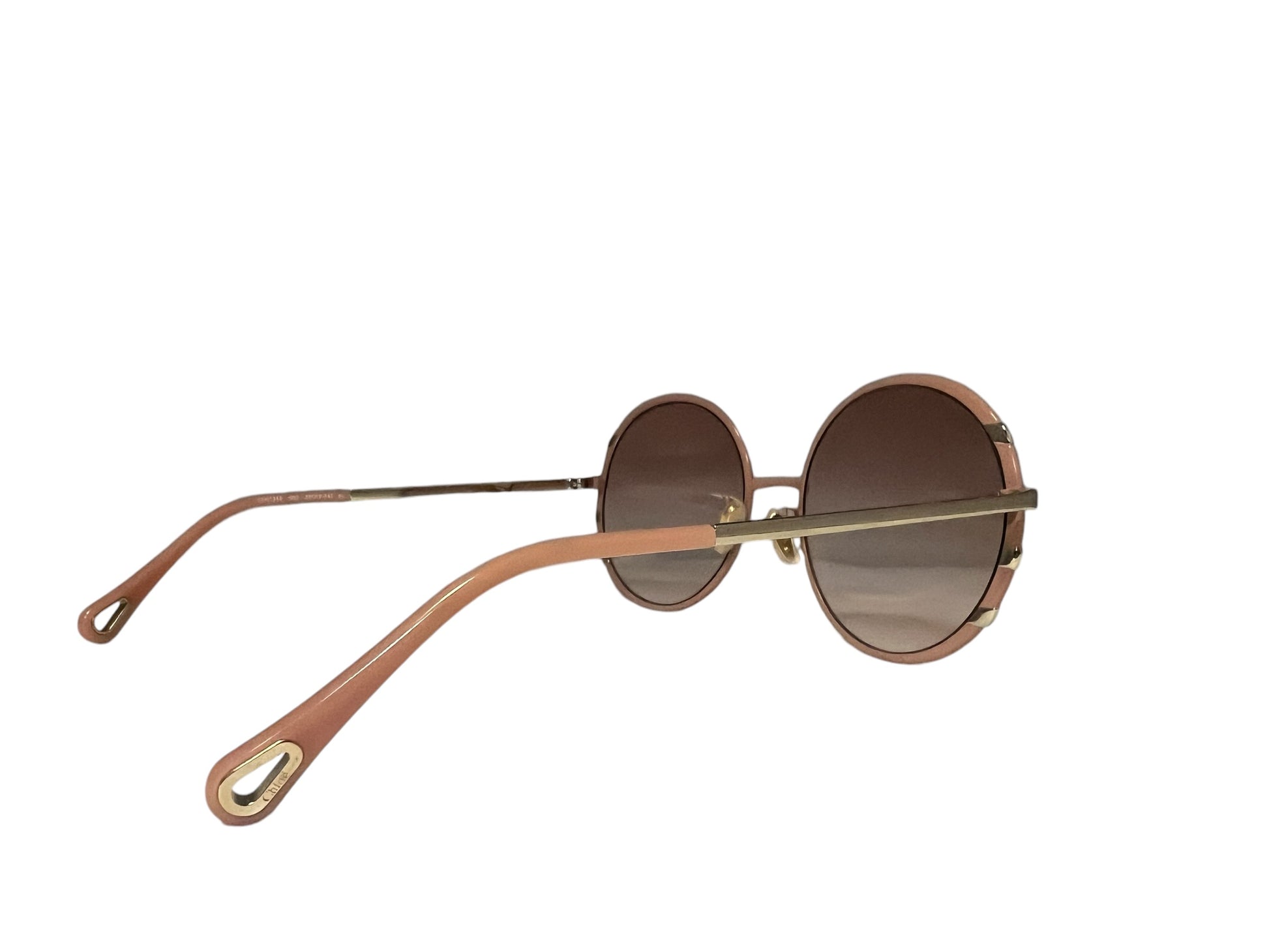 This authentic pair of CHLOE Celeste Sunglasses in blush and soft gold metal frames with gradient rose tinted lenses offerUVA and UVB protection and feature the engraved logo at the temple along with the drop shaped opening logo at the end of each arm.