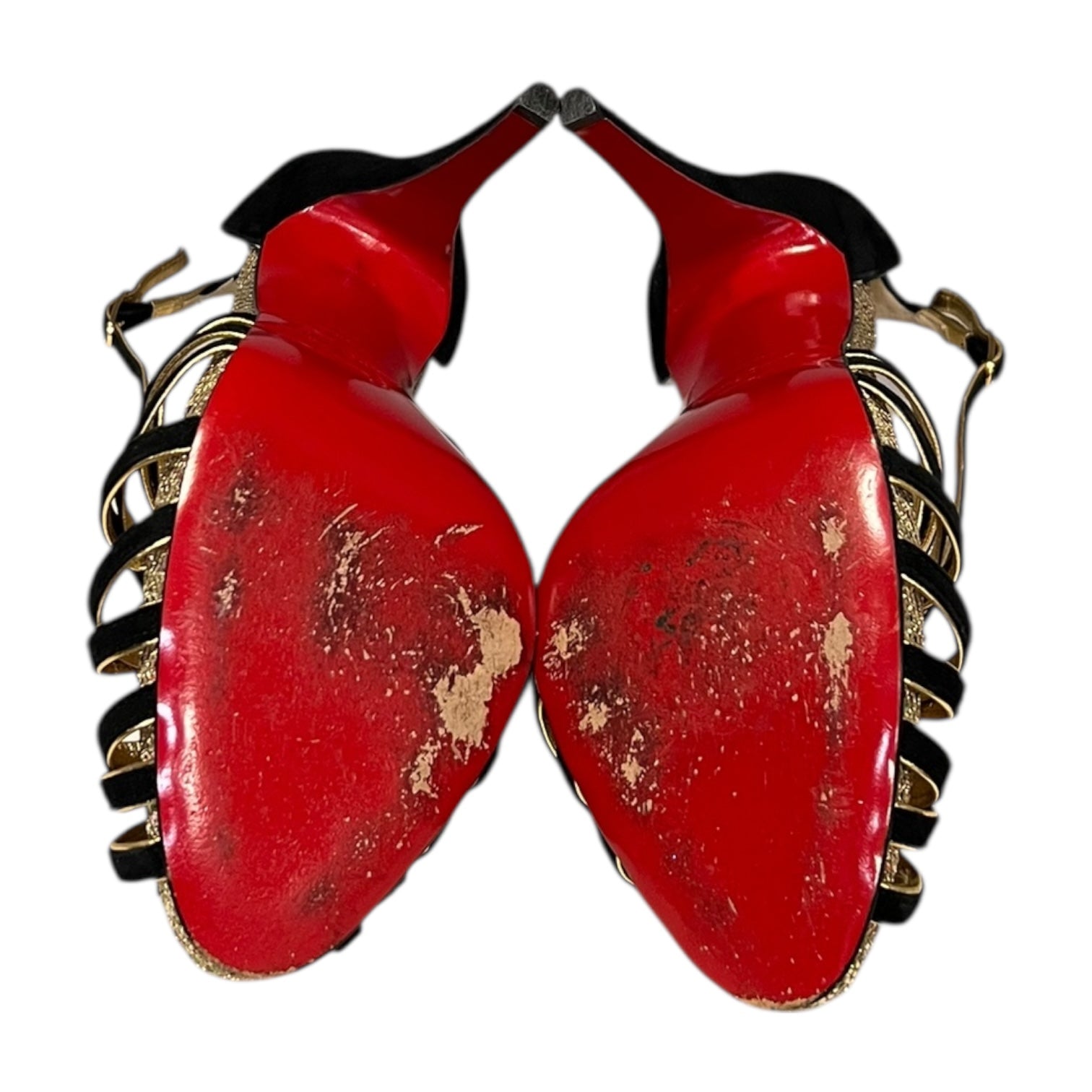 This authentic pair of CHRISTIAN LOUBOUTIN Mignon Suede & Glitter Sandal features criss-crossed suede straps with a gold edge detail, a glitter platform, and a gold buckle closure.