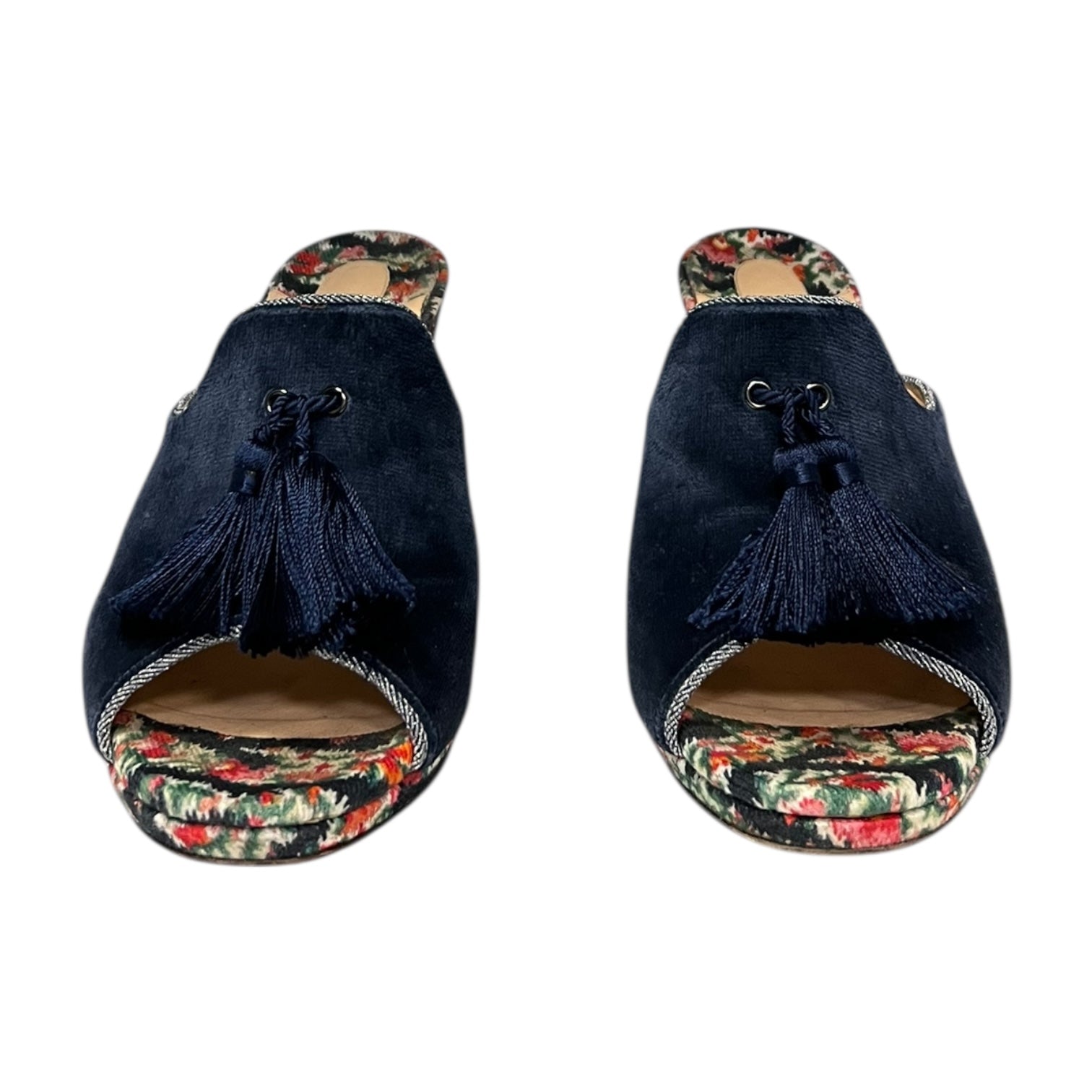 This authentic pair of CHRISTIAN LOUBOUTIN Mule de Vienne in navy blue, features the iconic red lacquered soles, a peep toe, a floral pattern toile platform, tonal tassels, and a 4 inch block heel.