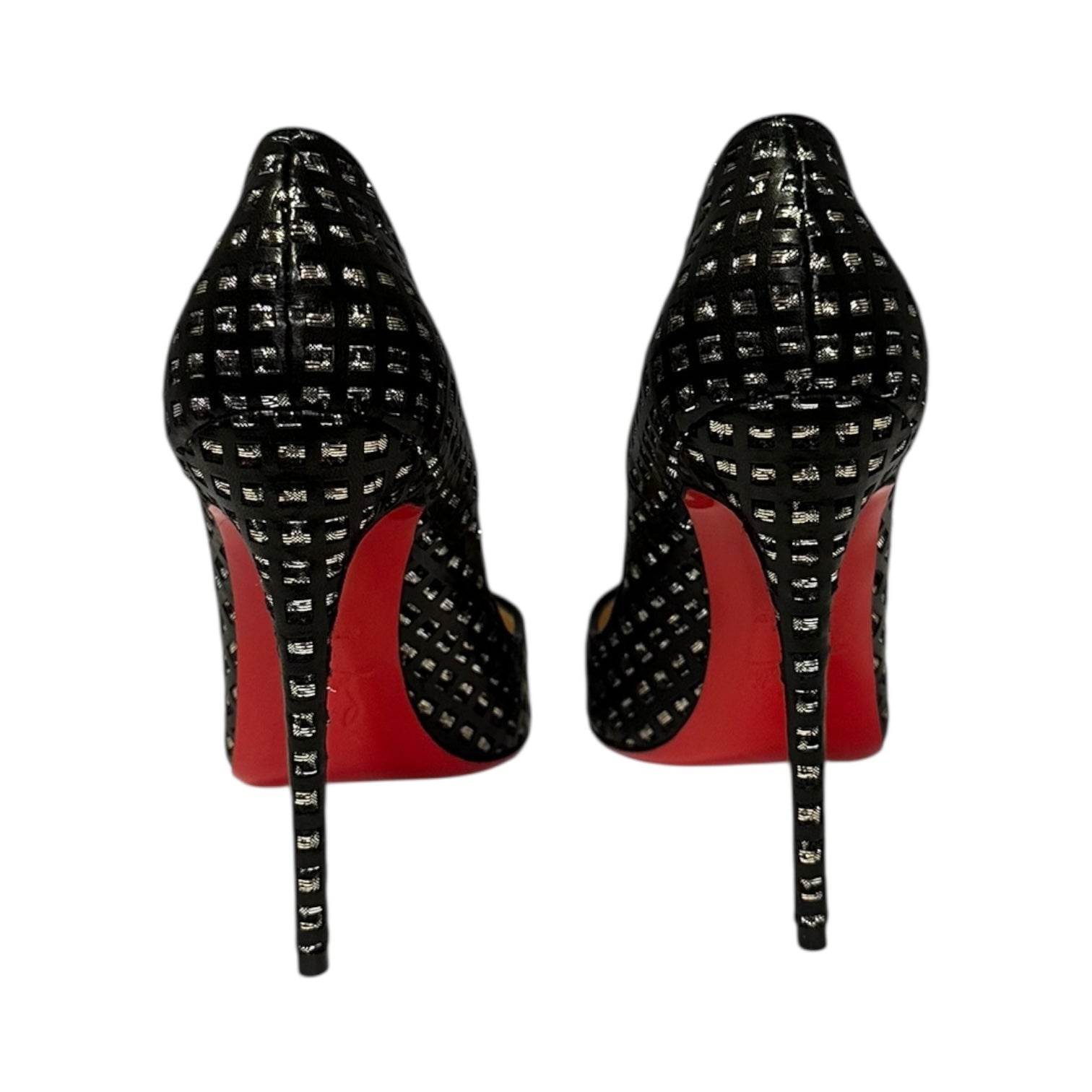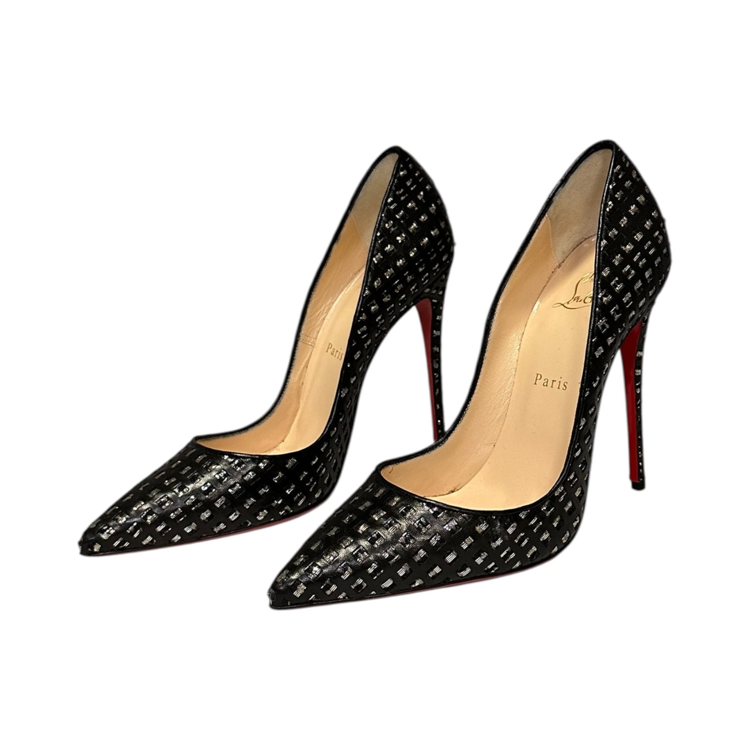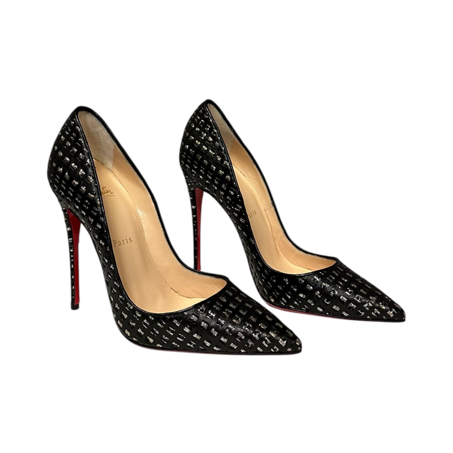 This authentic pair of CHRISTIAN LOUBOUTIN So Kate 120 Optic Mosaico Nappa Pumps, crafted of nappa leather, an integrated silver fabric weaving in a mosaic pattern, the iconic red lacquered soles, a pointed toe, and a 120 mm stiletto heel.