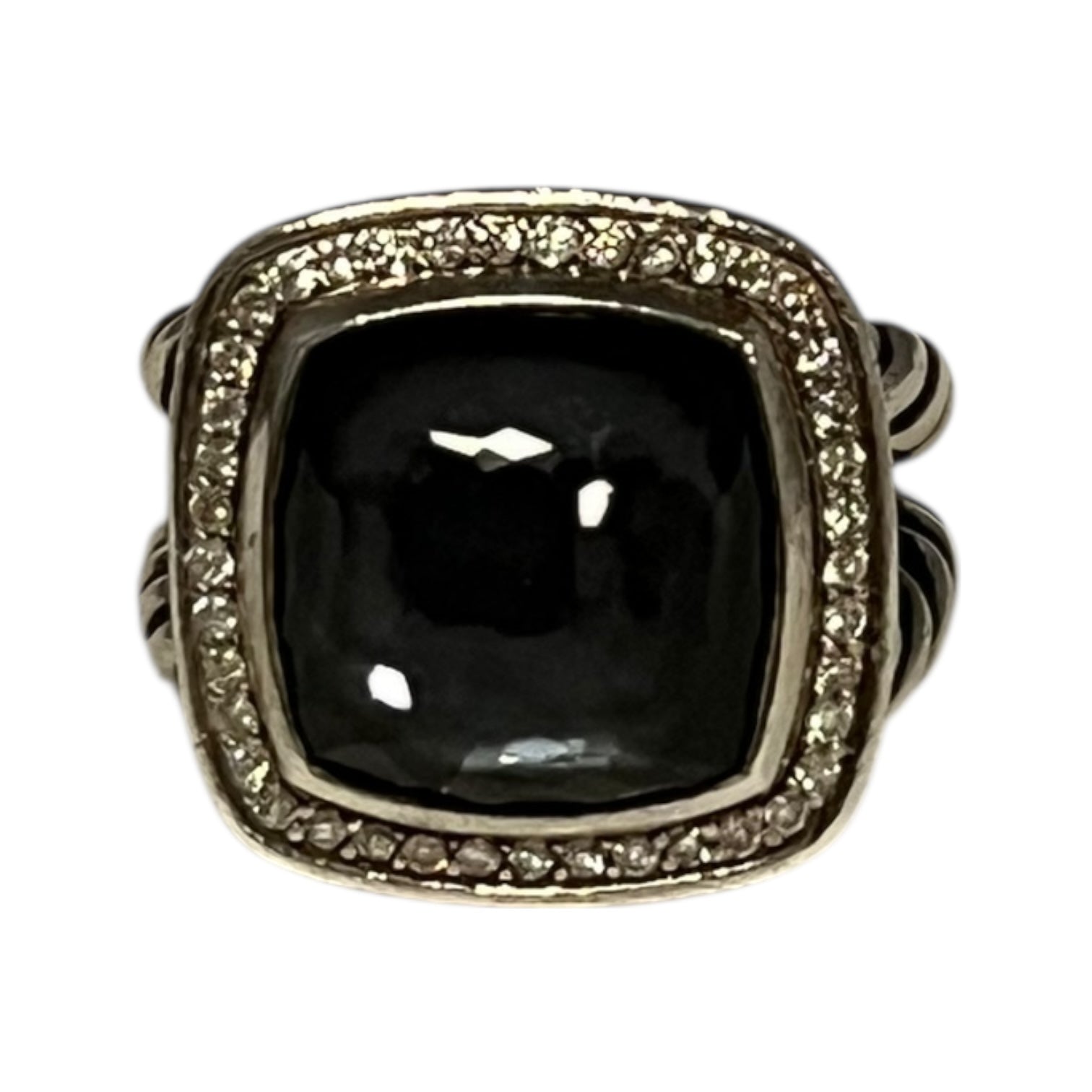 This is an authentic DAVID YURMAN Albion Black Orchid Ring features a double twisted sterling silver cable band, and an 11mm stone with a pave set diamond border.