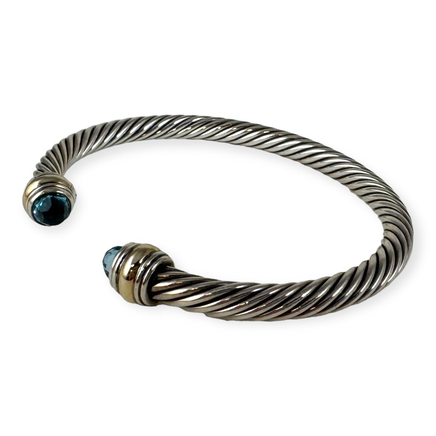 This is an authentic DAVID YURMAN Blue Topaz Classic Cable Bracelet. This stunning bracelet is crafted of 925 sterling silver with 14K yellow gold and blue topaz. It features a 7mm twisted cable band and a 6.5″ circumference.