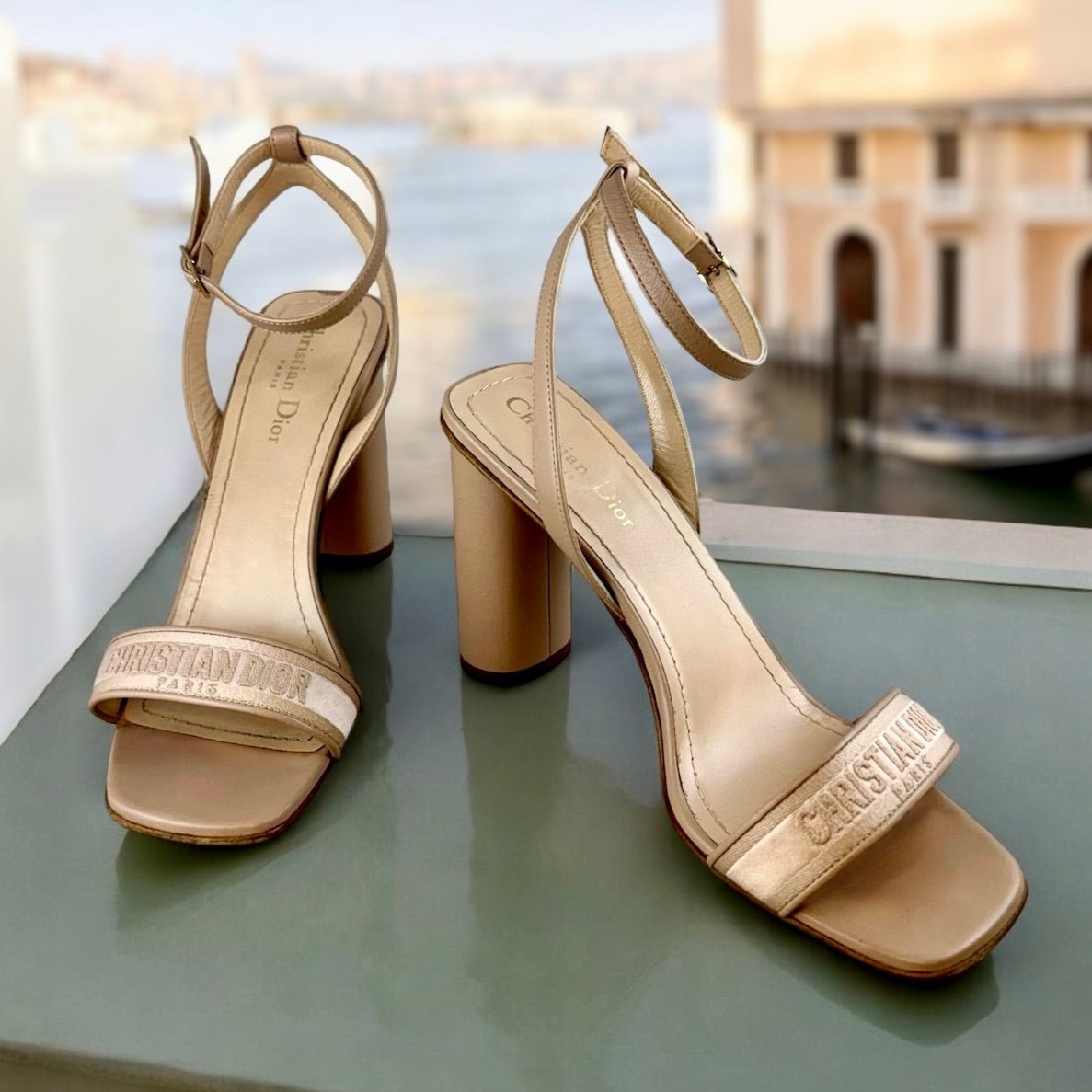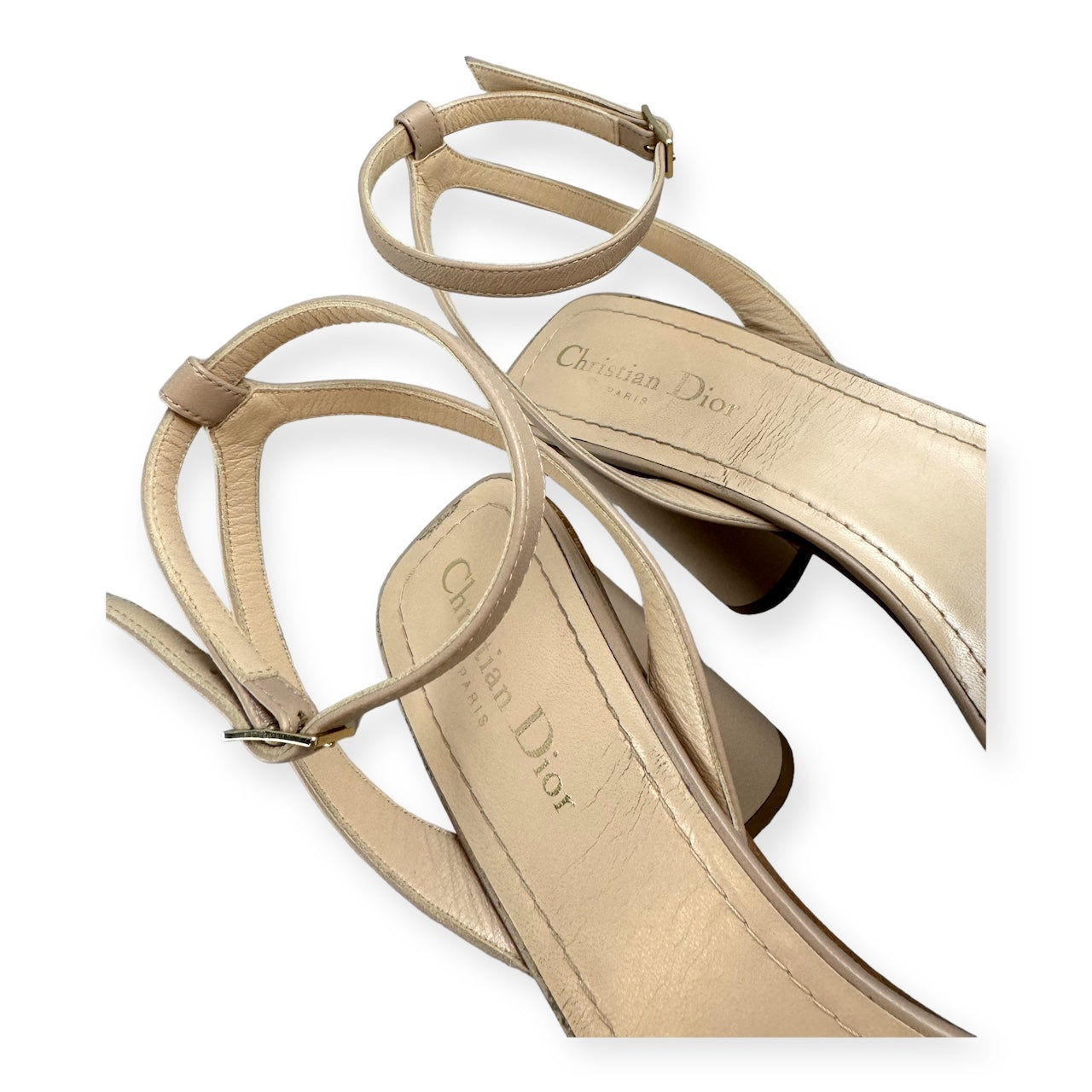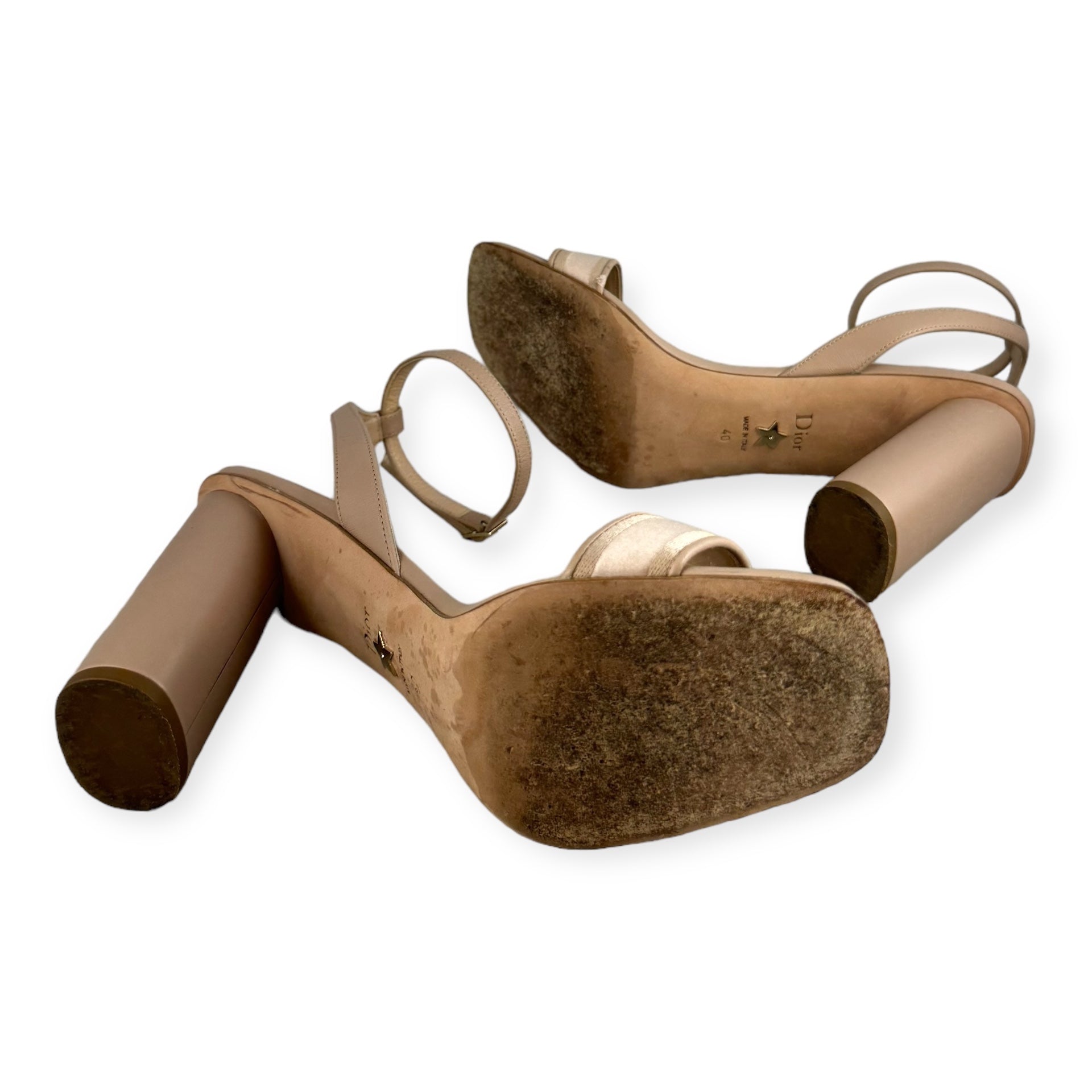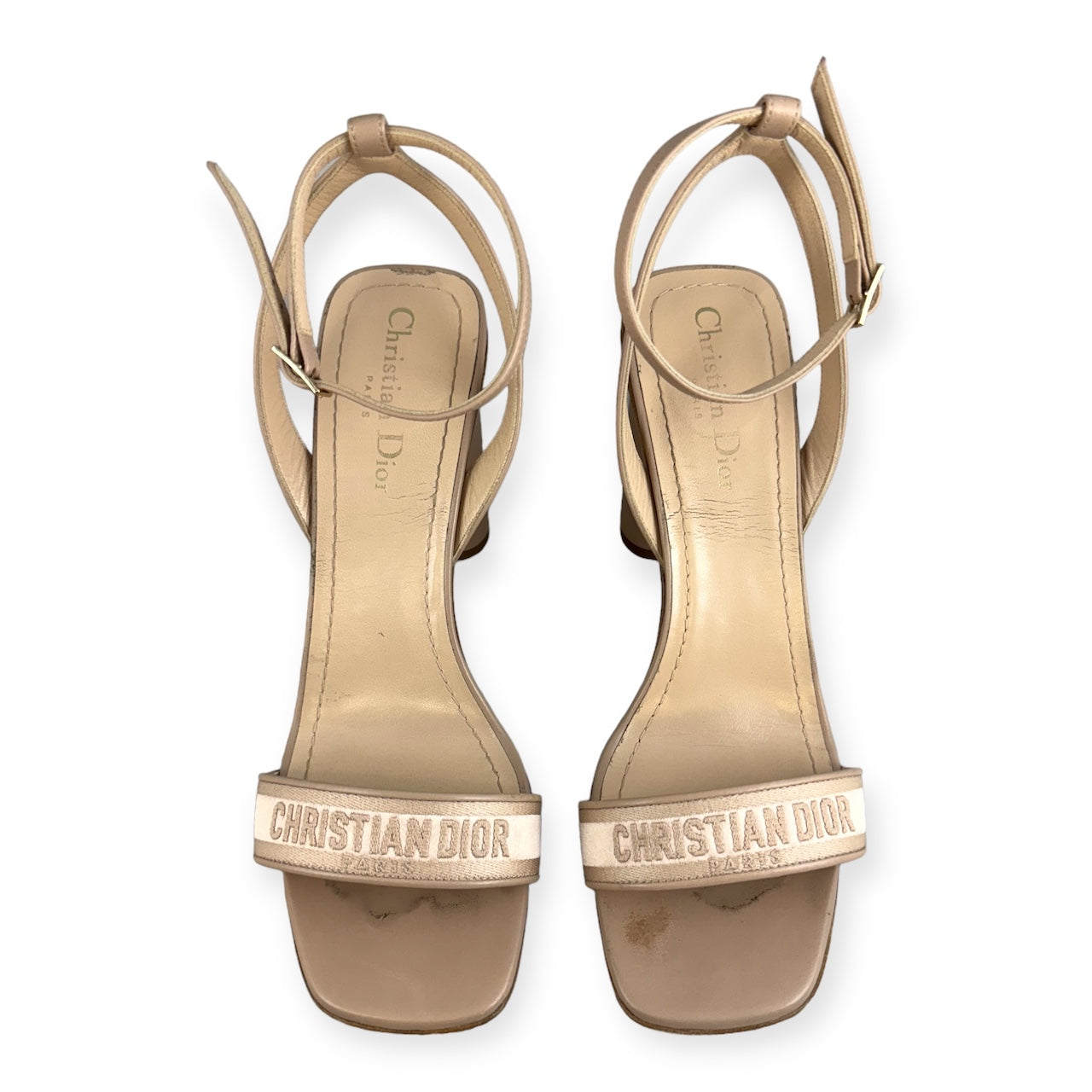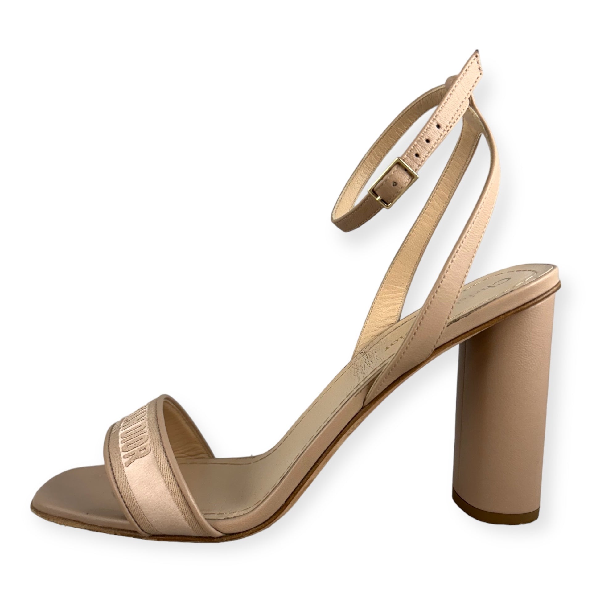 This is an authentic pair of DIOR Dway Sandals in Nude. These sandals are crafted of leather with soft gold-toned hardware. They feature a square toe, a satin upper strap embroided with the Christian Dior Logo, a 4 inch block heel, and an ankle buckle closure.