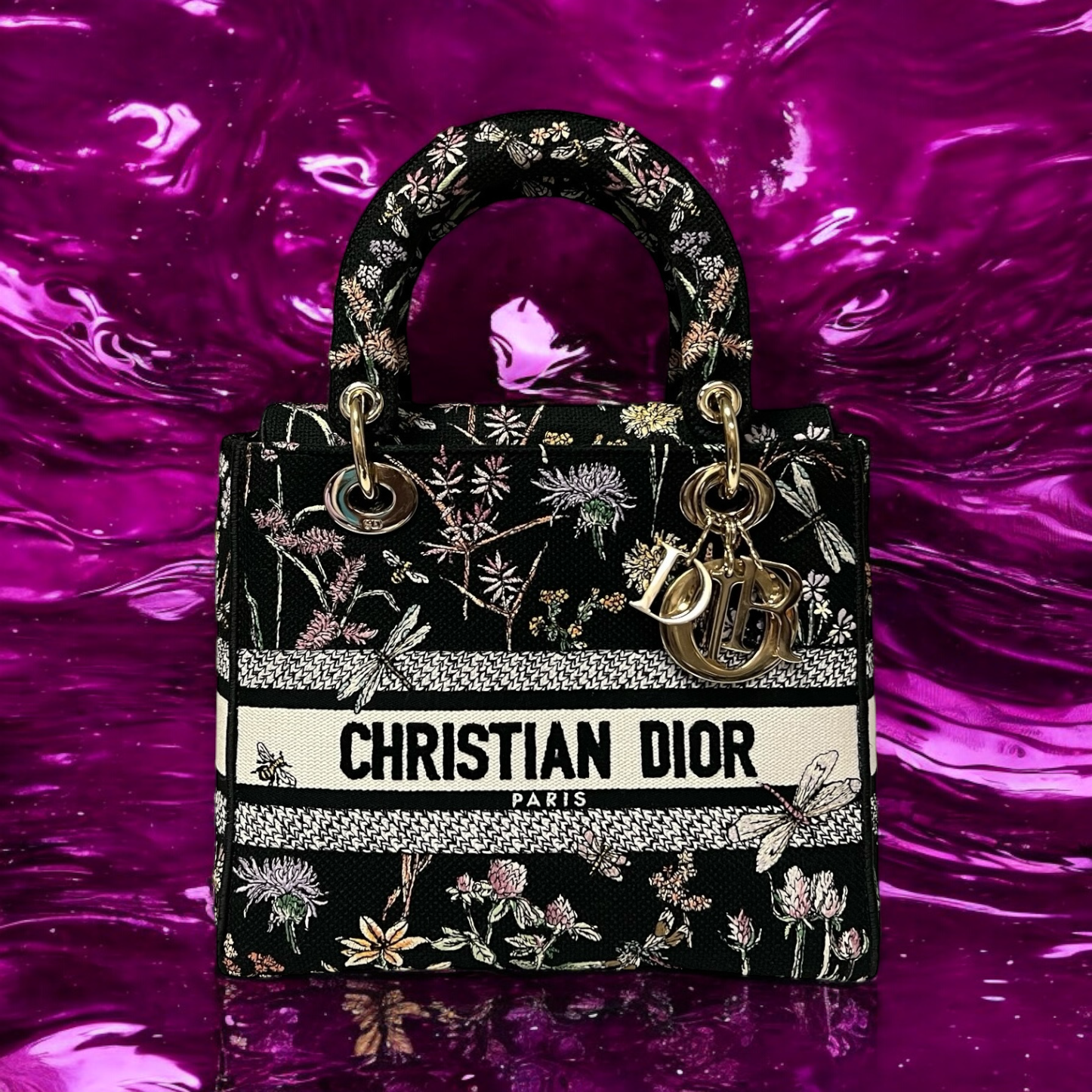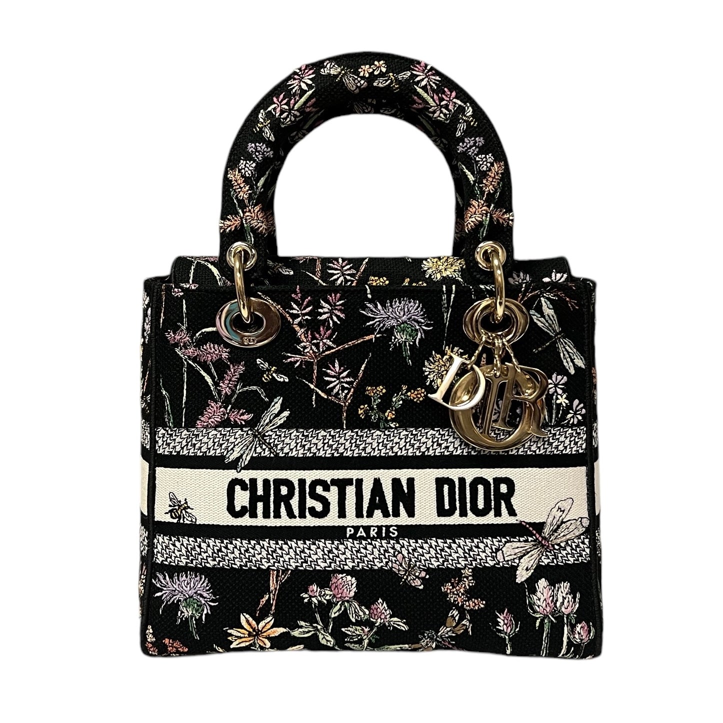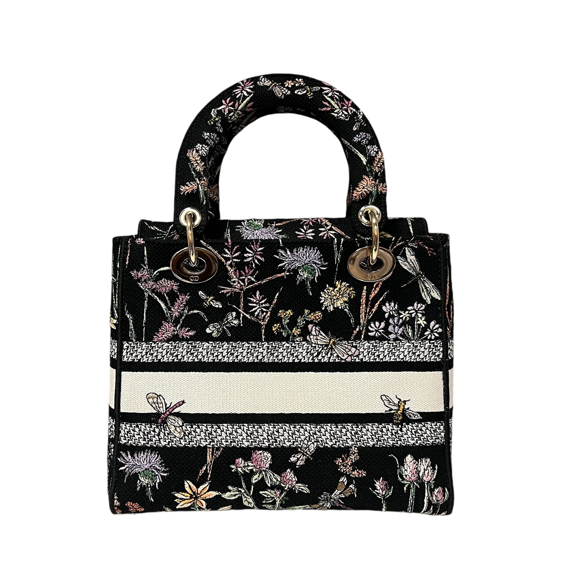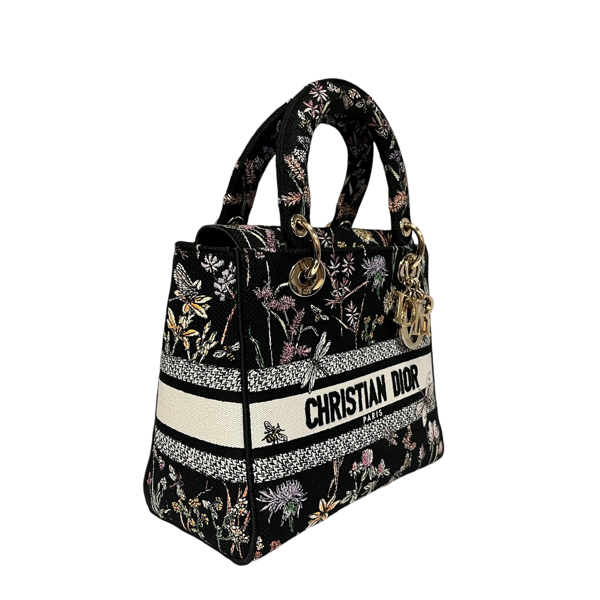 The Lady D-Lite Bag is a perfect blend of timeless elegance and modern sophistication, paying tribute to Christian Dior's deep love for nature. This medium-sized bag is fully embroidered with the black multicolor Dior Herbarium motif, a vibrant pattern featuring an enchanting collection of wild plants, flowers, dragonflies, and bees, all inspired by the House's archives.