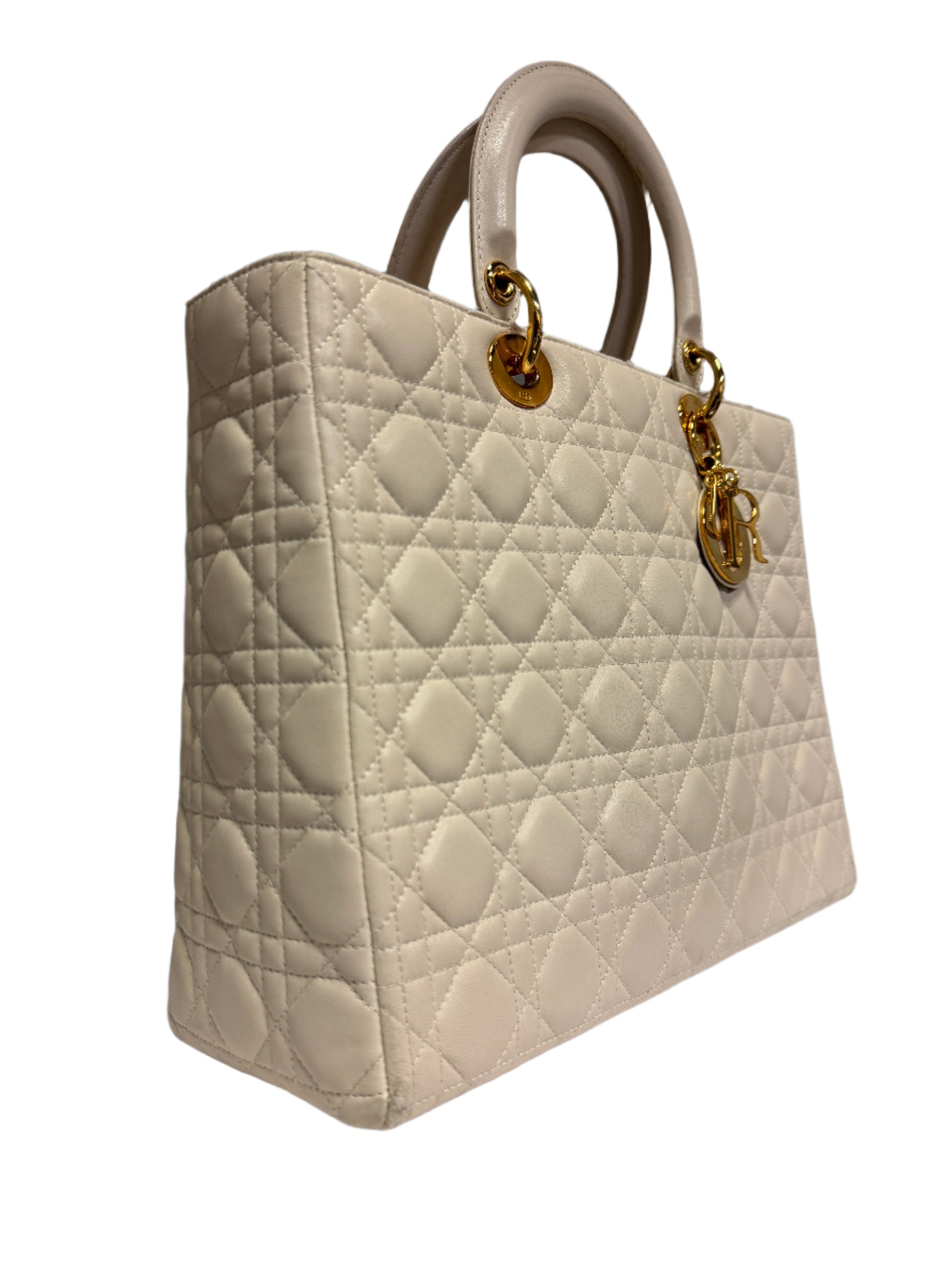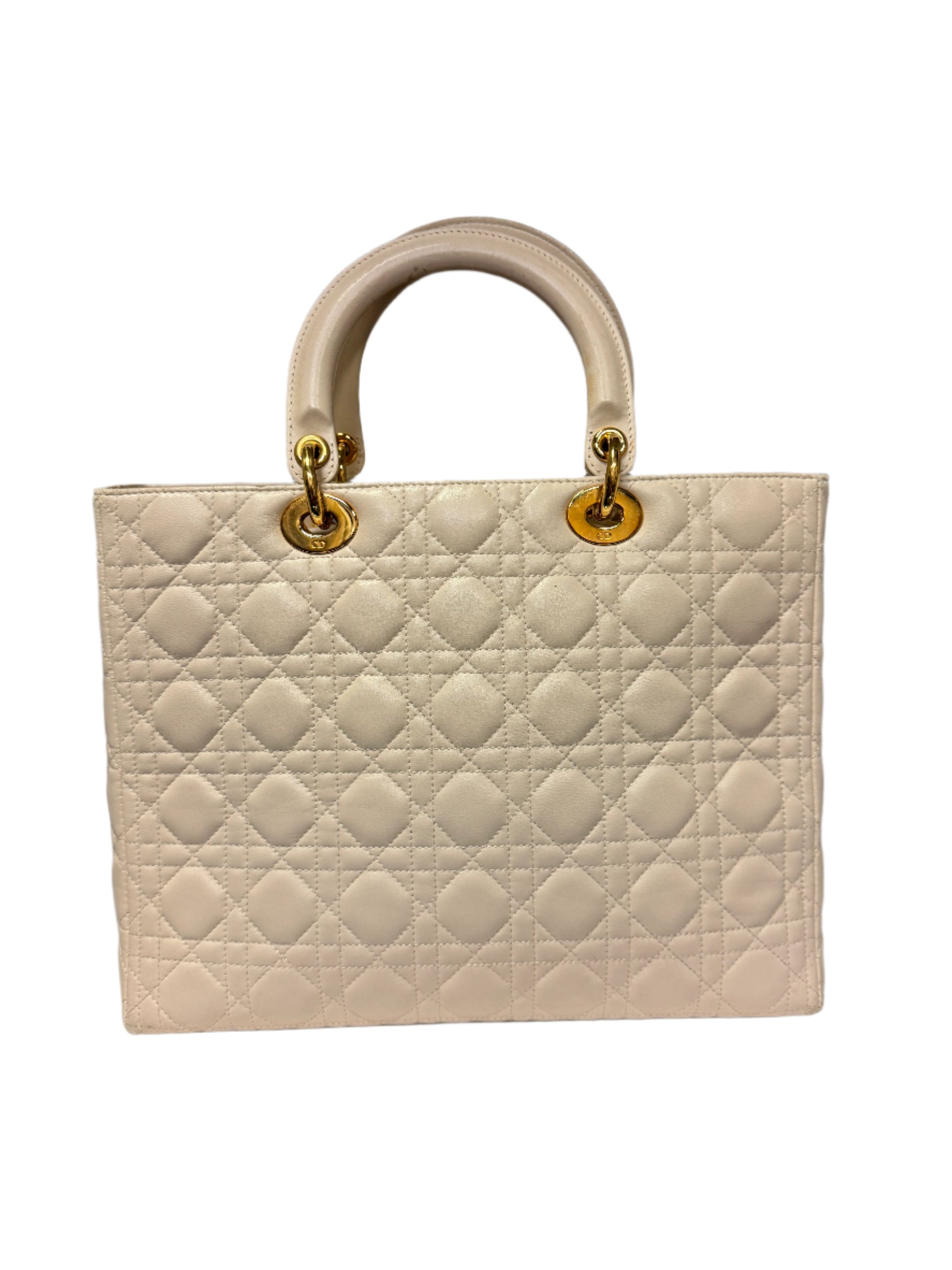 This is an authentic DIOR Lady Dior Large Tote in the color cream. This bag features gold hardware and a removeable shoulder strap.