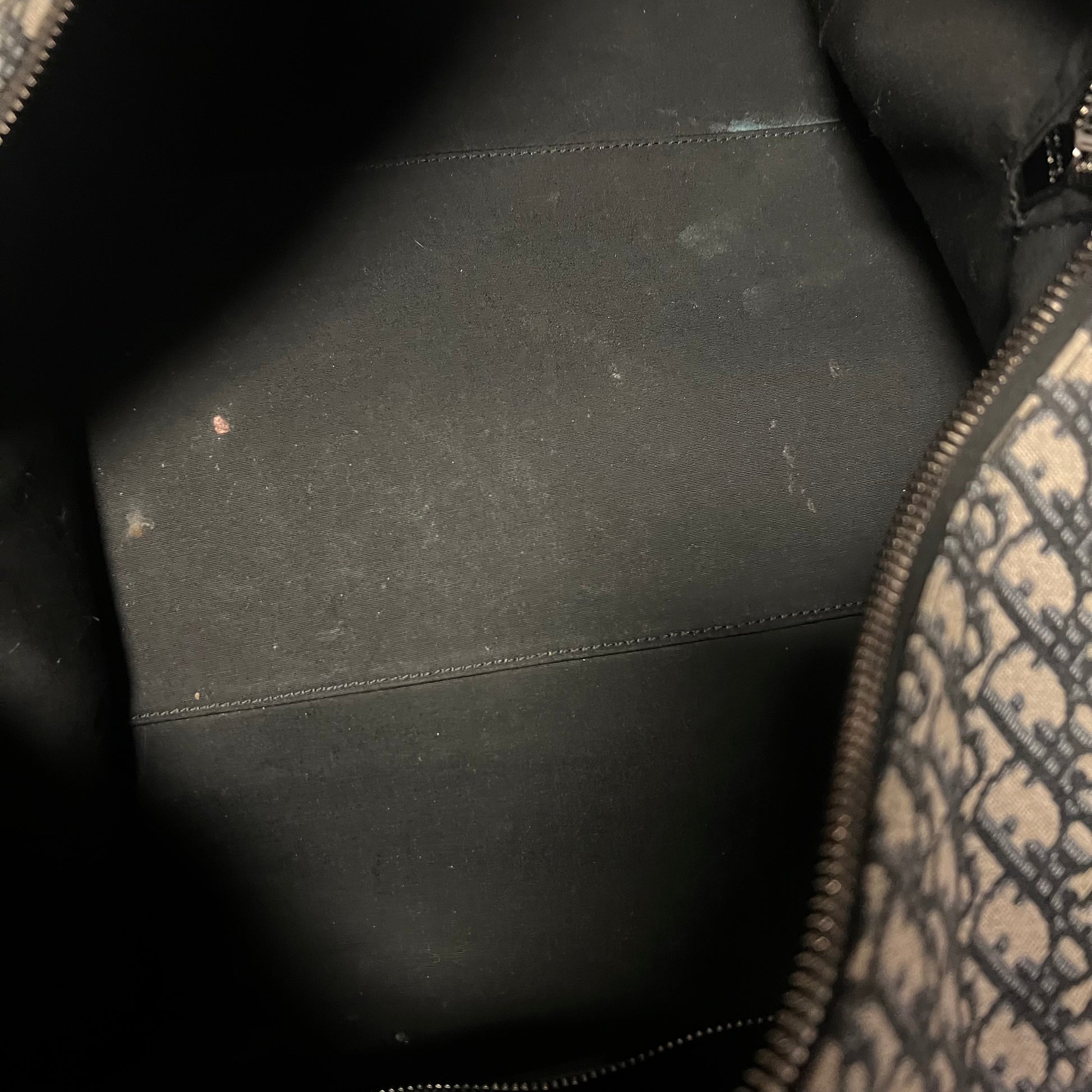 This is an authentic DIOR Oblique Weekender bag featuring black grain calfskin leather details, 2 top handles, an adjustable and removable strap, an interior zipper pocket, an all over jacquard pattern, and silver toned hardware.