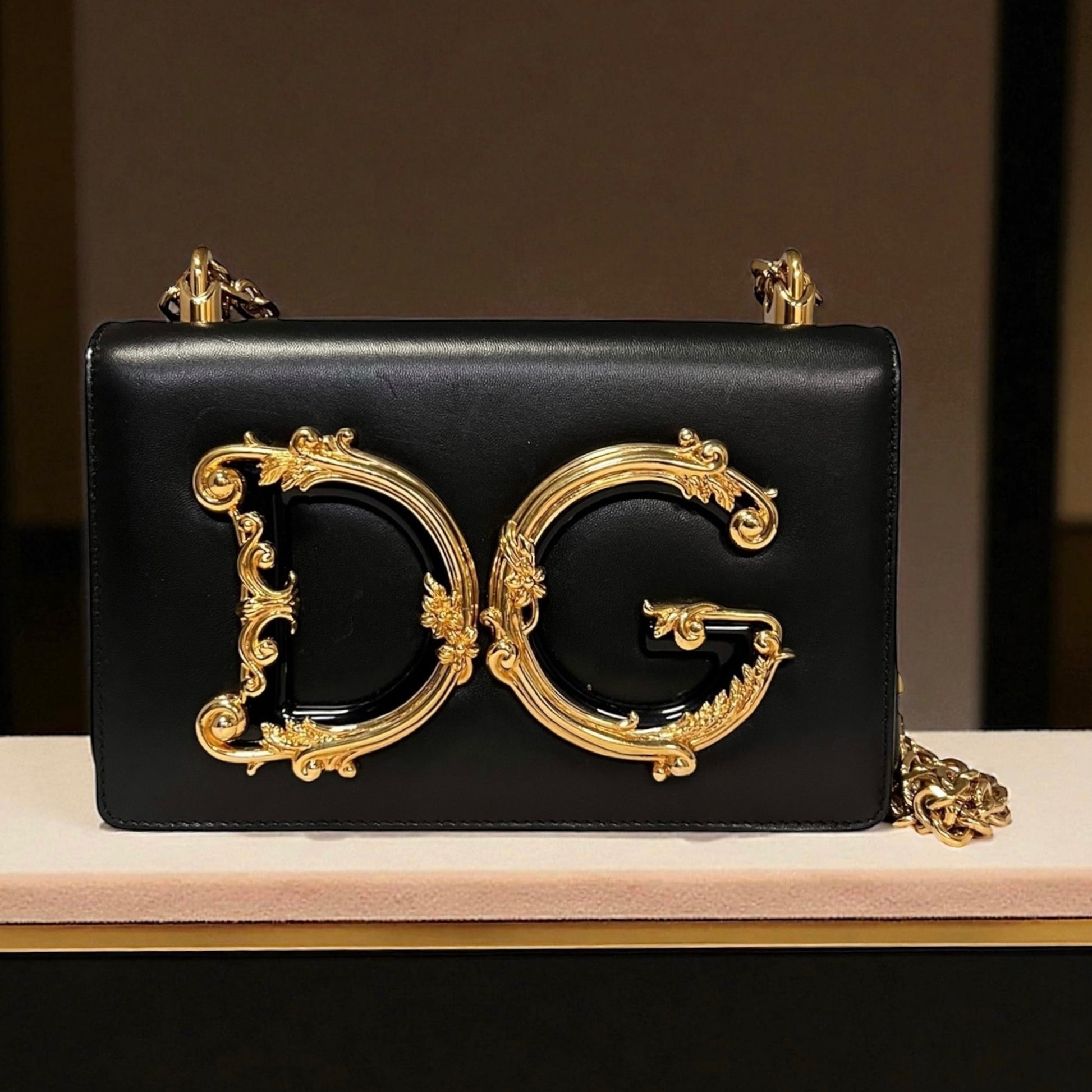 This authentic DOLCE & GABBANA D&G Girls Shoulder Bag in black leather with gold toned hardware features a flap snap closure, a convertible crossbody shoulder chain strap, a baroque monogram on the front, and matching black leather interior lining.