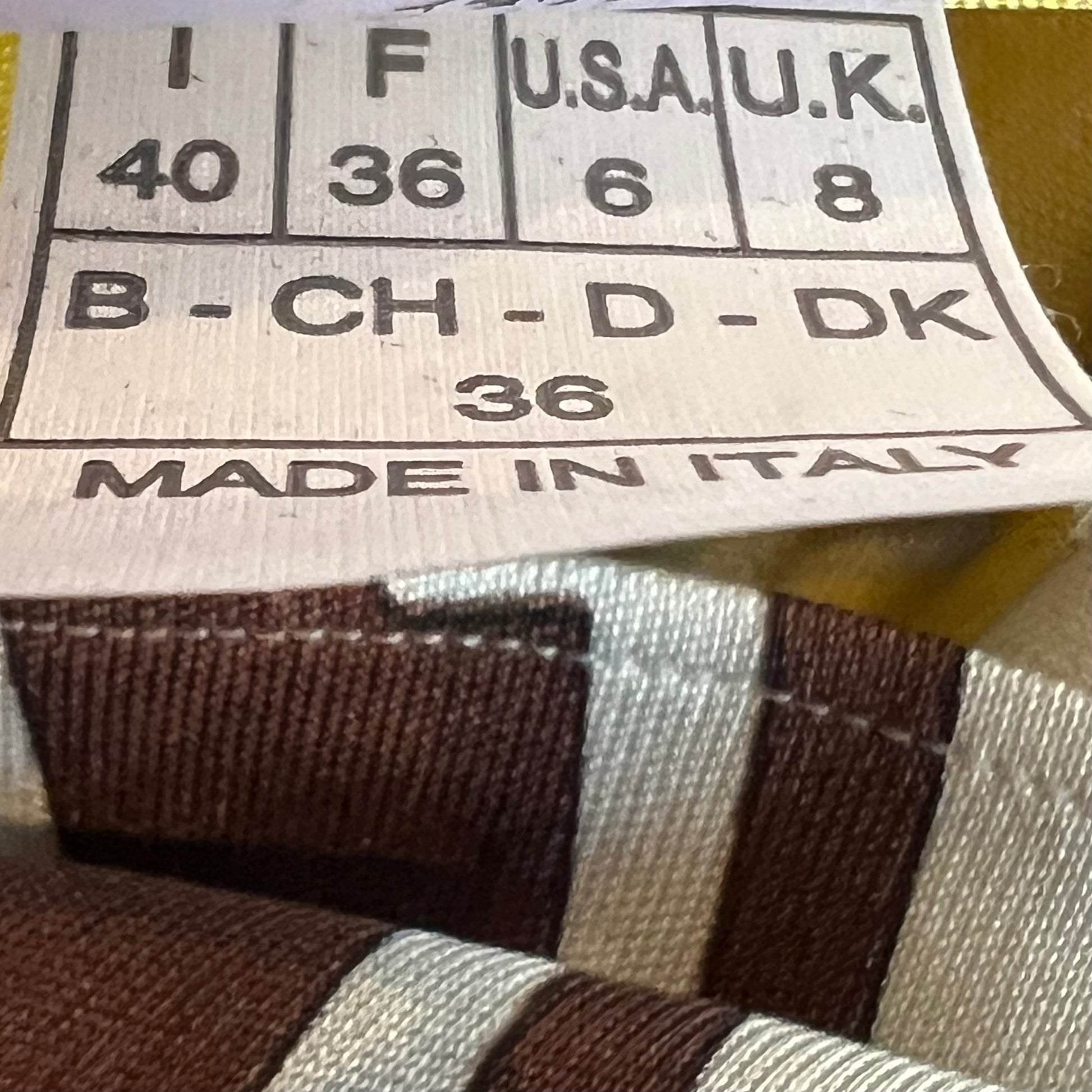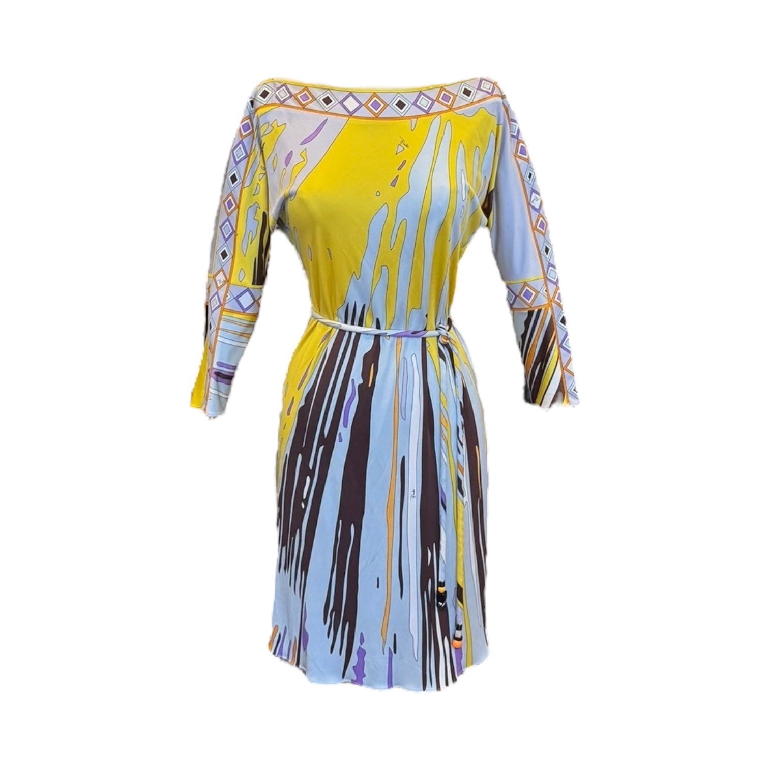 This EMILIO PUCCI Drip Print Silk Jersey Dress in yellow, silver gray, purple, orange, white, brown and ice blue 100% silk features a boatneck, three quarter sleeves, and a coordinating belt with bead embellished ends.