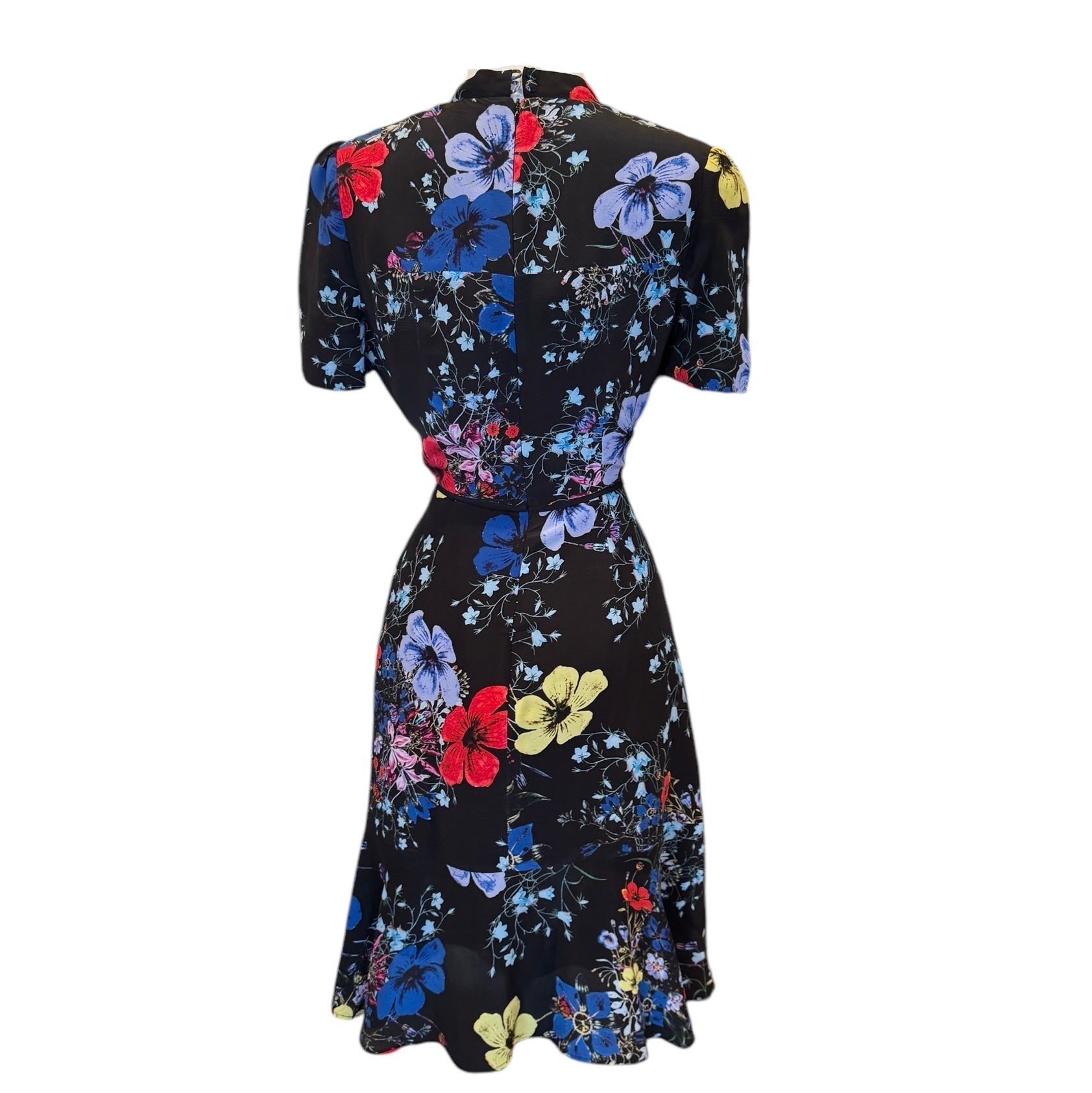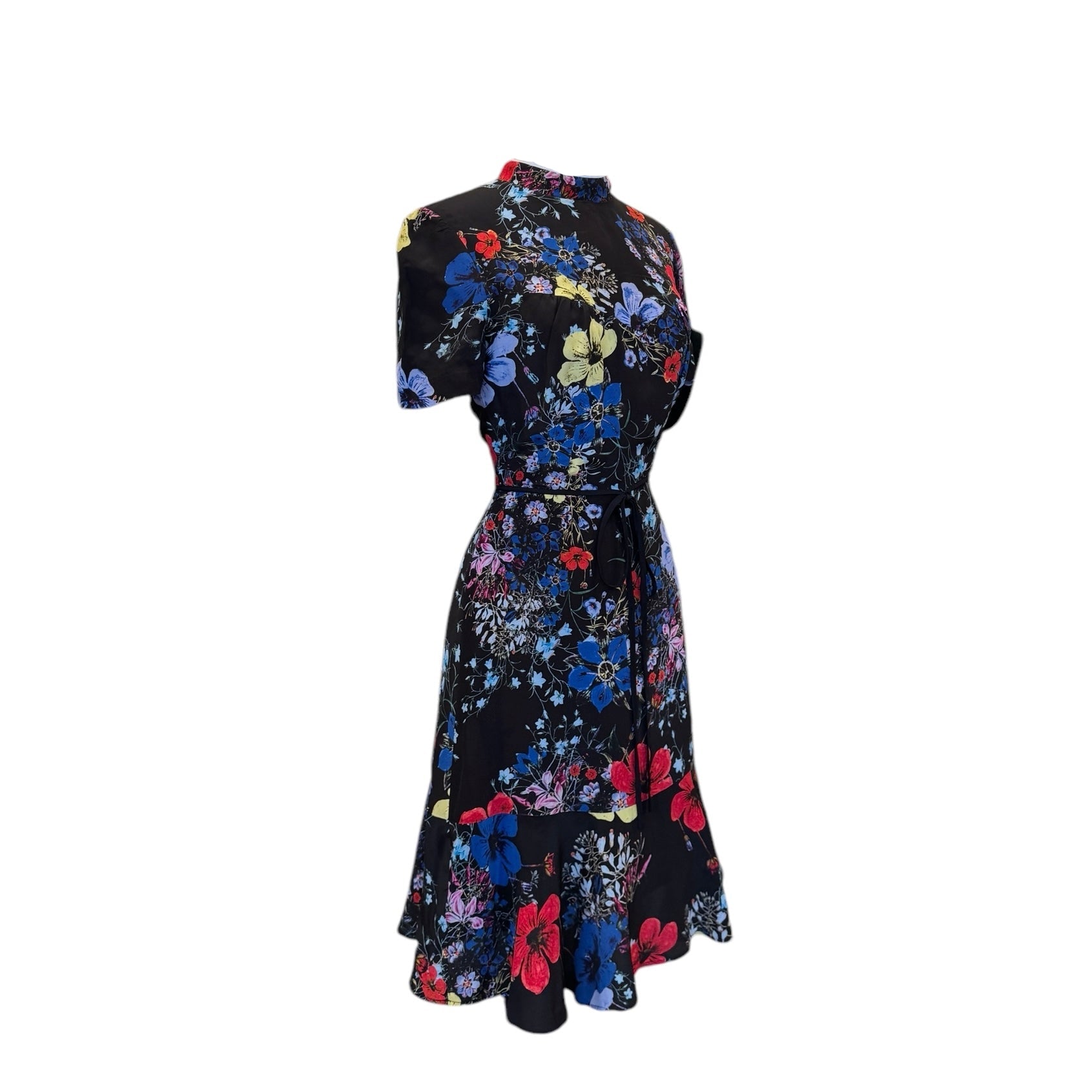 This authentic ERDEM Floral dress in black and multi-colored flowers comes with an attached belt, has a high neckline and a flowy skirt.
