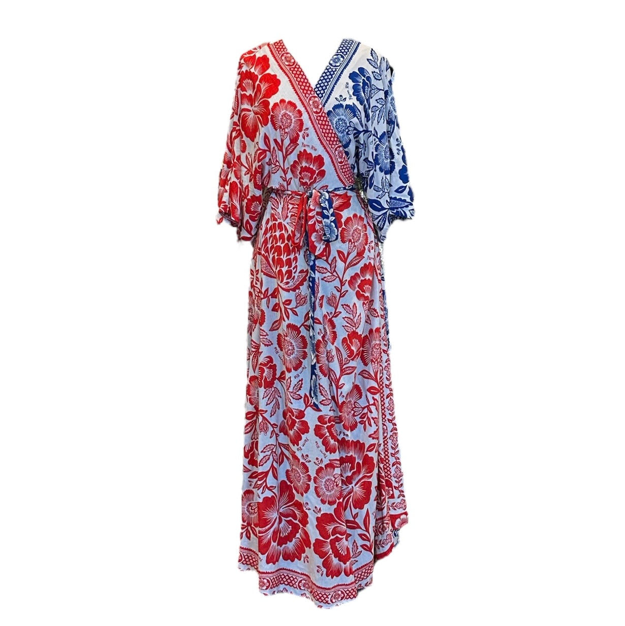 This is an authentic FARM RIO Floral Dress in red and blue. This dress features floral designs throughout the dress, a wrap style that opens up fully, with a belt to tie it closed.