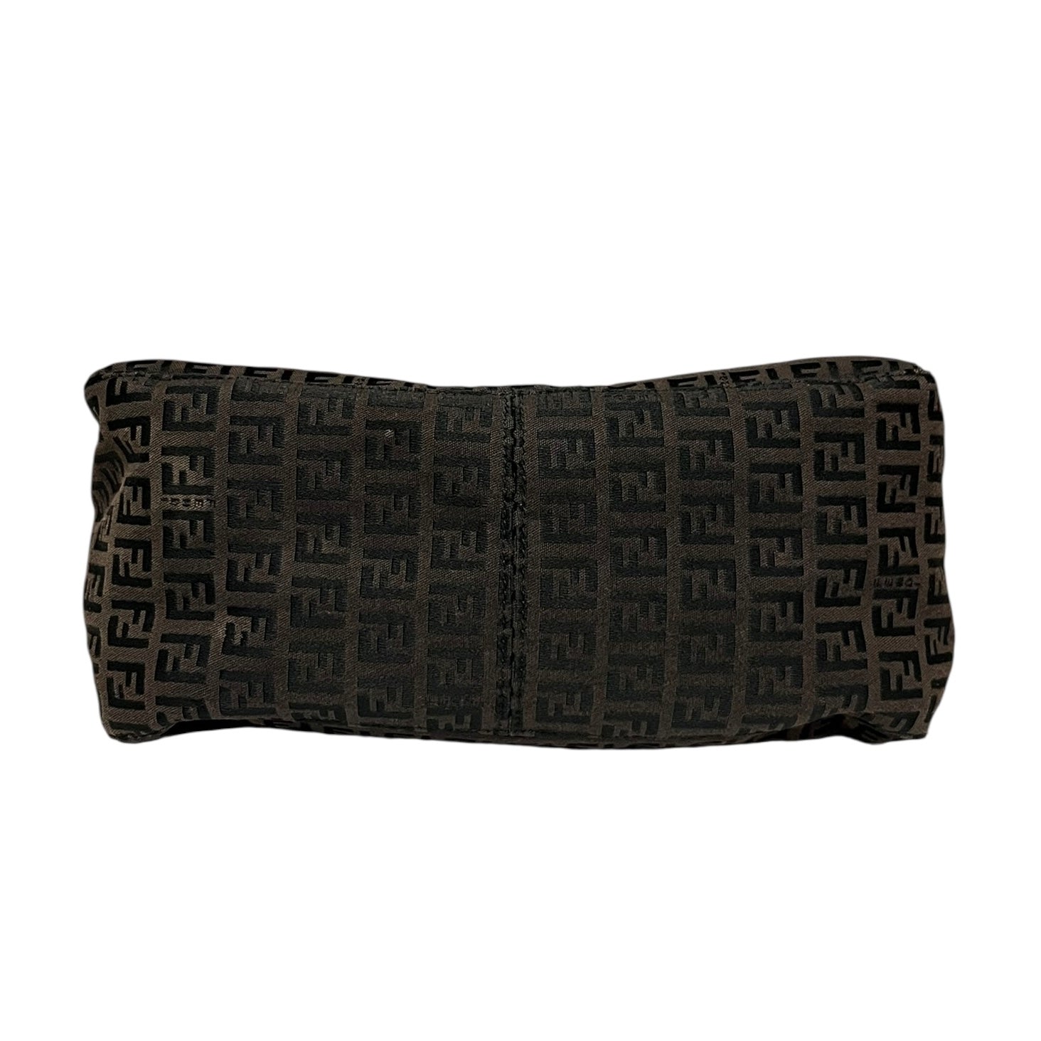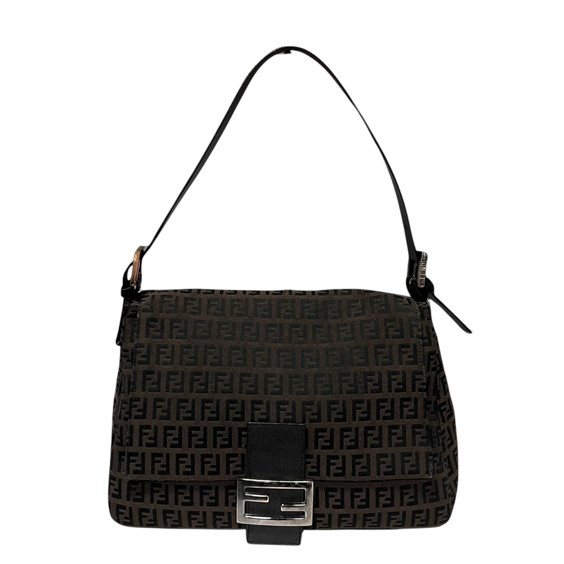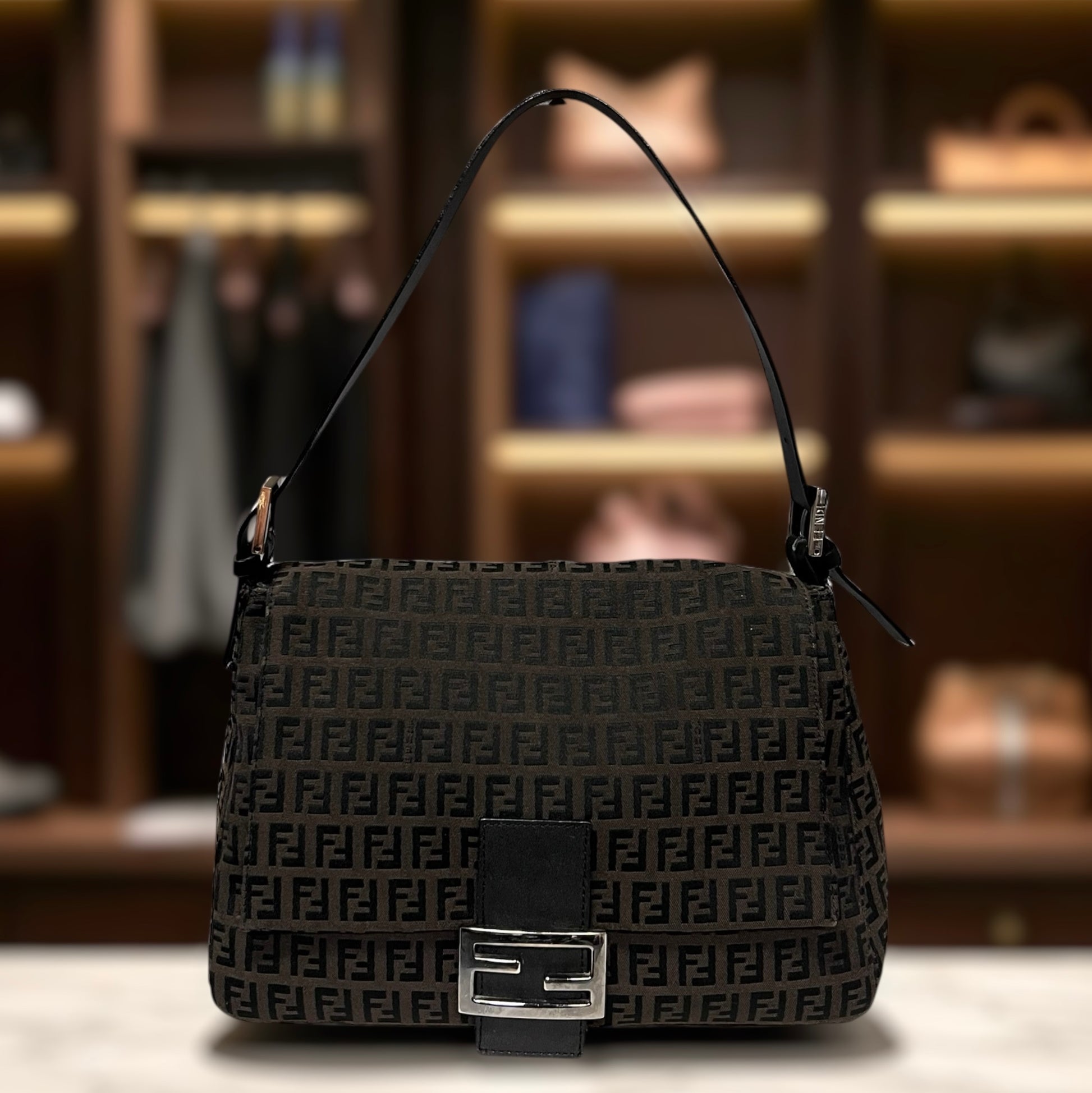 This authentic FENDI Mama Baguette bag is crafted in Zucca Logo Monogrammed canvas with dark brown leather and silver tone hardware and features an adjustable shoulder strap, a snap flap closure embellished with the iconic FENDI logo in silver hardware, one interior zipper pocket and dark brown interior fabric lining.