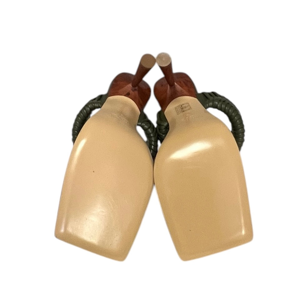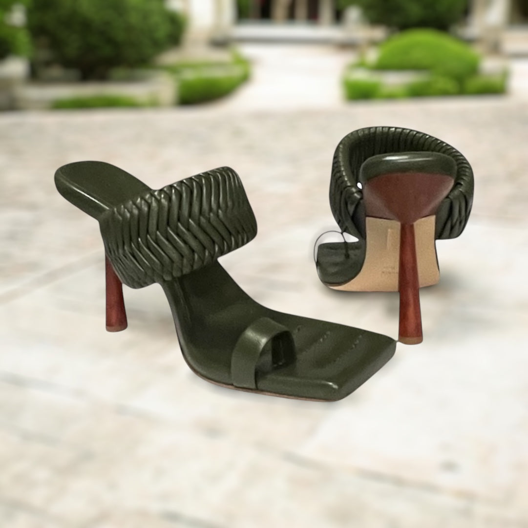 This is an authentic pair of GIA/RHW Braided Sandals in the color Olive. These sandals feature a toe strap and braided strap, leather lining, square toe, and a geometric heel.