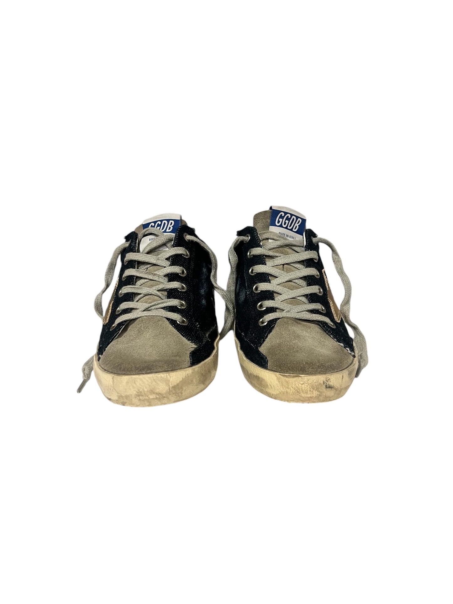 These authentic Golden Goose Sabot Mules in dark blue denim and gray suede feature the iconic star in silver, distressed white rubber soles and gray laces.