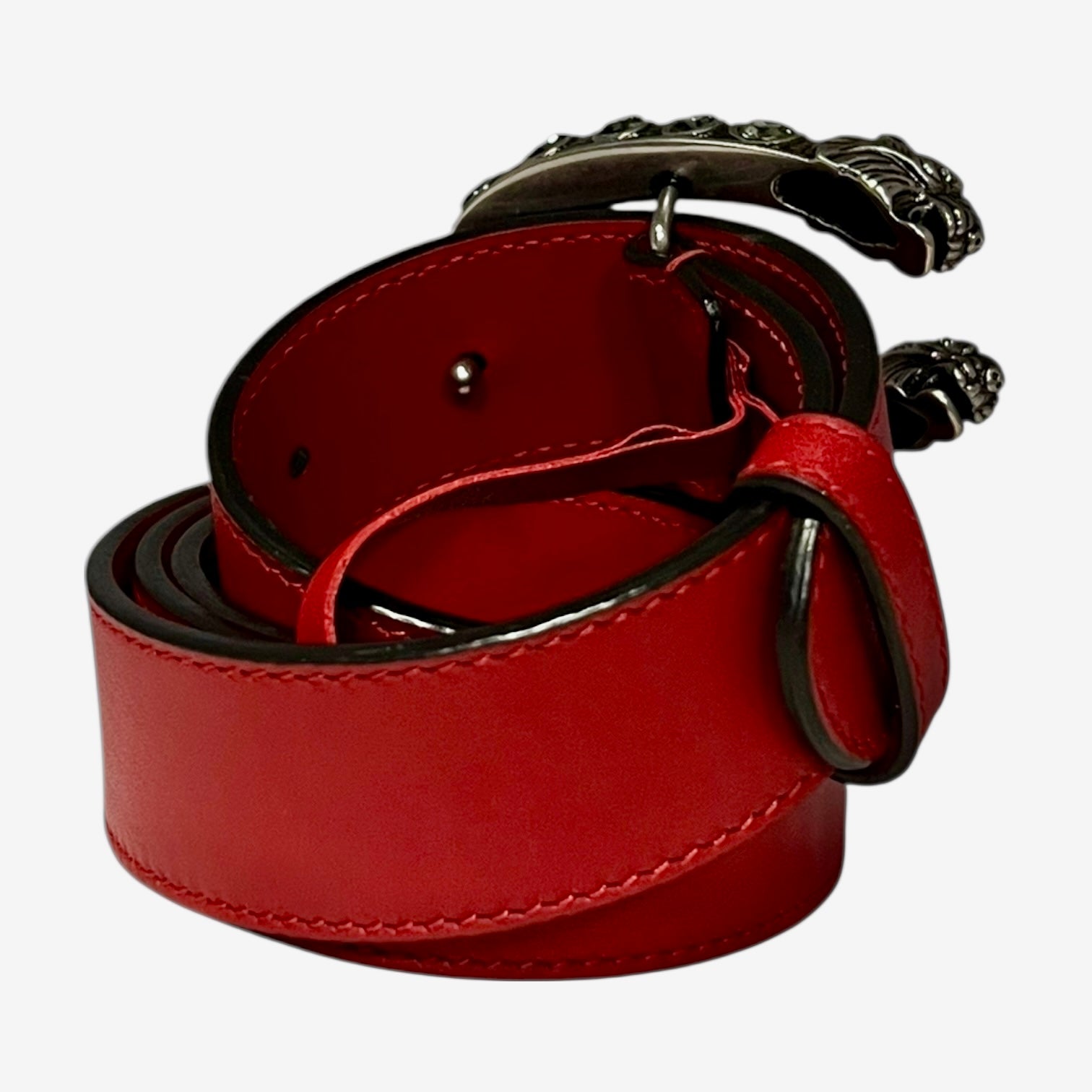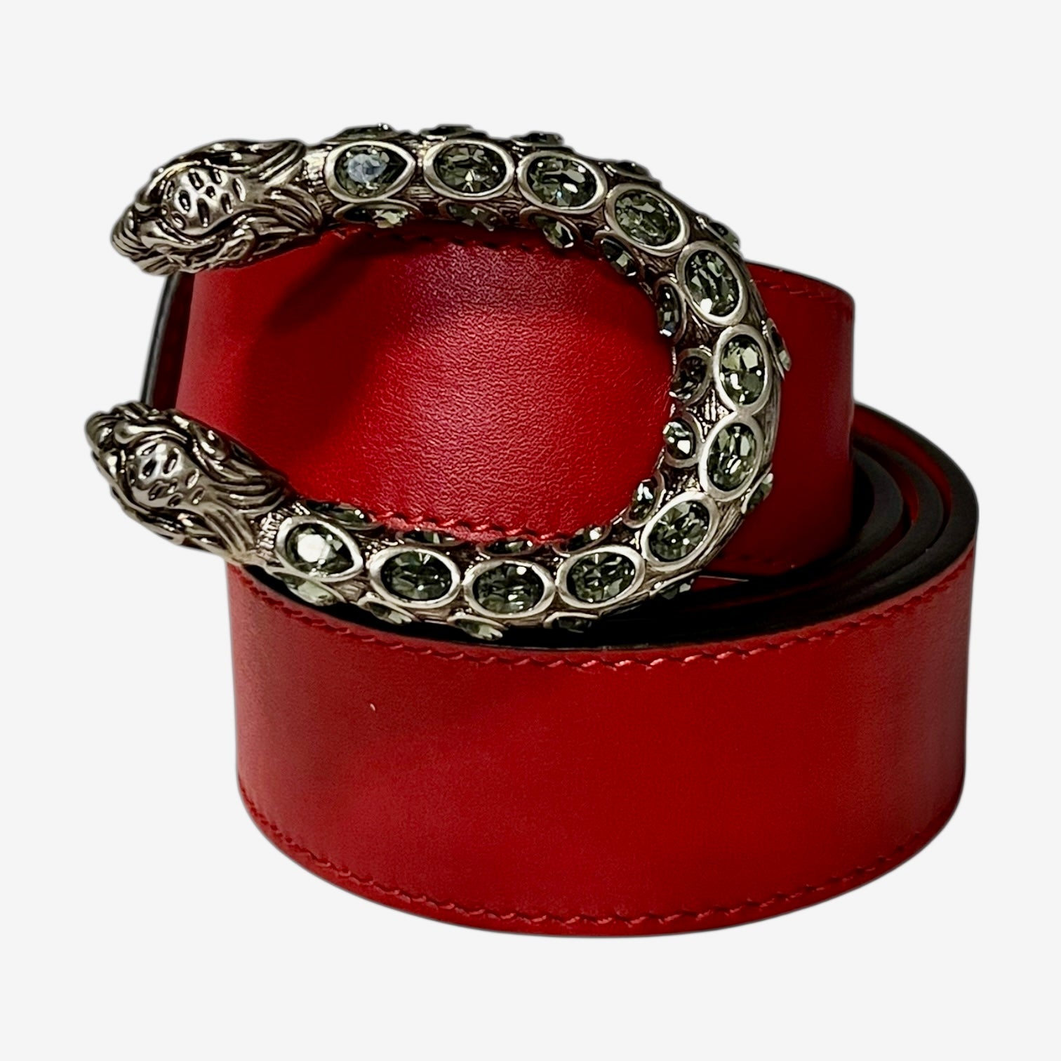 This authentic GUCCI Special Edition Dionysus Belt in read leather with antiqued silver toned hardware features the iconic Dionysus buckle embellished with smokey oval shaped crystals.