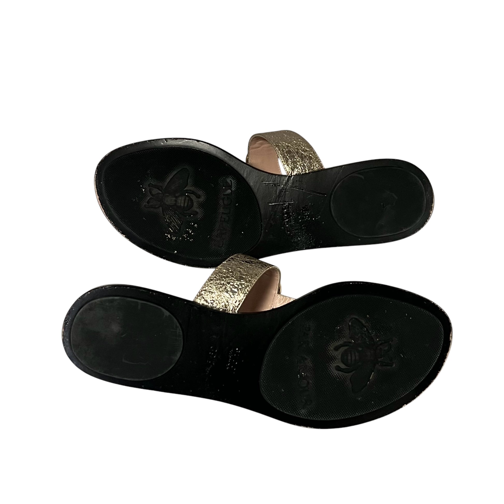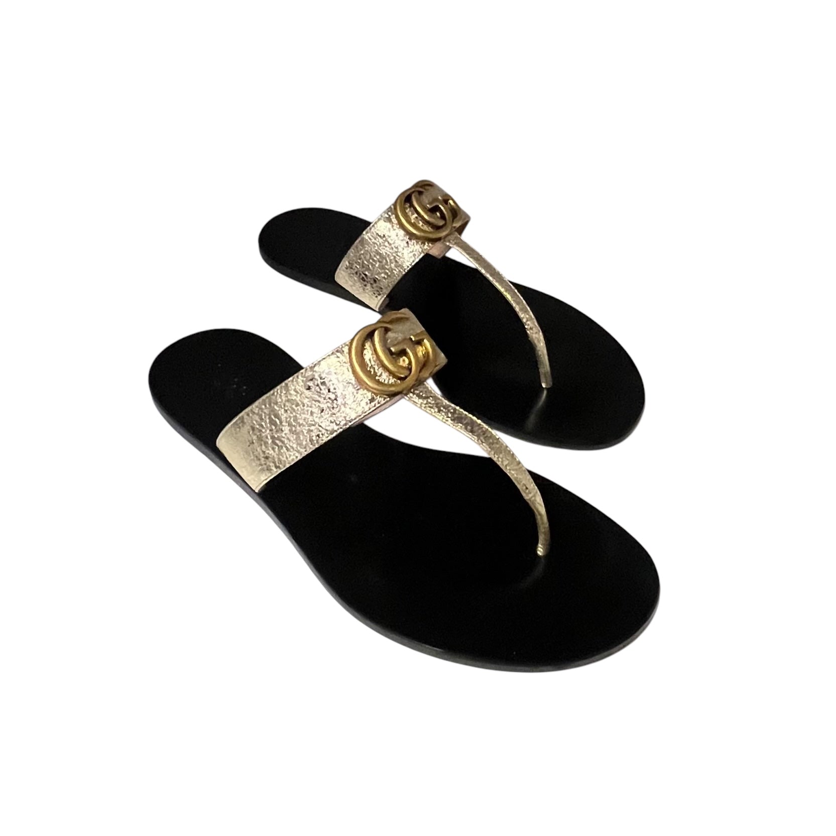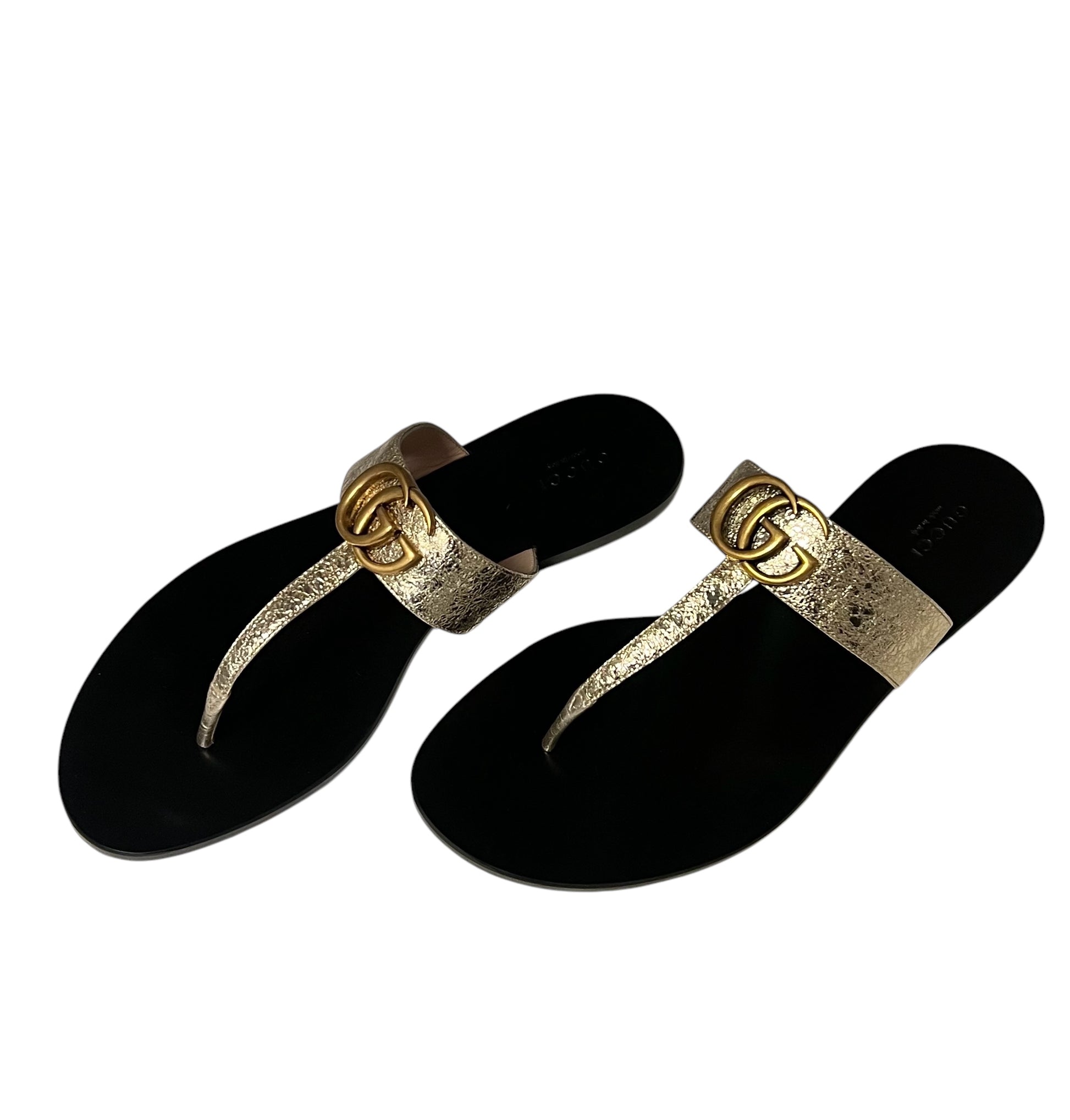 This authentic pair of GUCCI GG Marmont Flip Flop Sandals in gold foil leather feature the iconic monogram in gold toned hardware , a black leather as well as a 1 cm heel.