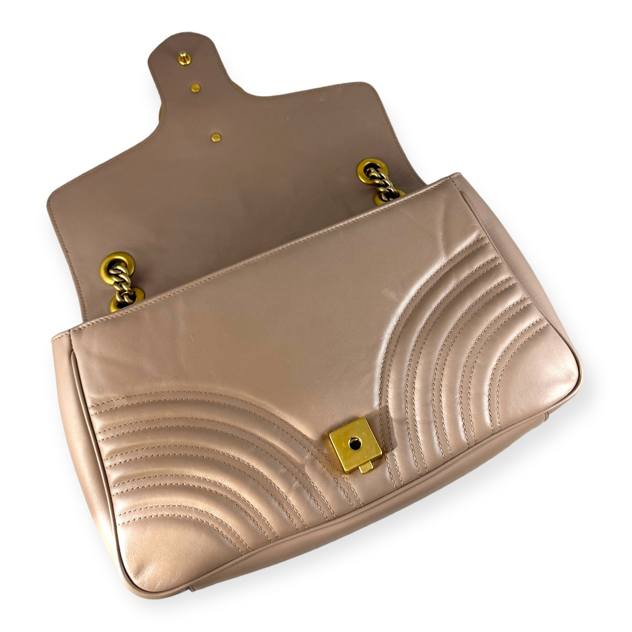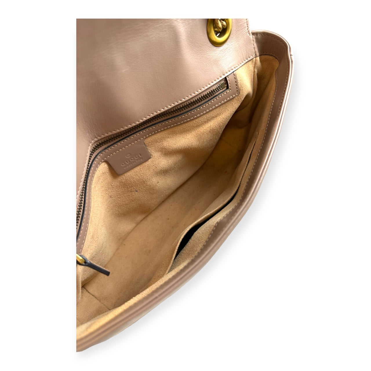 This is an authentic GUCCI GG Marmont Shoulder Bag in Porcelain Rose. This bag is crafted of chevron quilted leather with aged gold-toned hardware. It features a chain link shoulder strap, a front crossover flap adorned with the iconic GG, a push-lock closure, and a beige microfiber interior with one zipper pocket and one patch pocket.