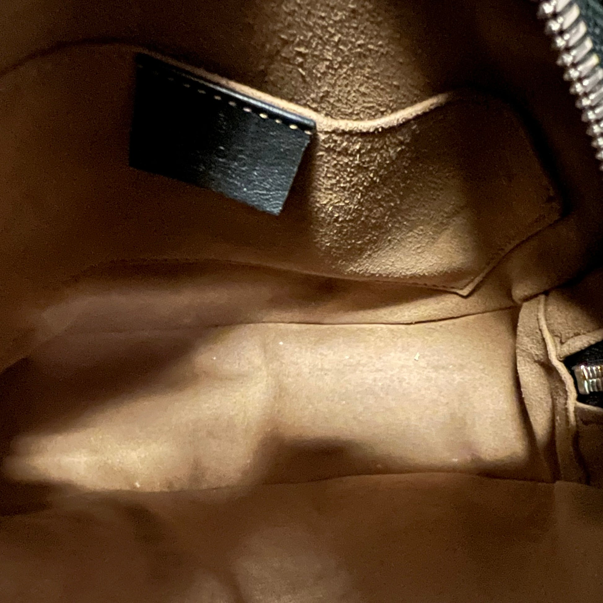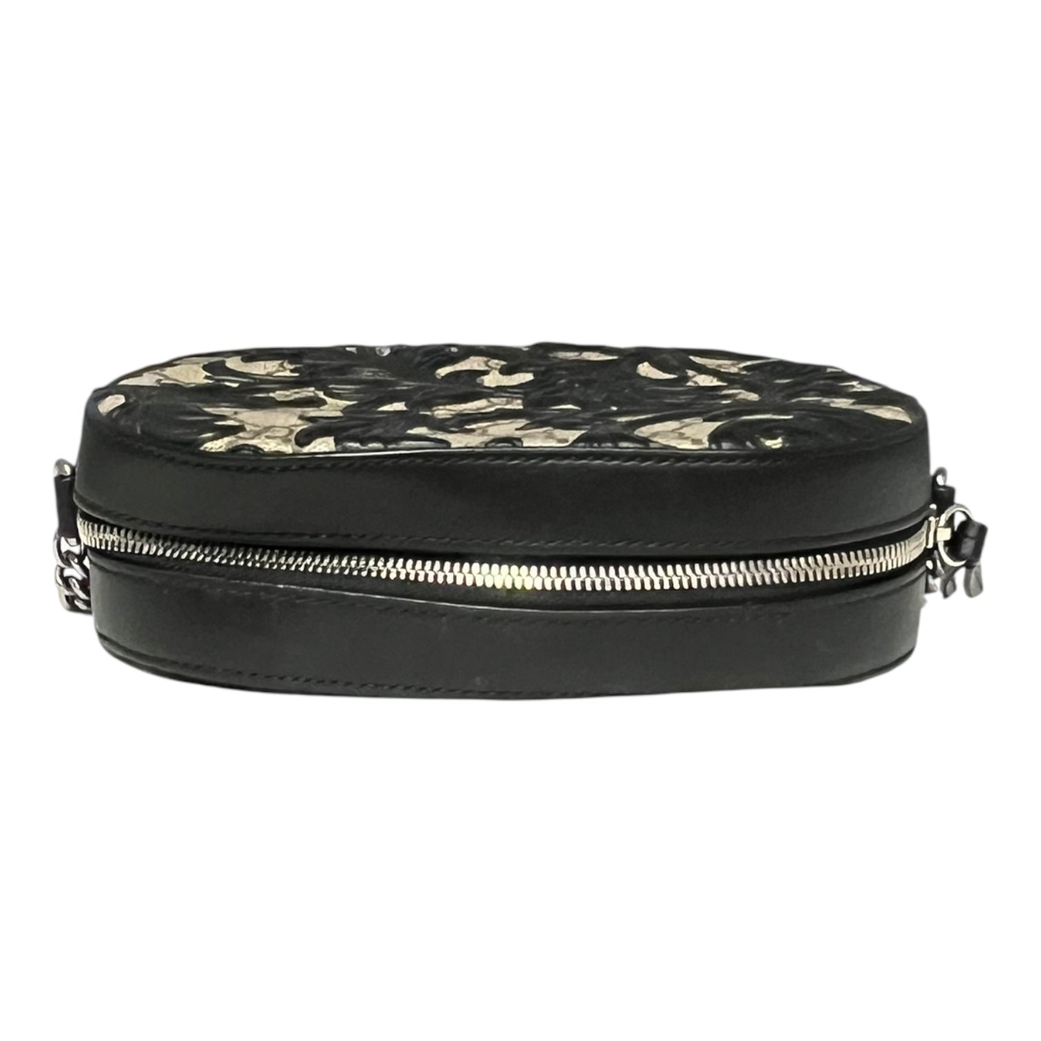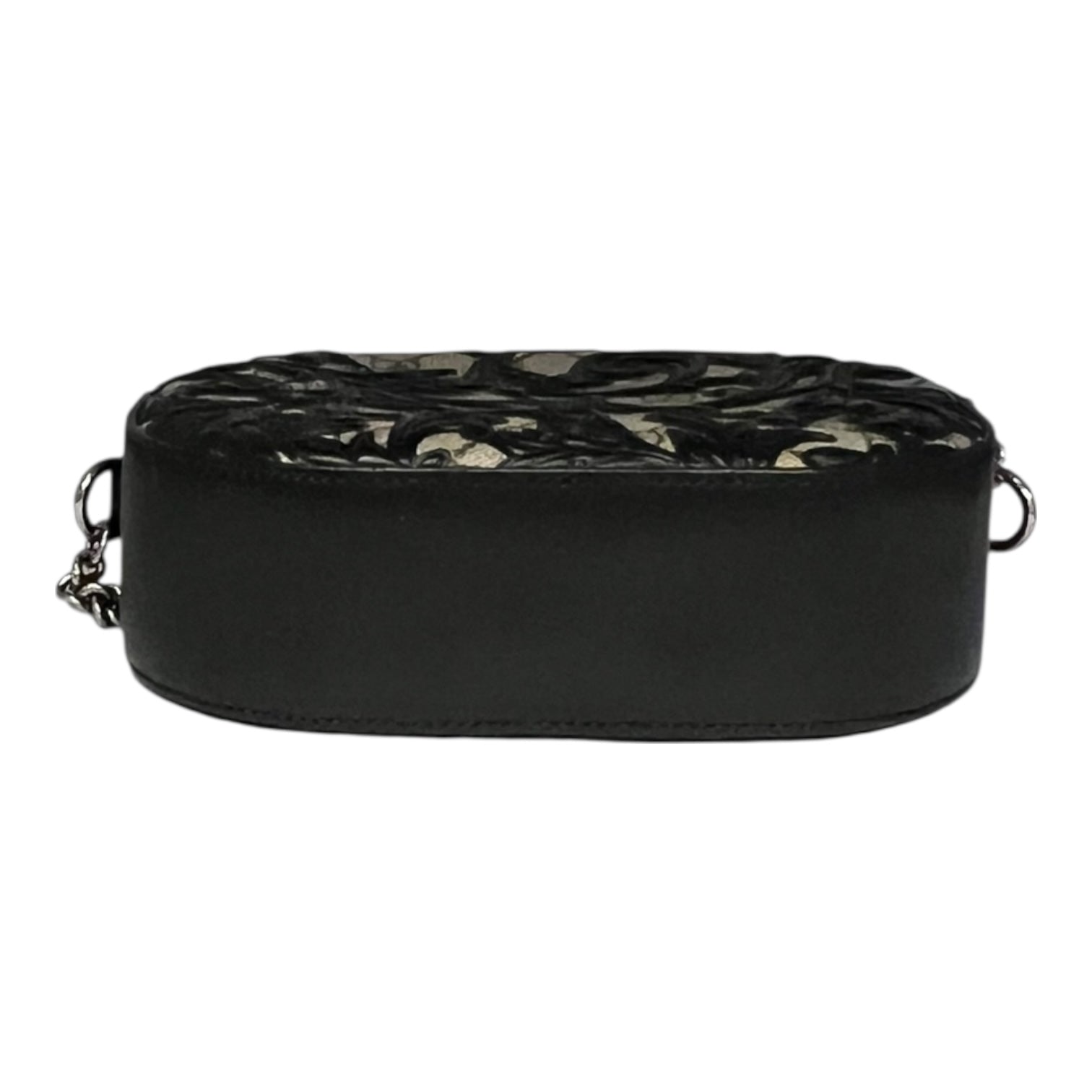This authentic GUCCI GG Supreme Arabesque Mini Chain bag in brown GG monogram canvas embellished with floral black leather and black leather trim and silver toned hardware features a zipper closure, chain link and leather crossbody shoulder strap, tan interior lining, and one interior zipper pocket.