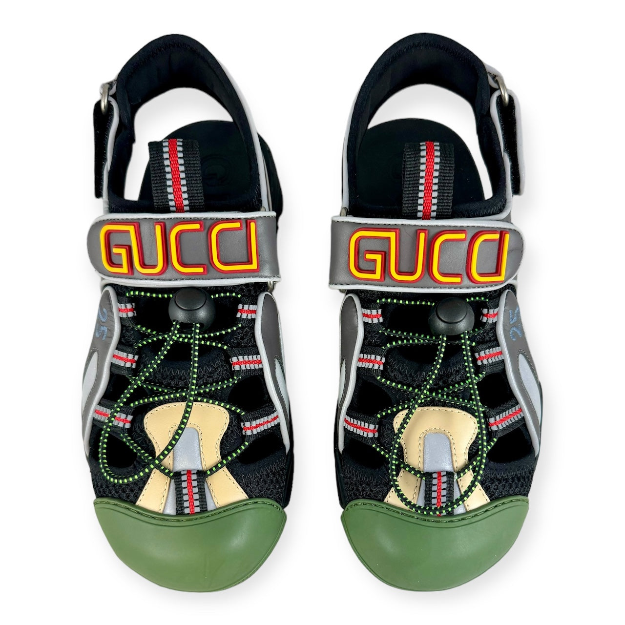 This is an authentic pair of GUCCI Tinsel Sport Sandals Multicolor. These stylish sandals are made of mesh, leather and rubber with silver-toned hardware. They feature a round, green cap toe, a drawstring upper with a Logo embossed velcro closure, a removable tinsel Logo jewel charm, a thick rubber sole, and a velcro closure at the heel.