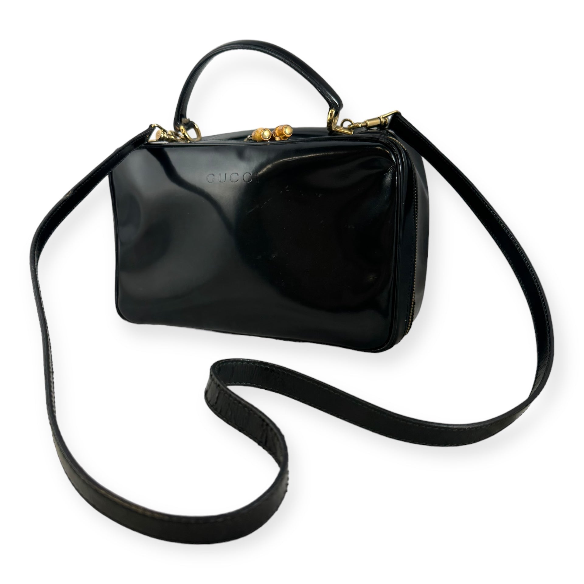 This is an authentic GUCCI Vintage Bamboo Top Handle Bag in Black. This vintage bag is expertly made with high-quality leather and luxurious gold-toned hardware. It includes a comfortable top handle, a removable shoulder strap, a secure top zipper closure with signature bamboo zipper pulls, and a stylish black leather interior with a convenient zipper pocket.