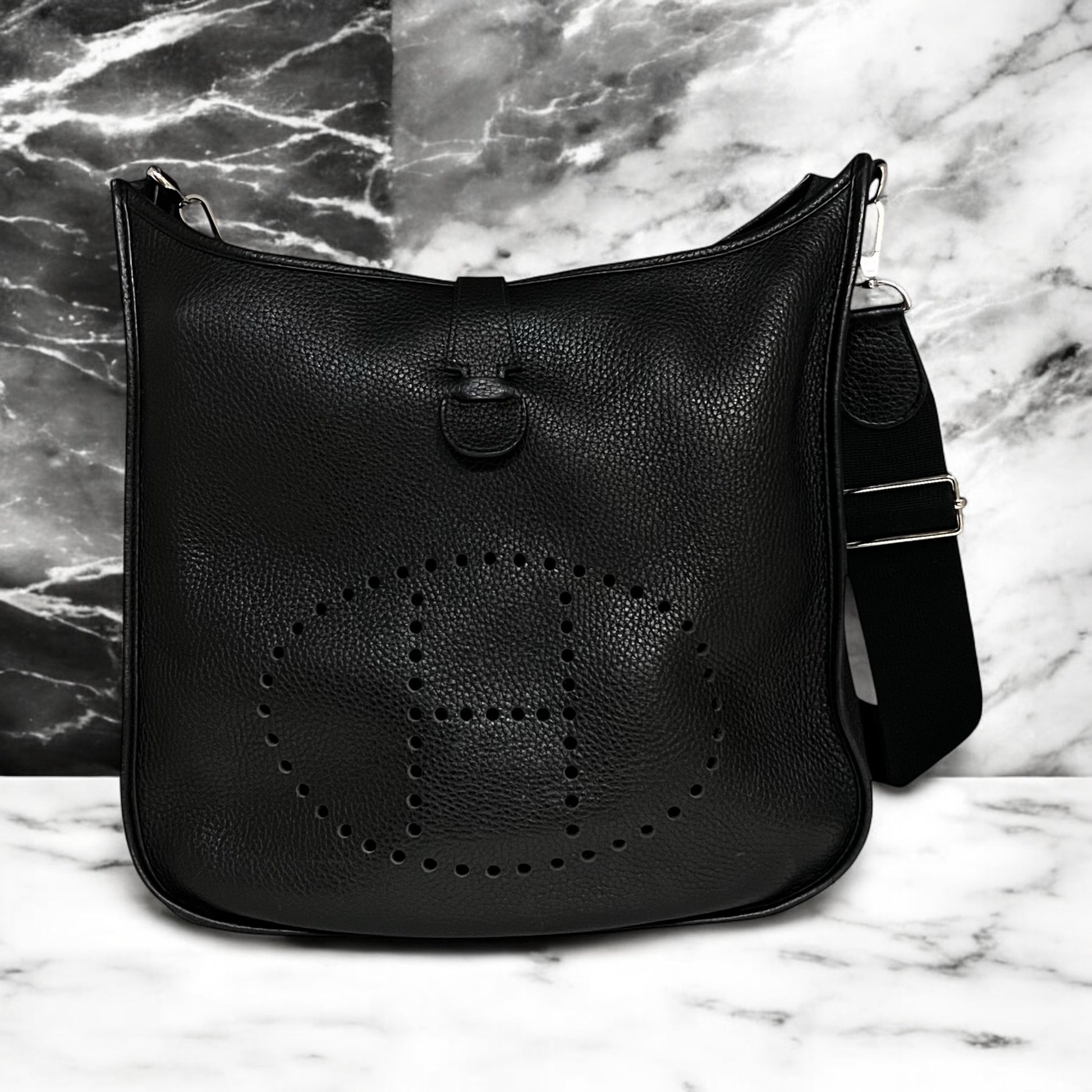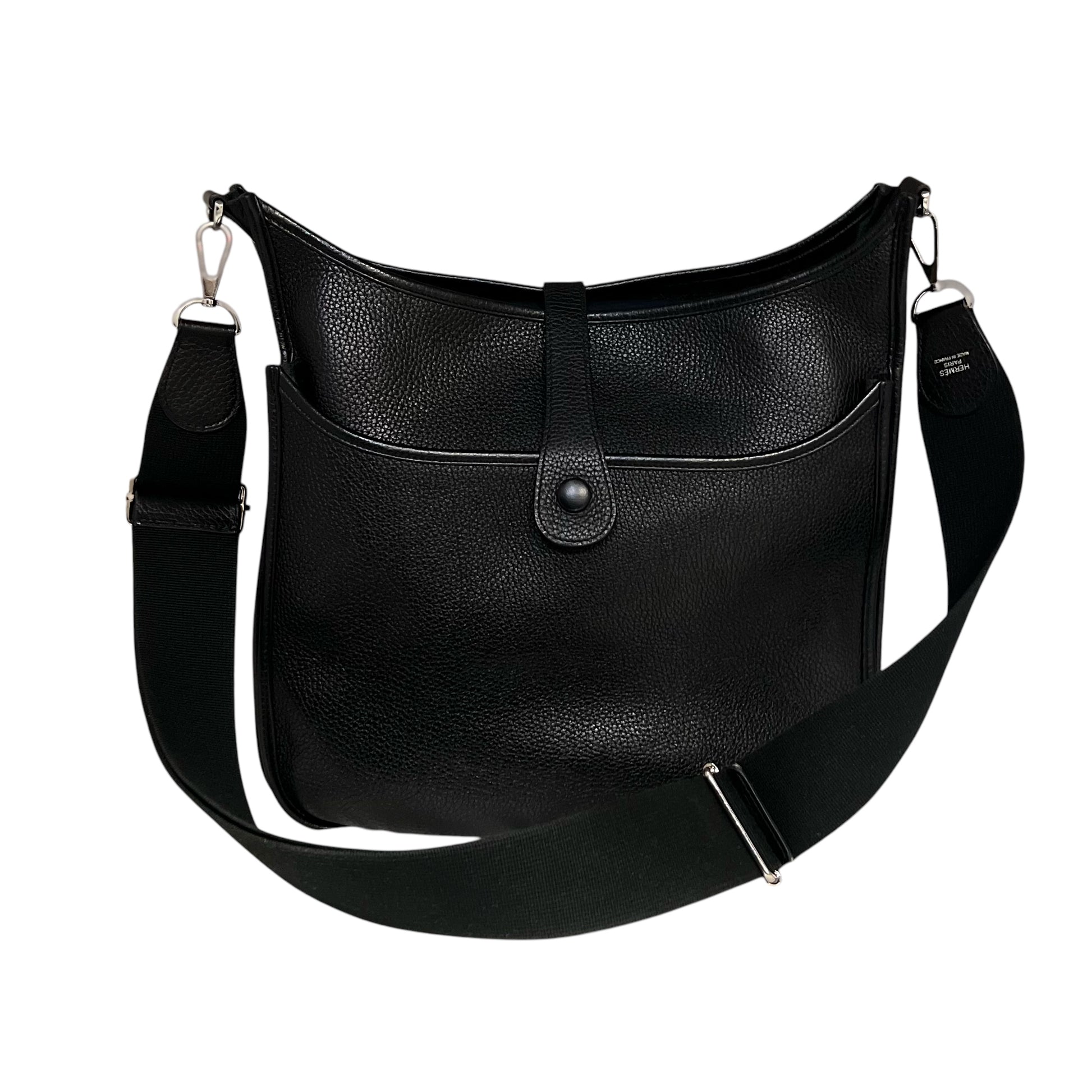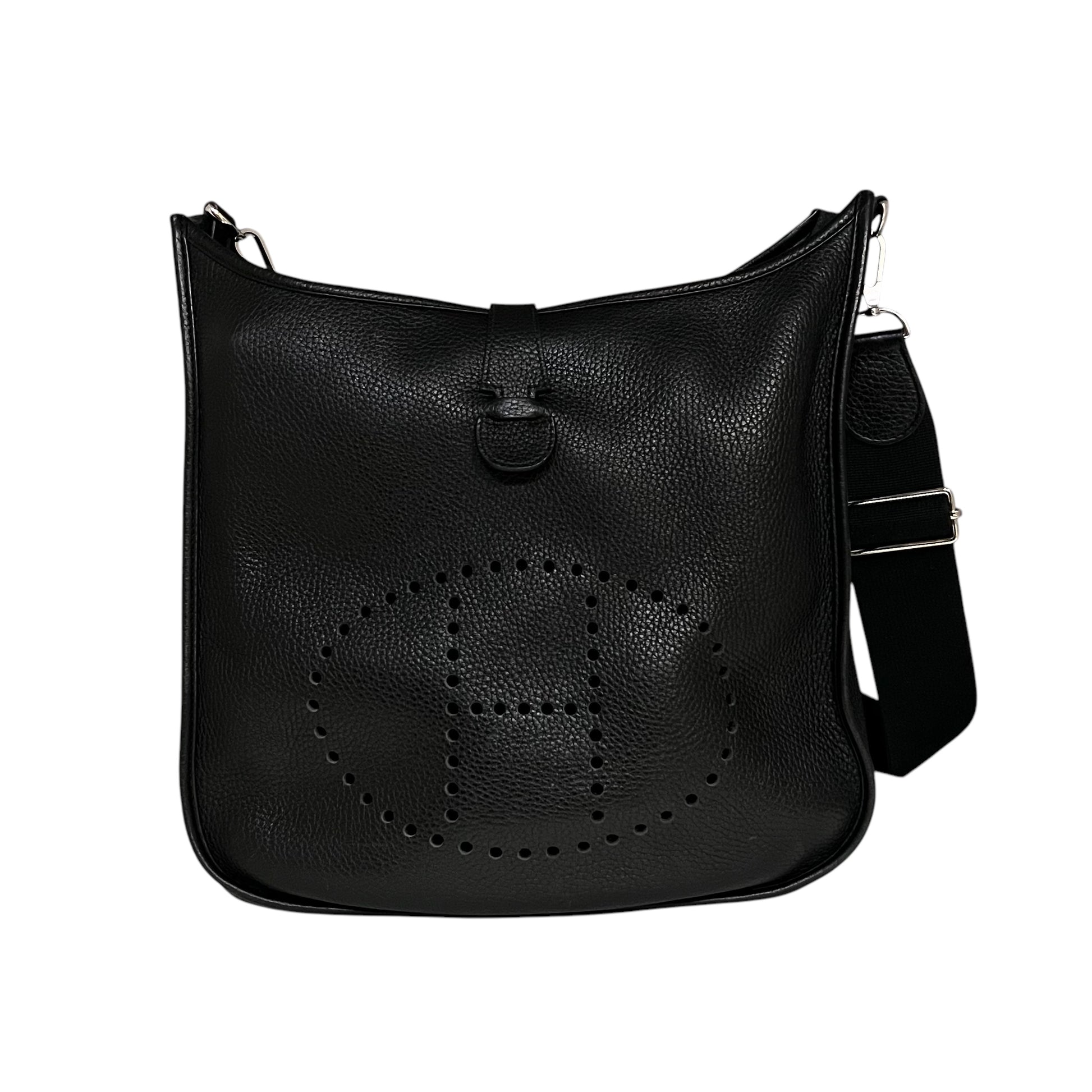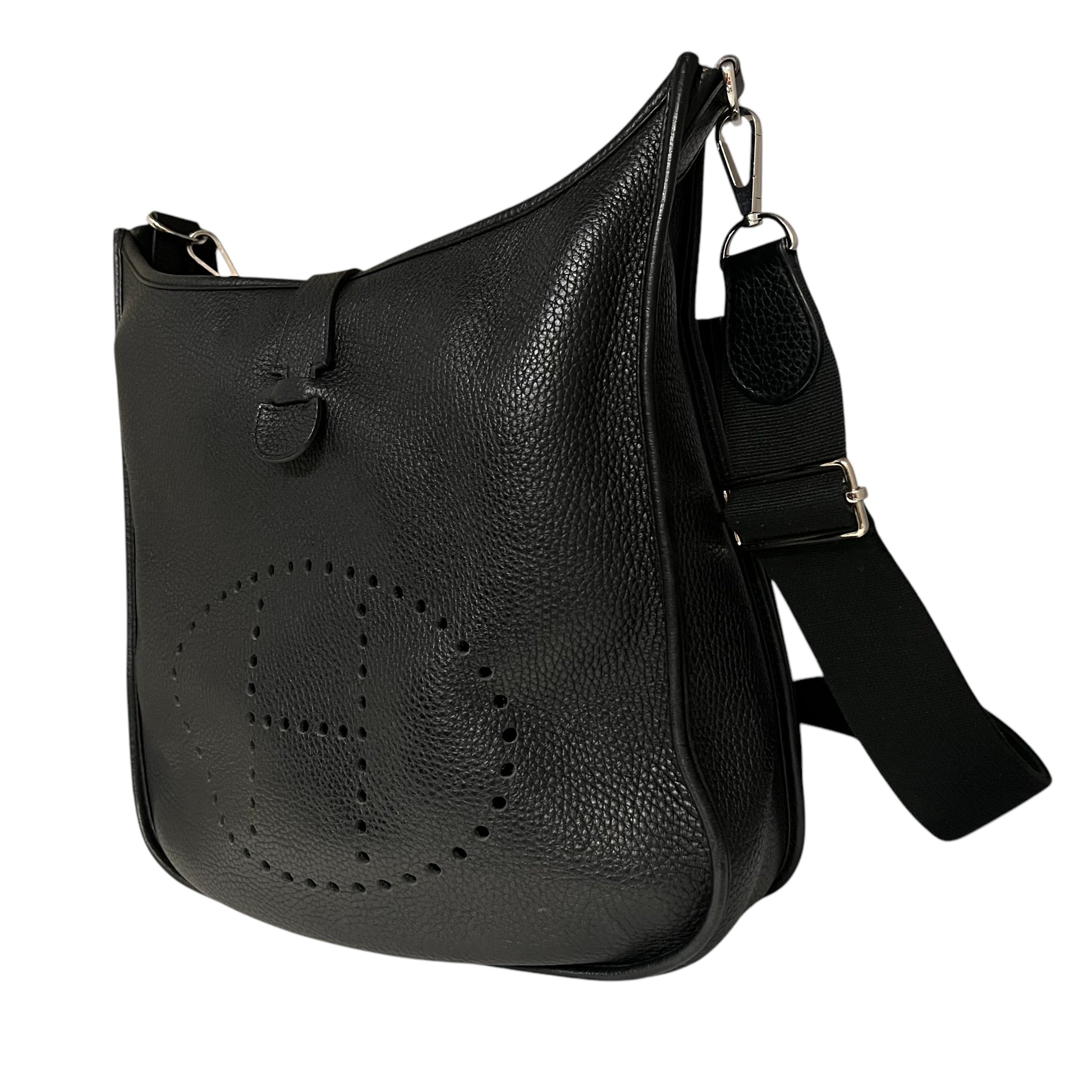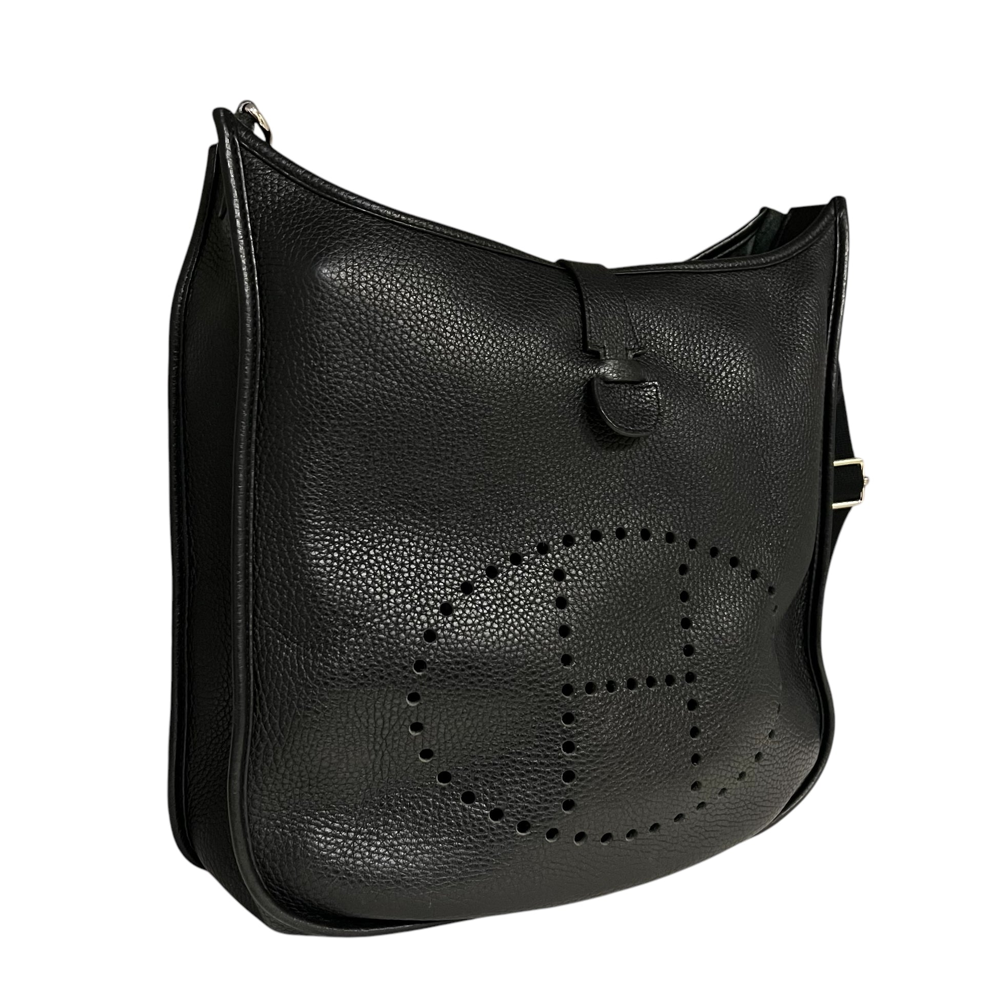 This is an authentic HERMES Evelyne III 33 in Black Clemence Leather with palladium hardware features an tonal adjustable, removable crossbody shoulder strap, pull tab snap closure and suede interior lining.