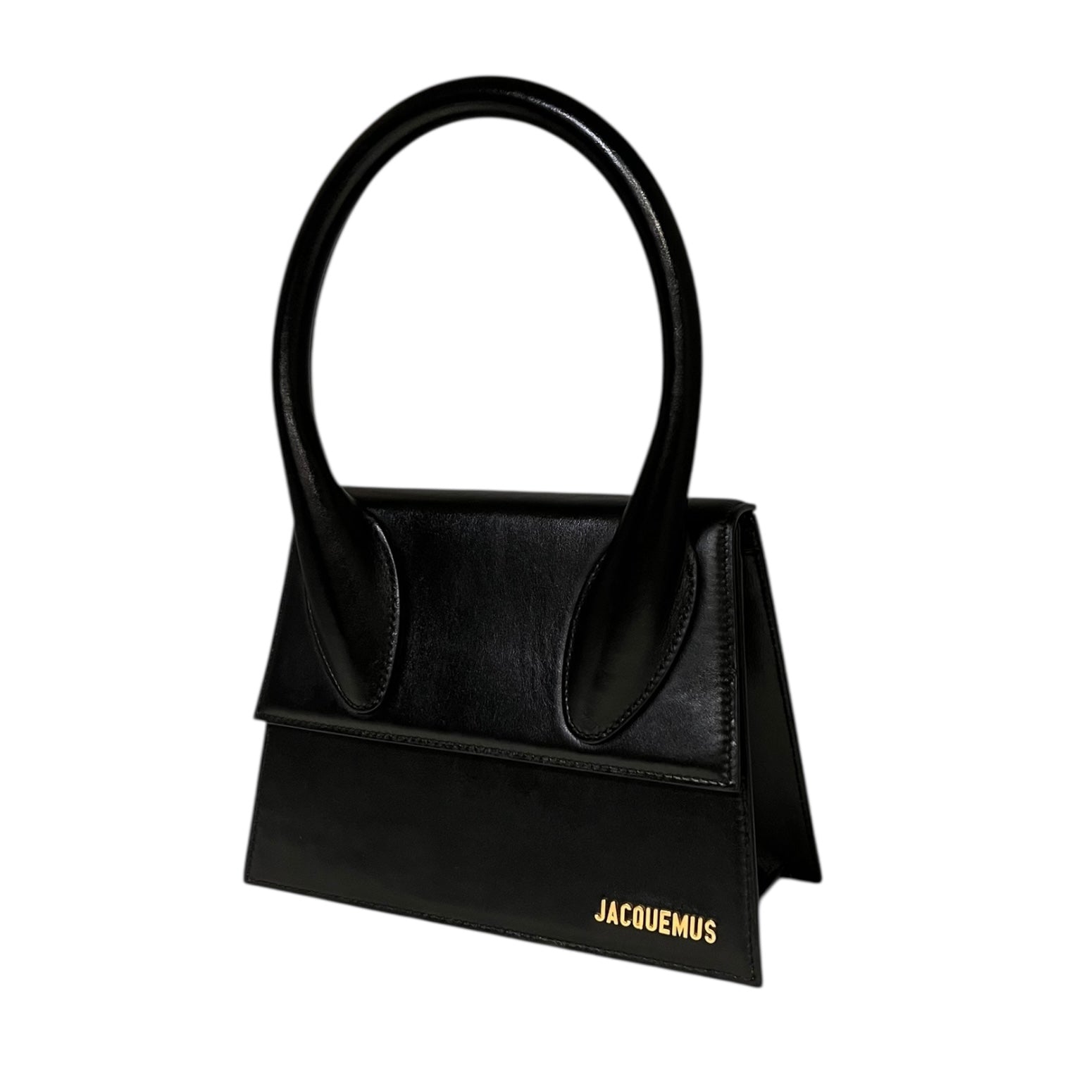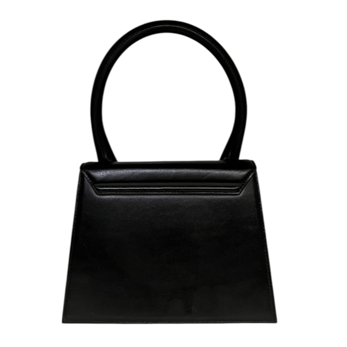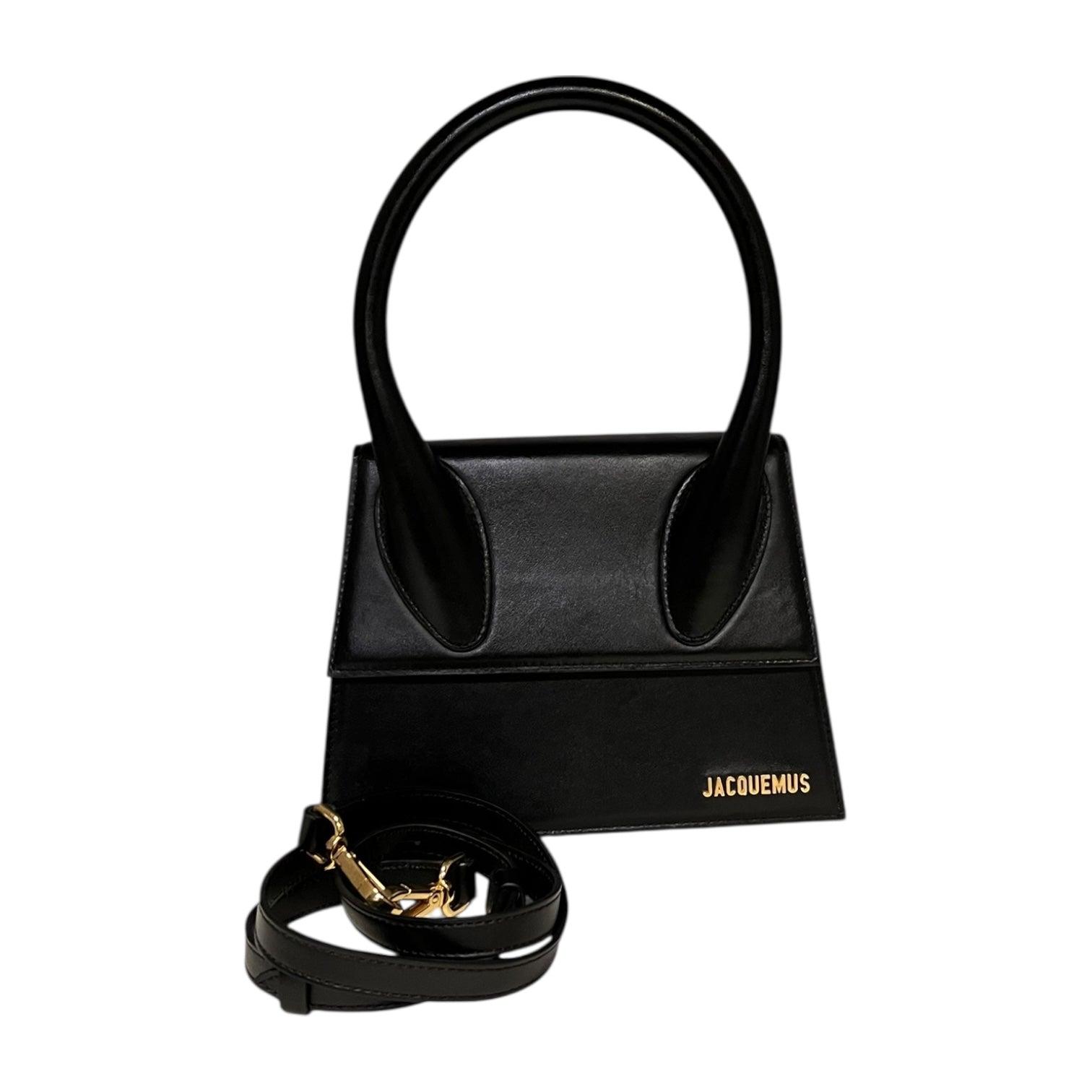 This authentic JACQUEMUS Le Grand Chiquito Top Handle Crossbody in black leather with gold toned hardware features a tubular top handle, a detachable cross body strap, a flap top with snap closure, and interior cotton lining.