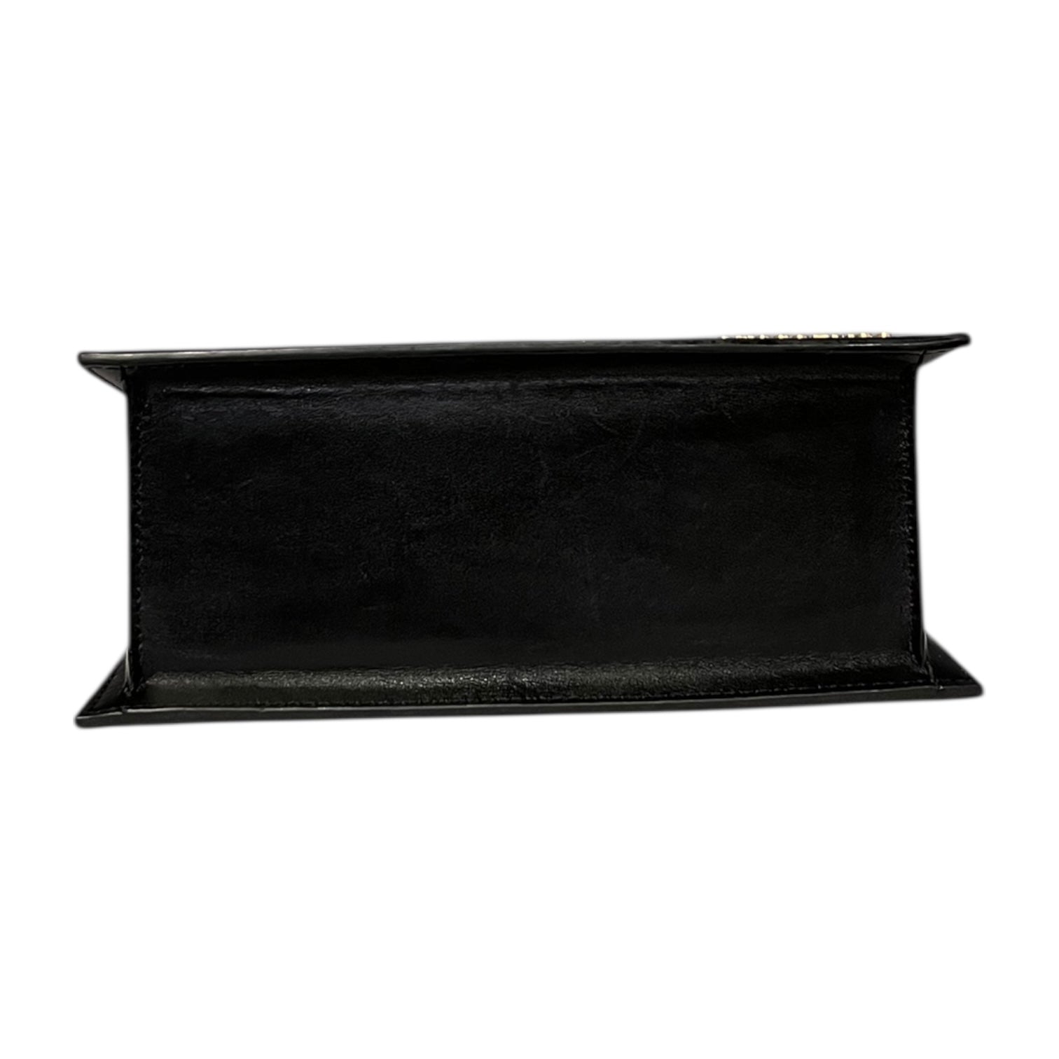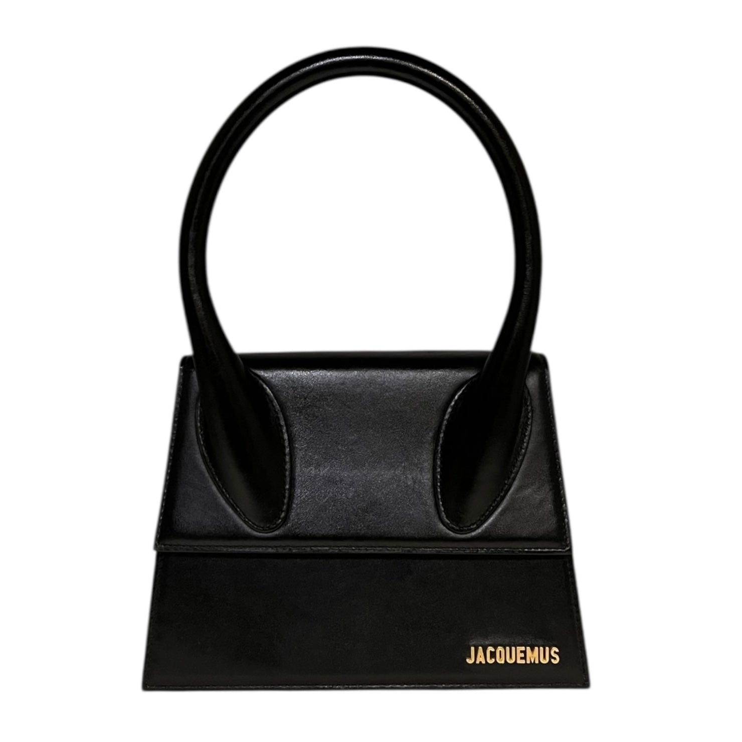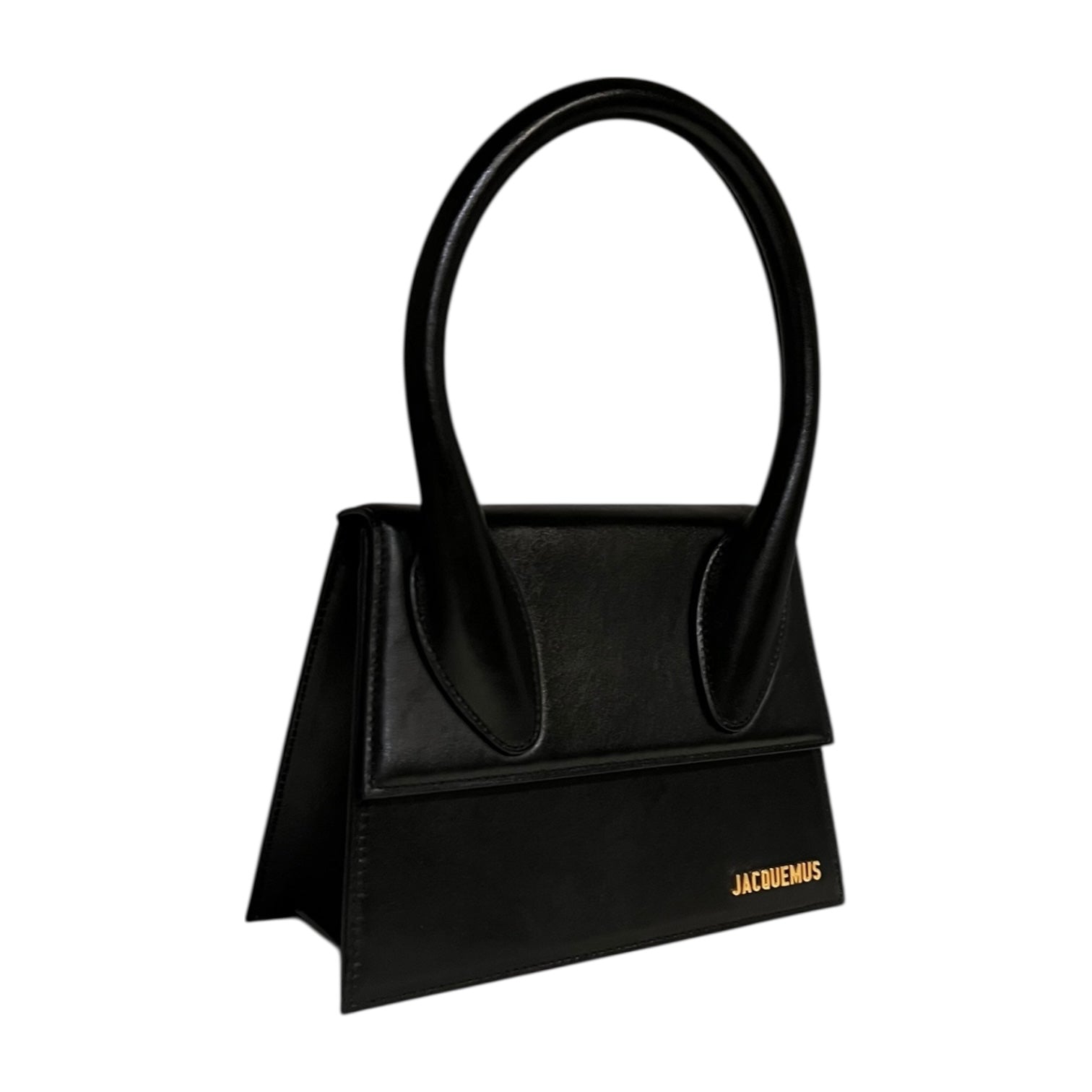 This authentic JACQUEMUS Le Grand Chiquito Top Handle Crossbody in black leather with gold toned hardware features a tubular top handle, a detachable cross body strap, a flap top with snap closure, and interior cotton lining.