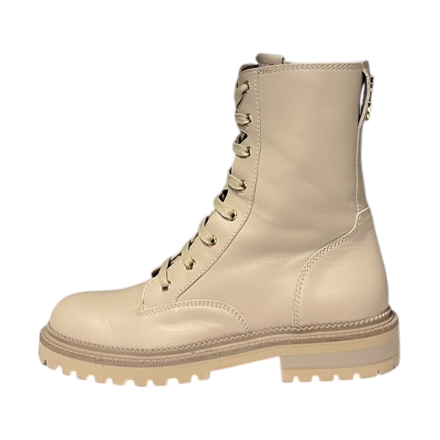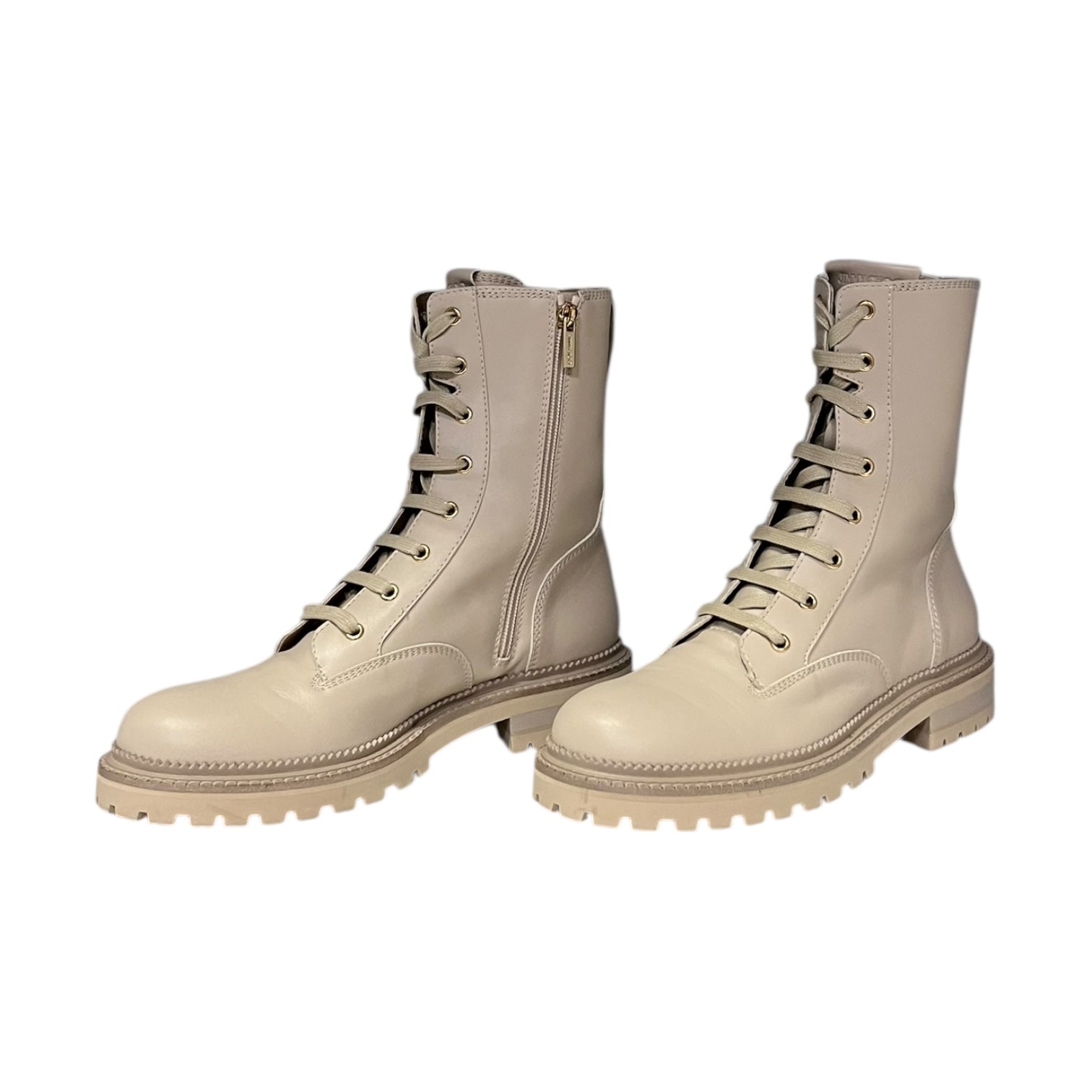 These are an authentic pair of JIMMY CHOO Flat Combat Boots in Light Sand featuring a lace and zip up closure, and soft gold hardware.