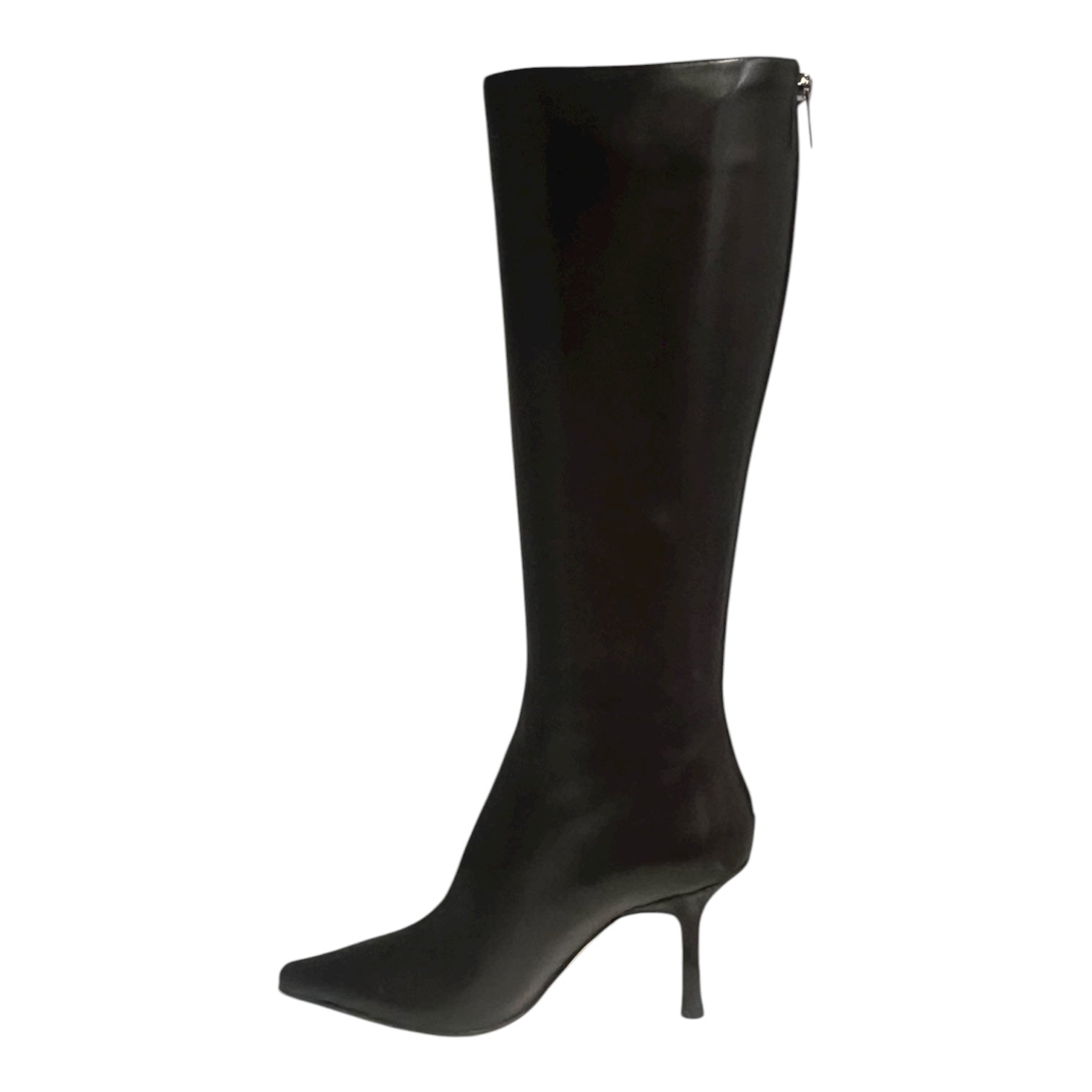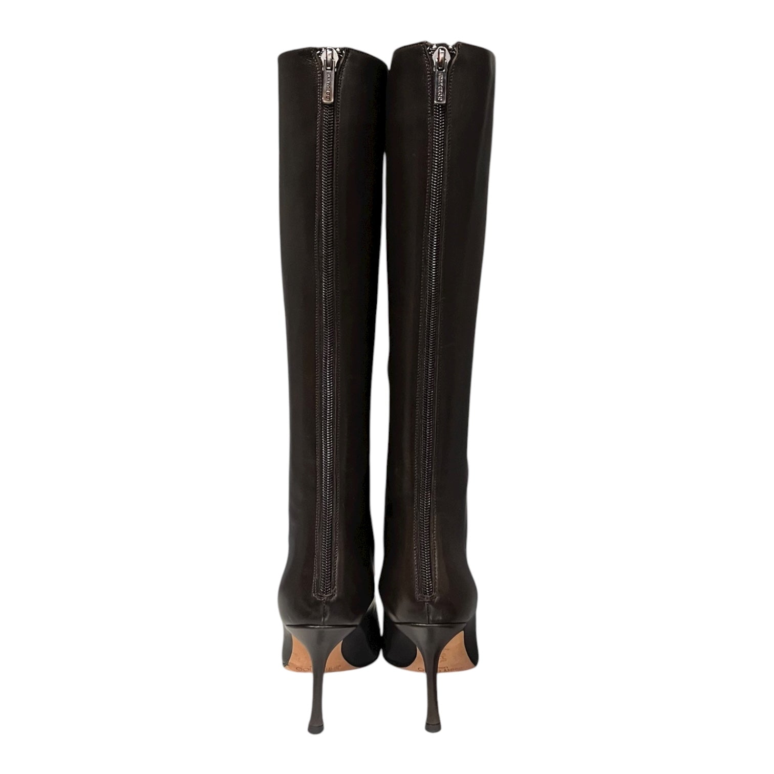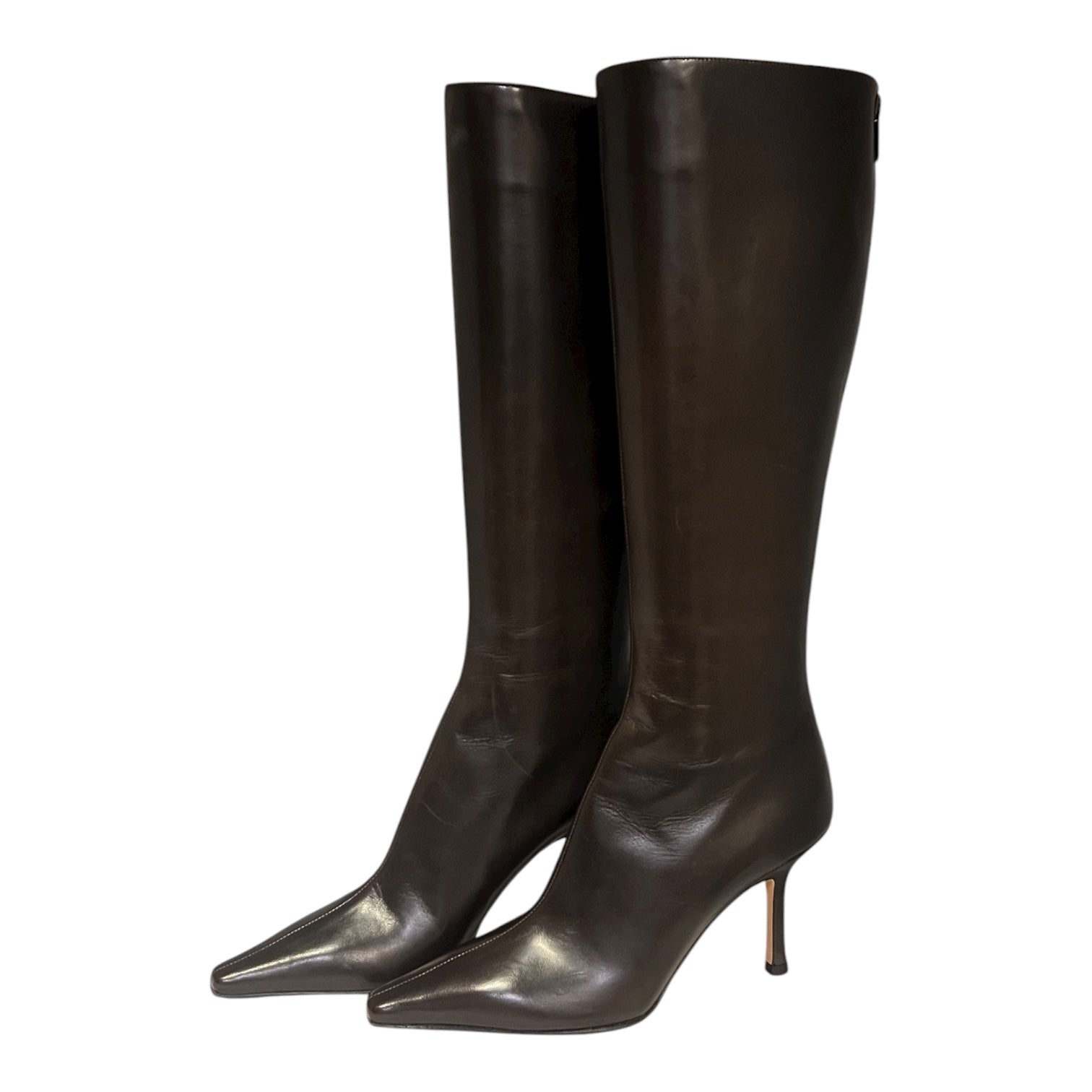 These are an authentic pair of JIMMY CHOO Flat Knee Boots in dark brown leather feature a pointed toe, three inch heel, and a tonal zipper closure with a gunmetal pull.