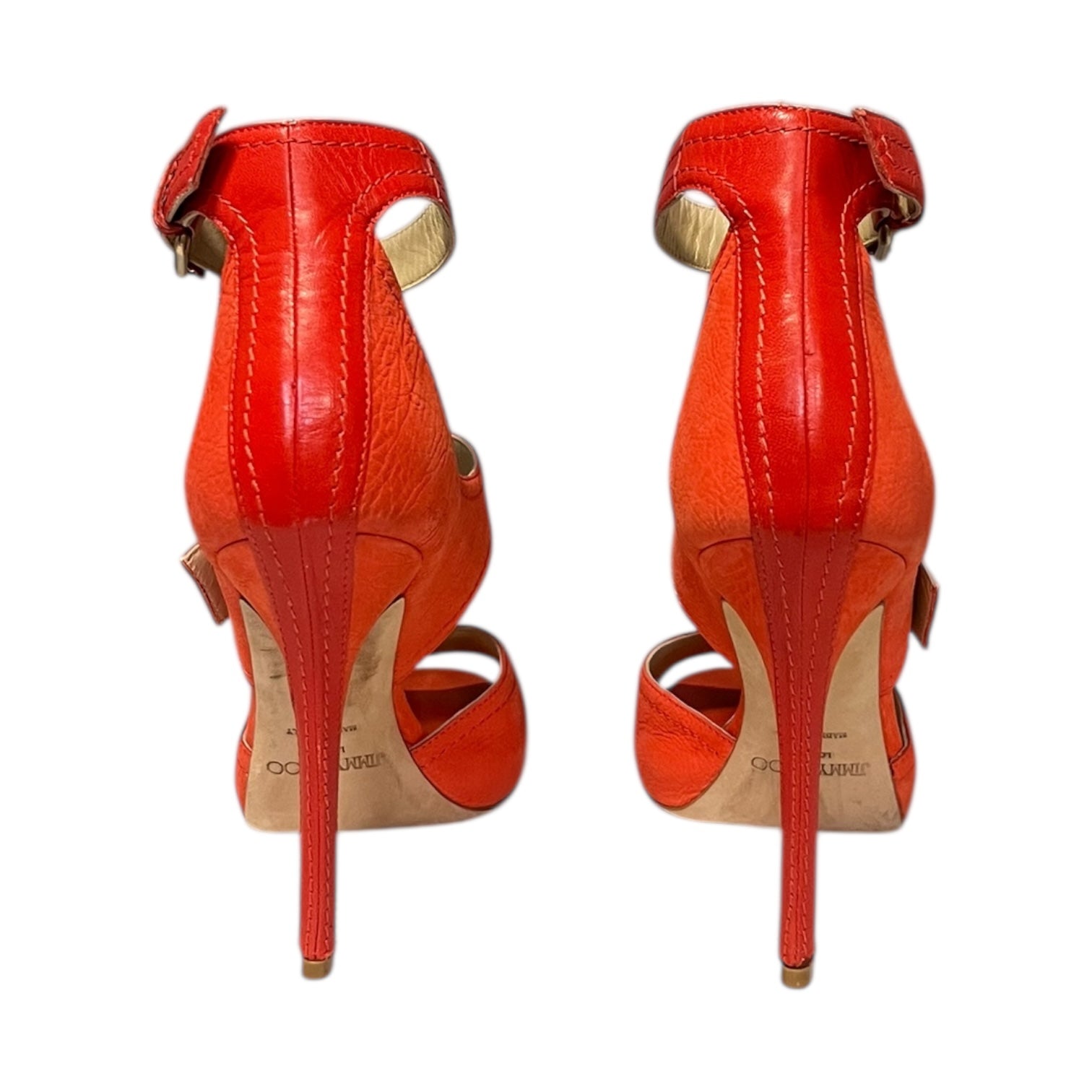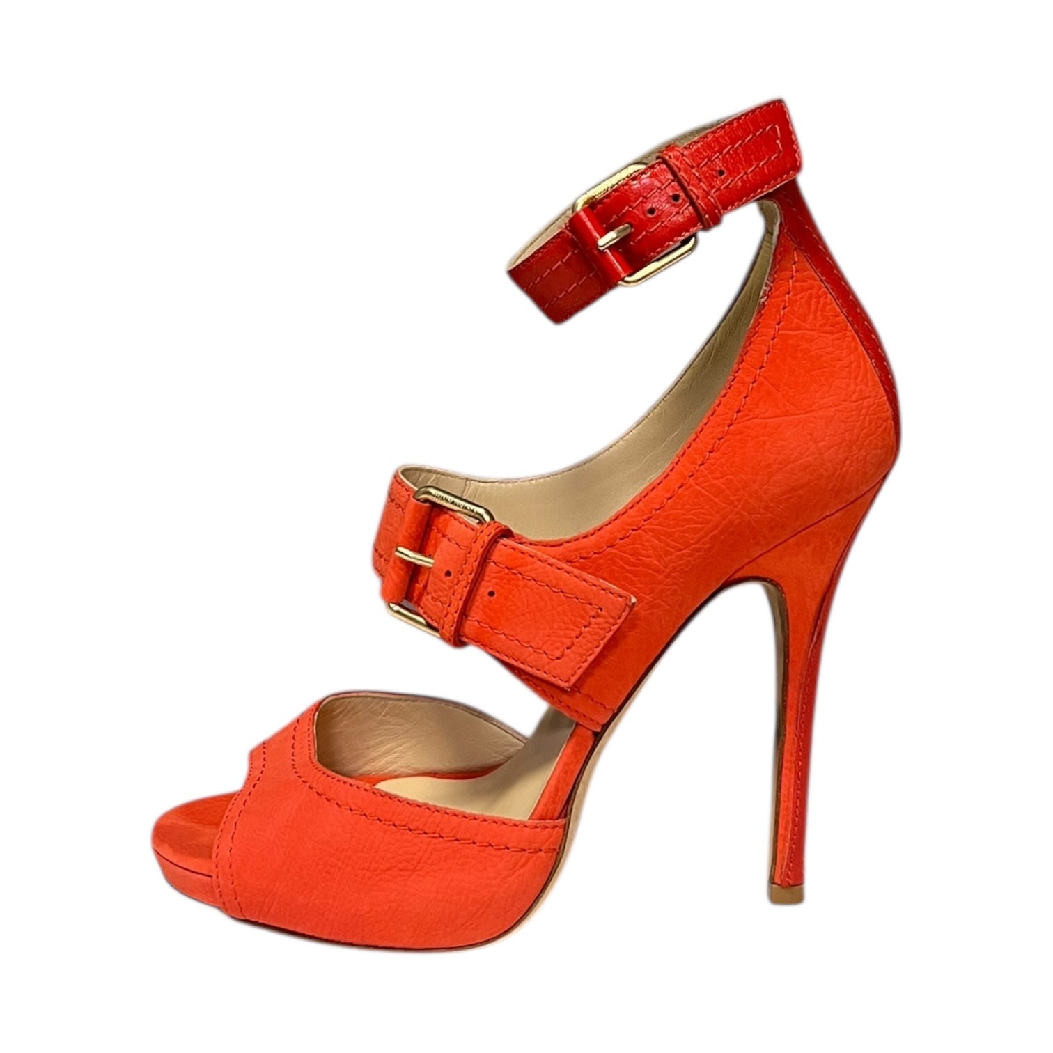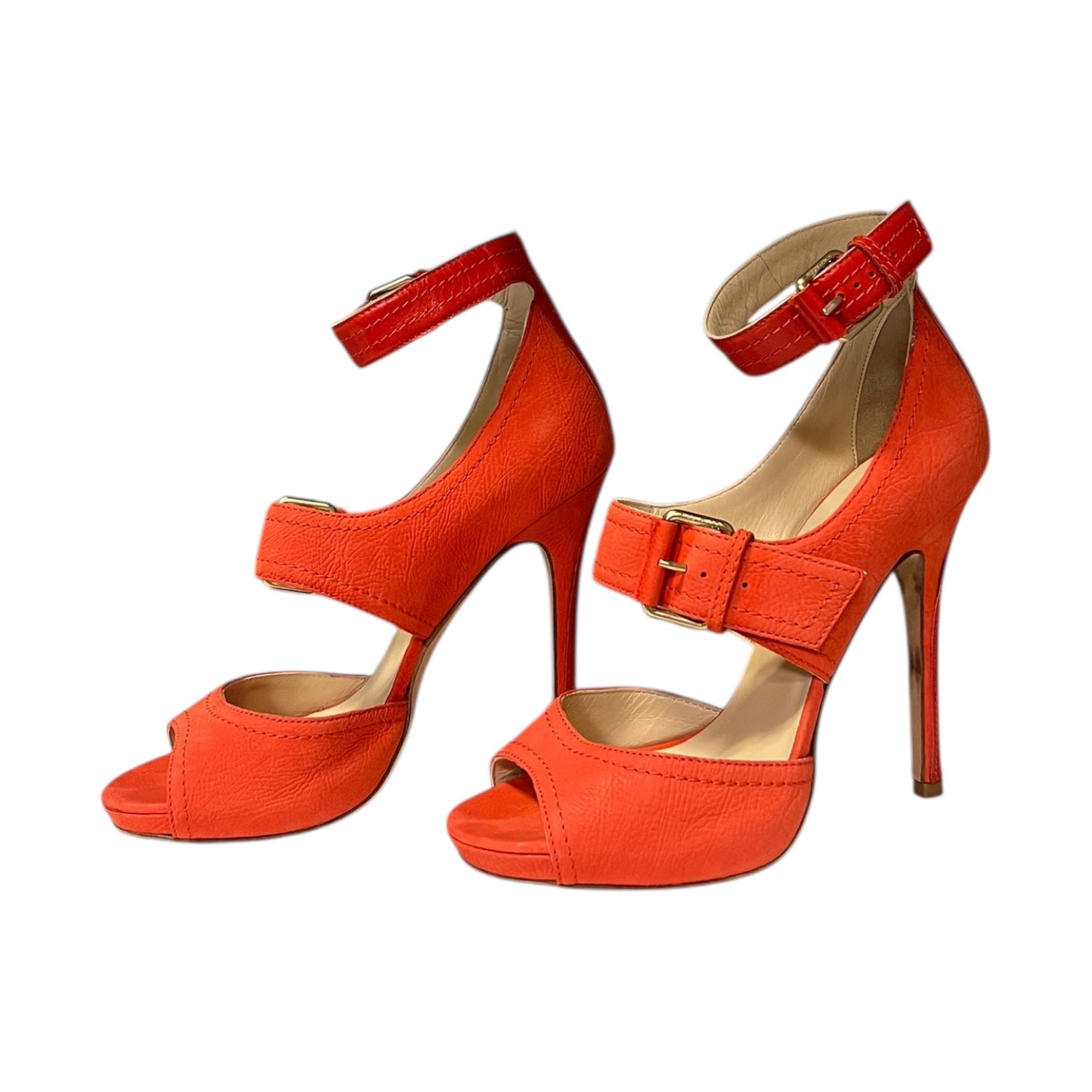 This is an authentic pair of JIMMY CHOO Leona Sandals in coral textured leather with dark coral leather trim and gold toned hardware features a double buckle closure and a 4.5 inch heel with a .5 inch platform.