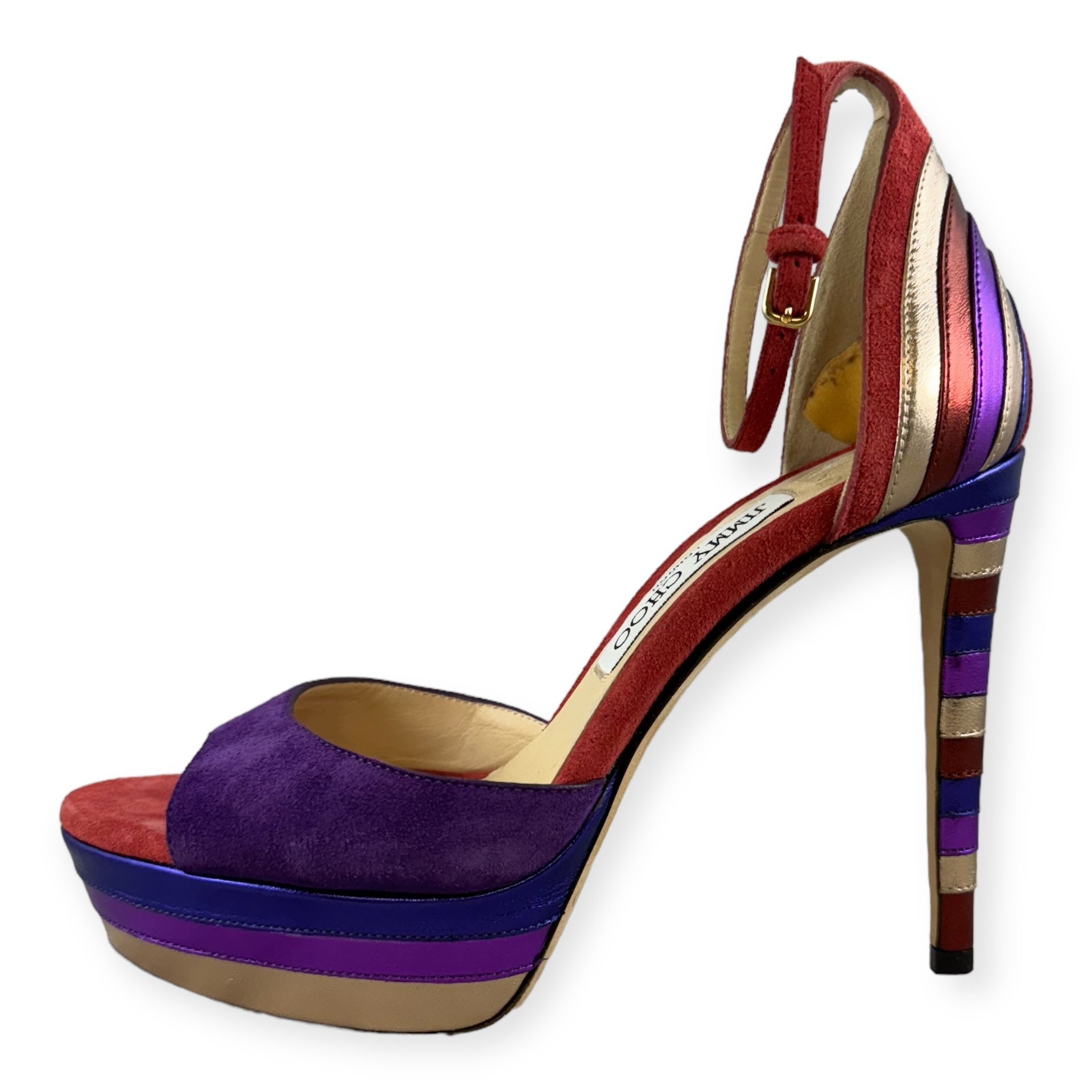 This is an authentic pair of JIMMY CHOO METALLIC Stripe Sandals in Purple Multi. These sandals are crafted of suede and leather with soft gold-toned hardware. They feature an almond toe, a 1 inch platform, a 4.75 inch heel, and an ankle buckle closure.